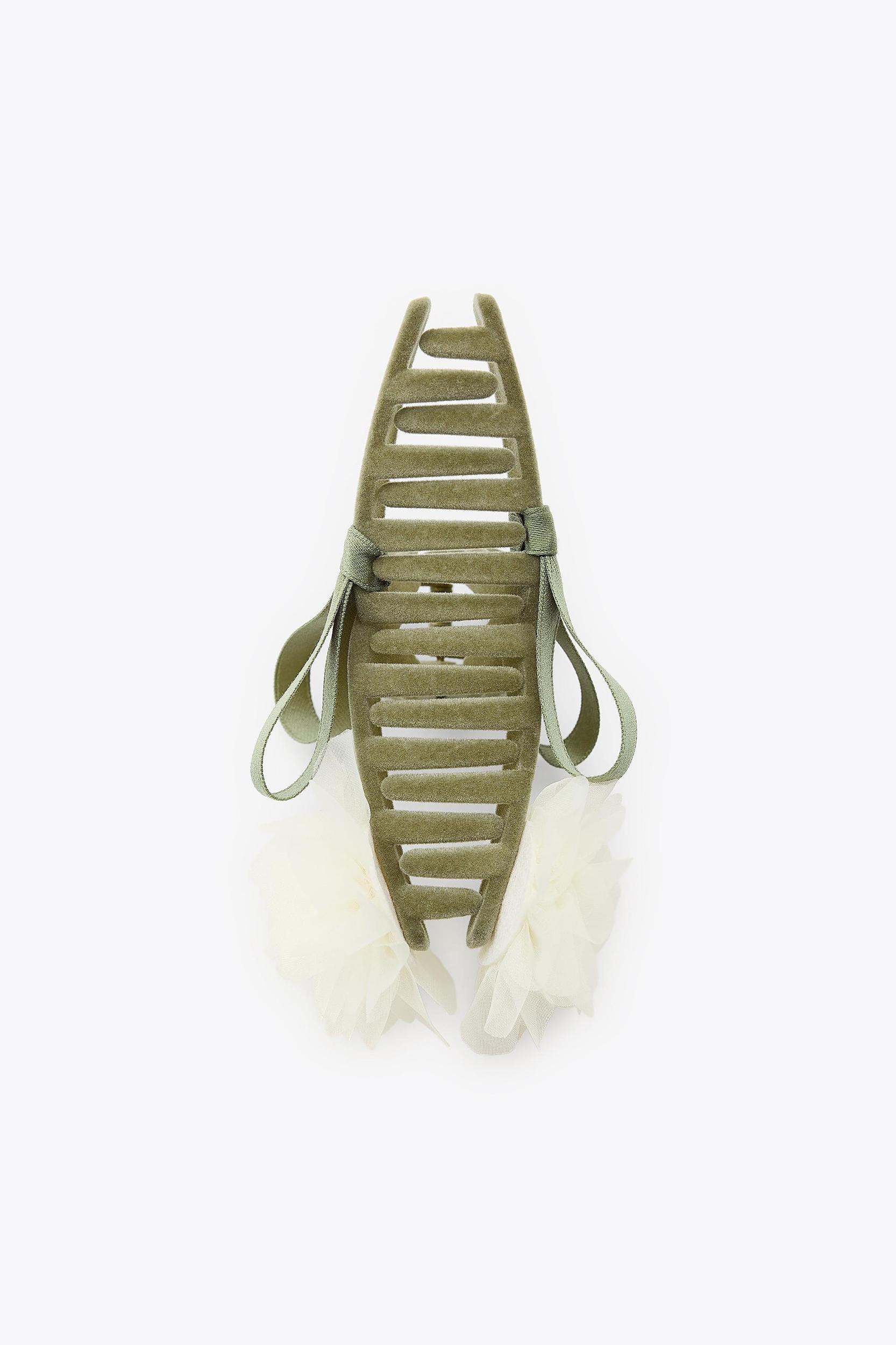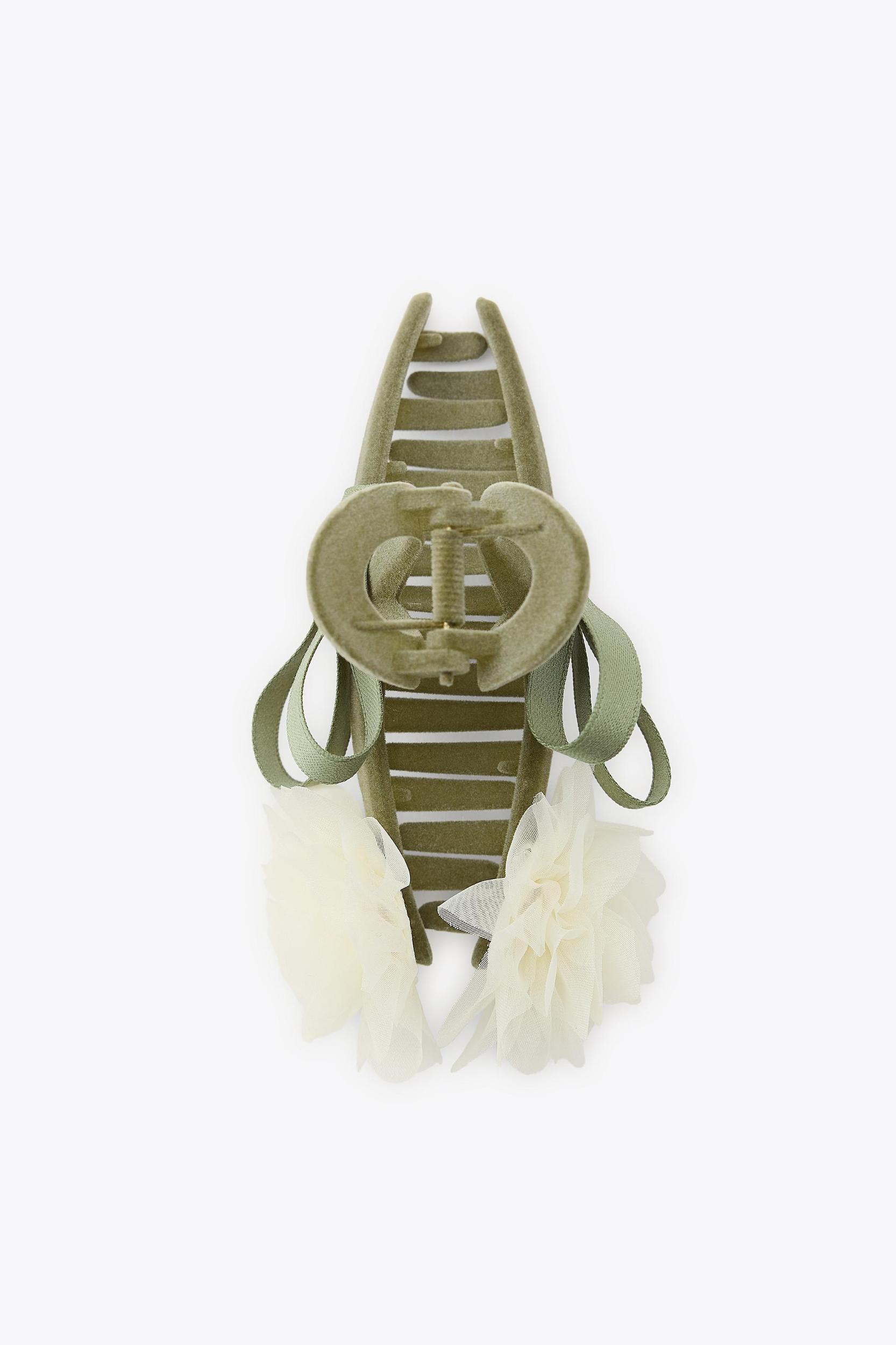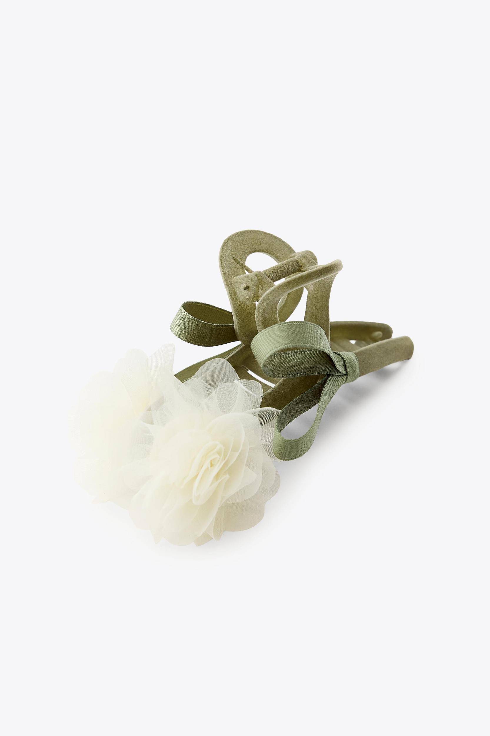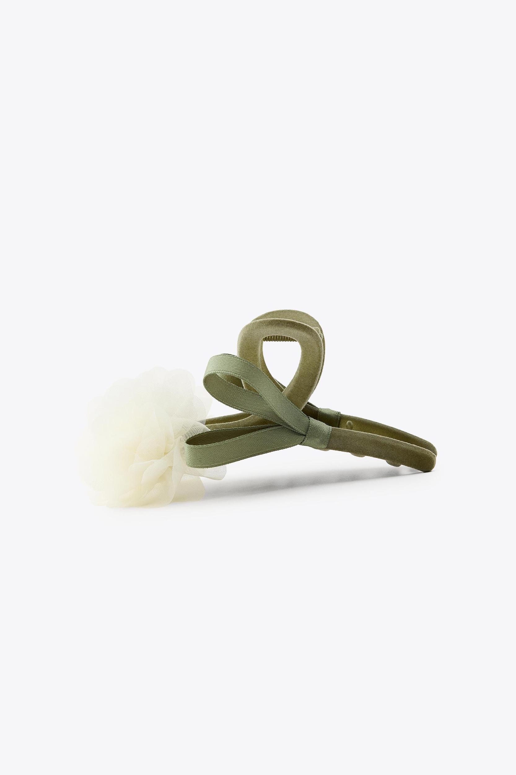 Velvet covered hair clip. Matching satin bow detail and contrasting organza flower appliqué.