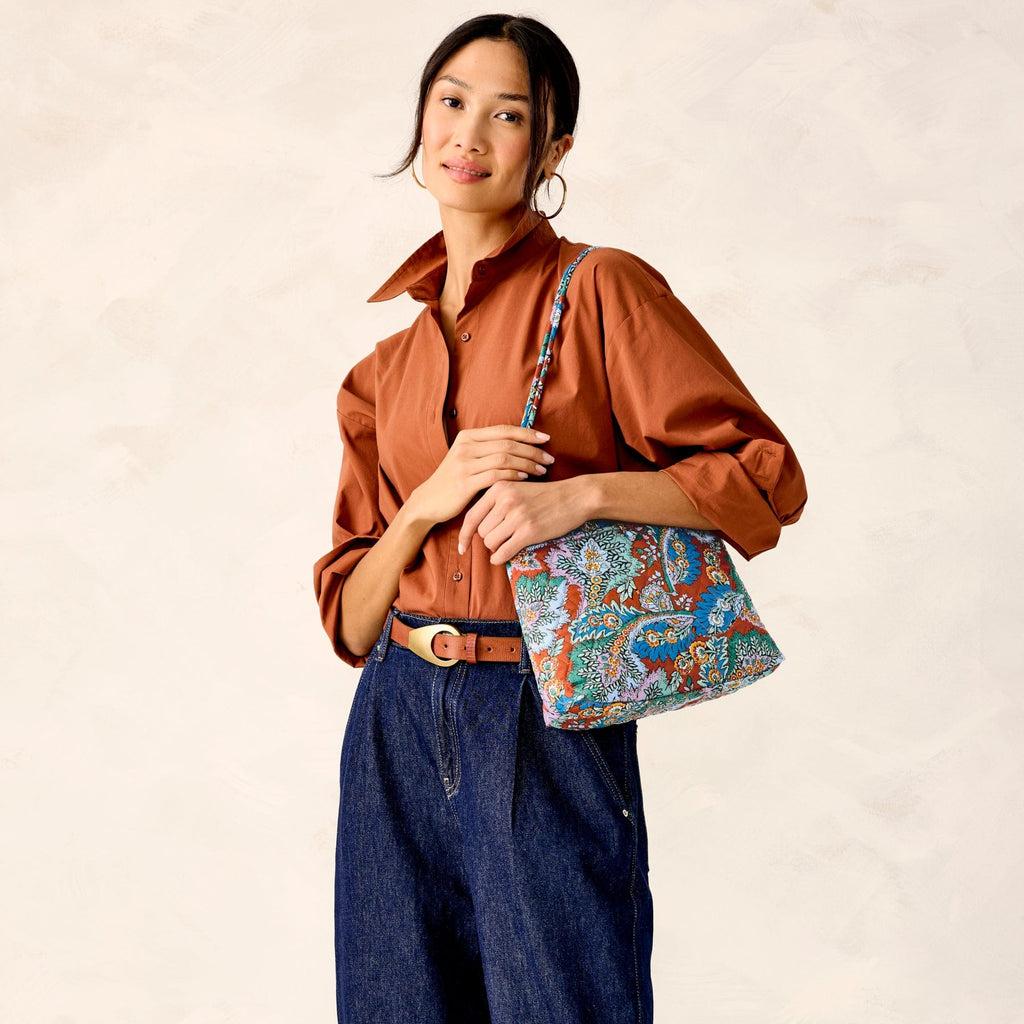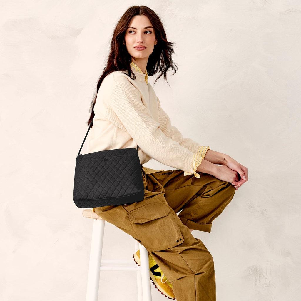 This versatile bag offers a timeless and classic design that complements any outfit, making it the perfect accessory. Features three pockets.
