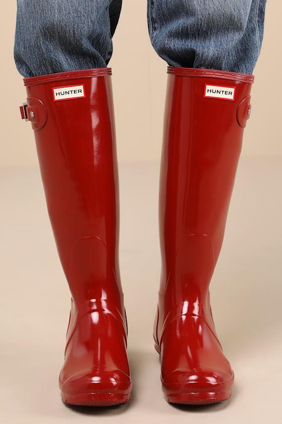 Stormy days don't stand a chance against the Hunter Original Tall Military Red Glossy Rain Boots! Ultra-durable, vulcanized natural rubber (with a glossy finish) shapes these coveted rain boots with a rounded upper that rises to a 15" knee-high shaft with a 15.25" circumference. The effortless slip-on design features a decorative silver buckle detail at the outstep, while a sturdy low-block heel completes the look. Logo tag at the front and sole. Available in whole sizes only.
