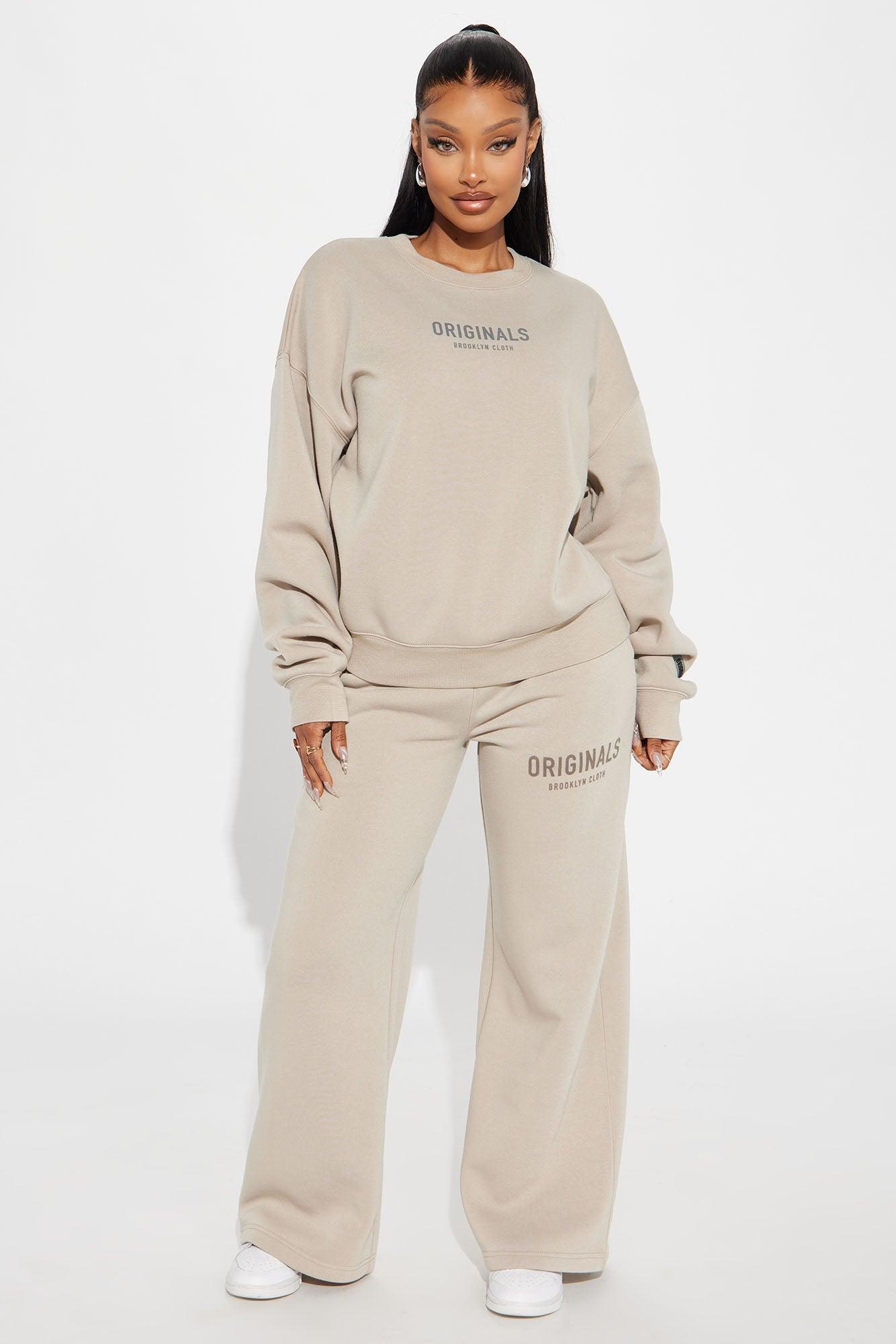 Available In Black And Stone. Crew Neck Sweatshirt Long Sleeve Front And Back Screen Patches Detail Stretch Pair To Originals Wide Leg Pants 100% Polyester Imported