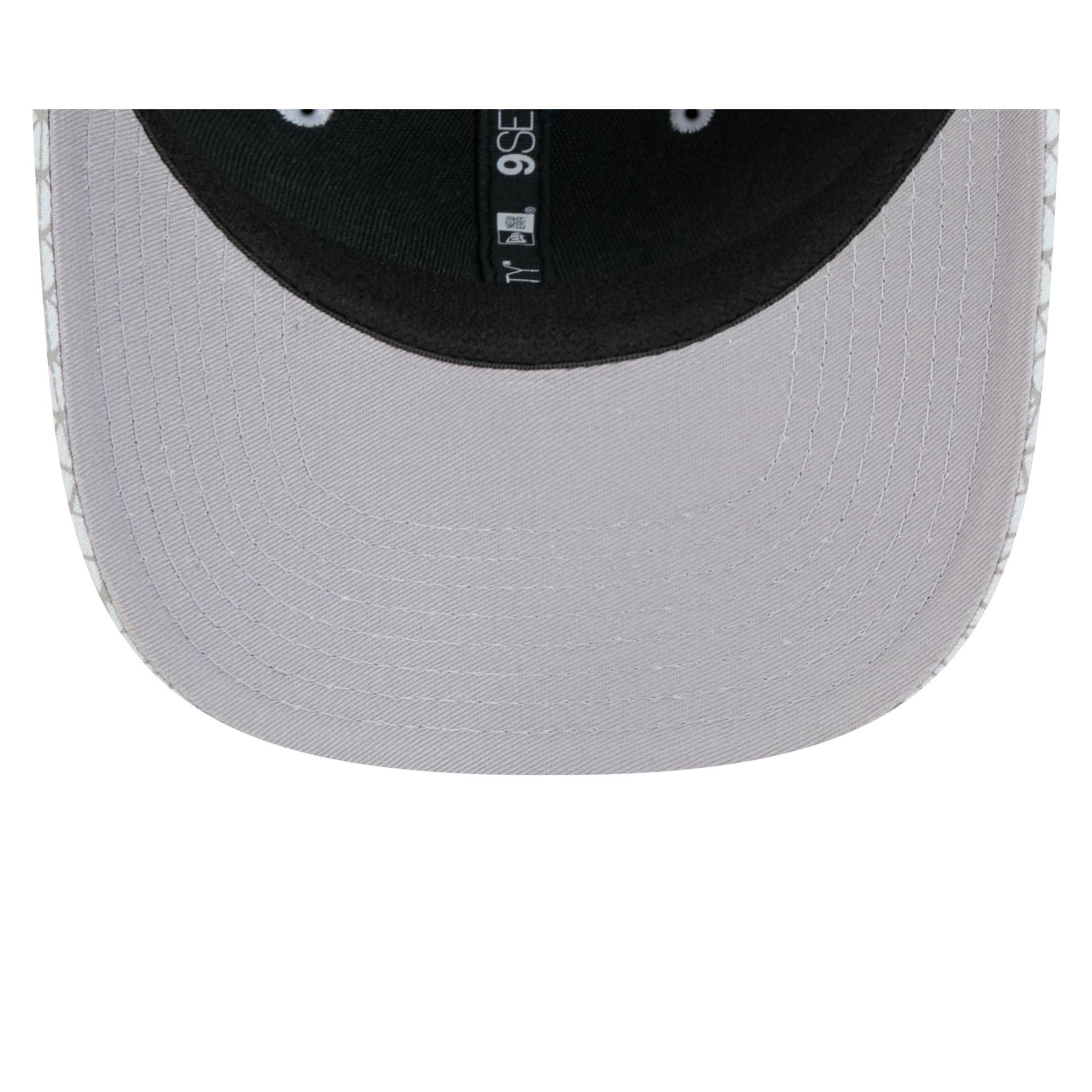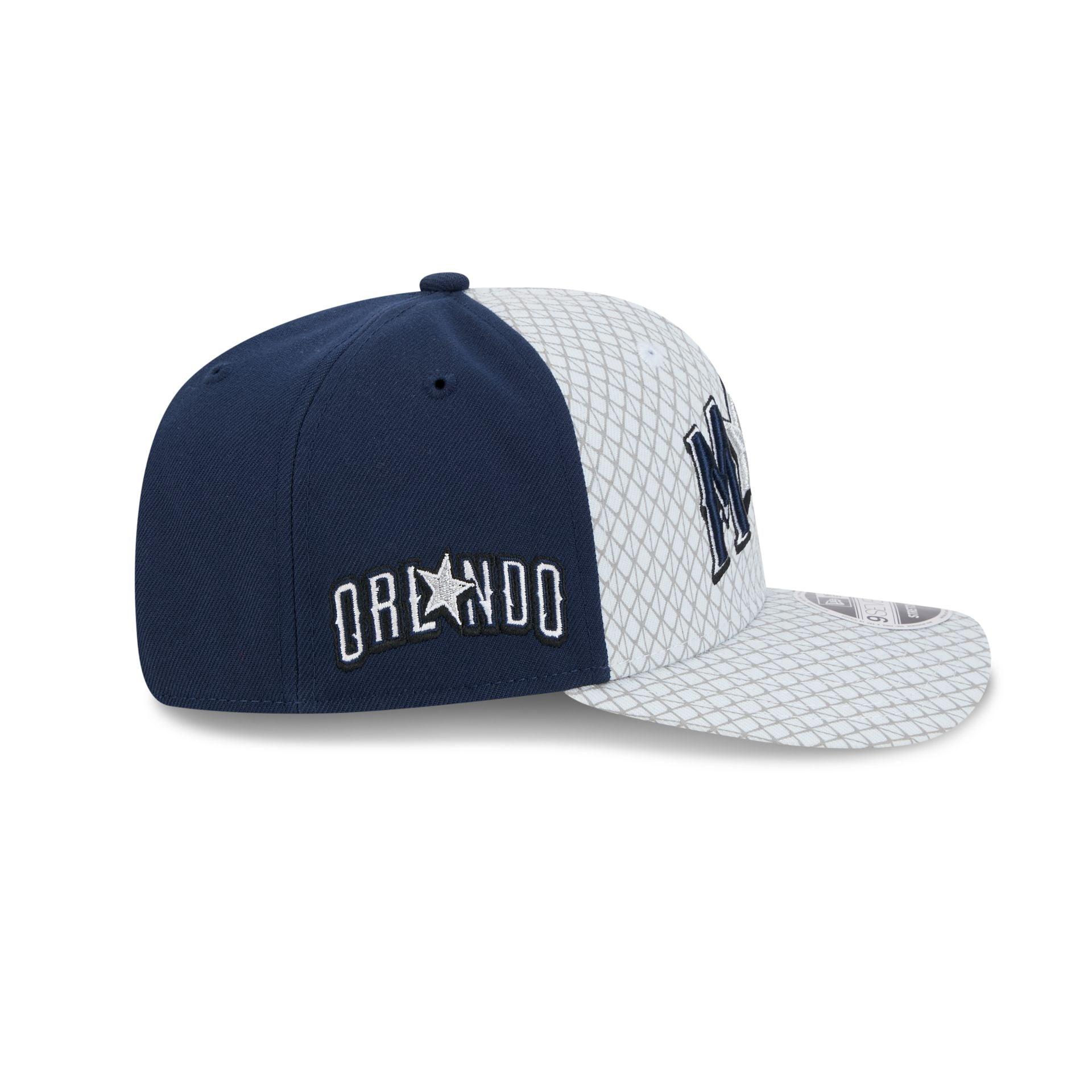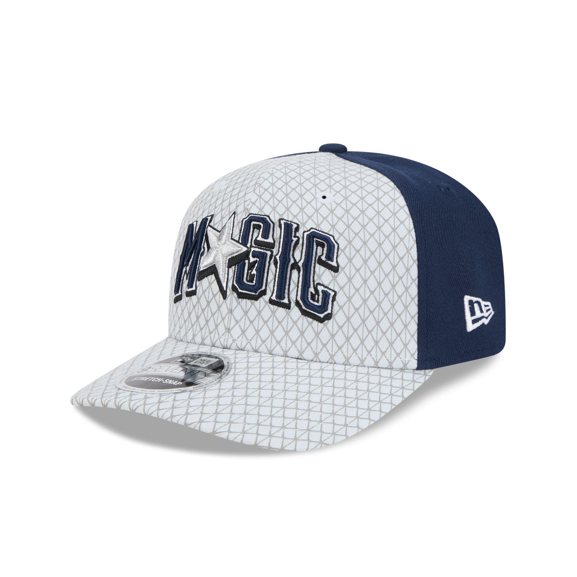 The Orlando Magic 2024 City Edition 9SEVENTY Stretch-Snap Cap features an embroidered Magic wordmark at the front panels with an NBA Logoman above a snapback closure at the rear. Additional details include an Orlando patch at the right-wear side and a gray undervisor.