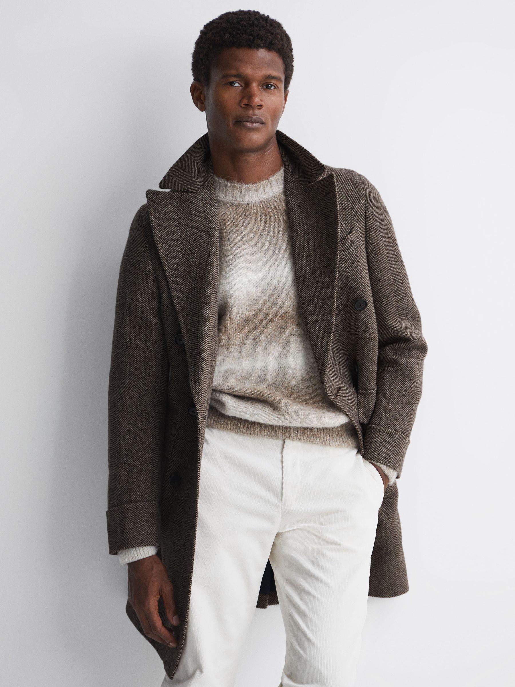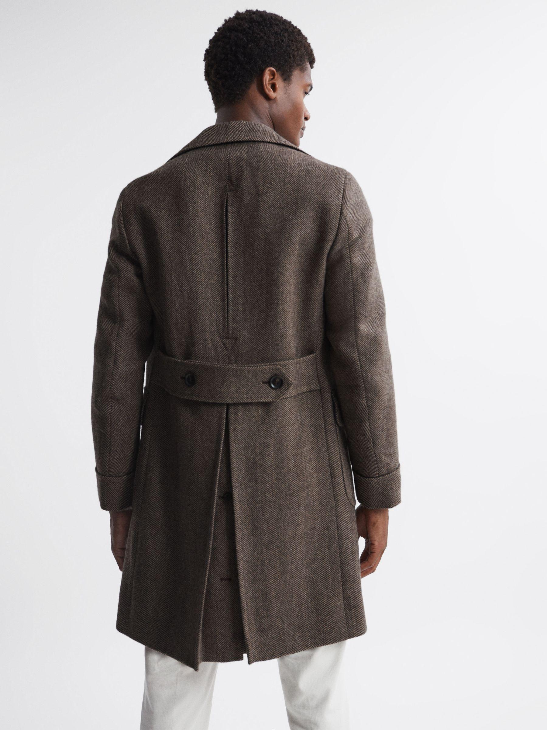 Oscar Jacobson, curated by Reiss, is an established range of men’s formalwear designed in Sweden and sewn in Europe, to be enjoyed for all of life’s occasions. The dark brown Salas coat is woven from 100% wool into a herringbone design, offering a premium texture and appearance to your everyday edits. Its double-breasted shape secures with six buttons to the front, and a buttoned belt and vent are added to the reverse to refine your finished looks. 100% wool Herringbone design Double breasted Peak lapels Six-button fastening Flap pockets Long sleeves Double cuffs Box pleat to reverse Buttoned vent to reverse Buttoned belt to reverse Internal pockets Lined The model is wearing a size M Measurements of model: Height 6ft 2.5 / 189cm.