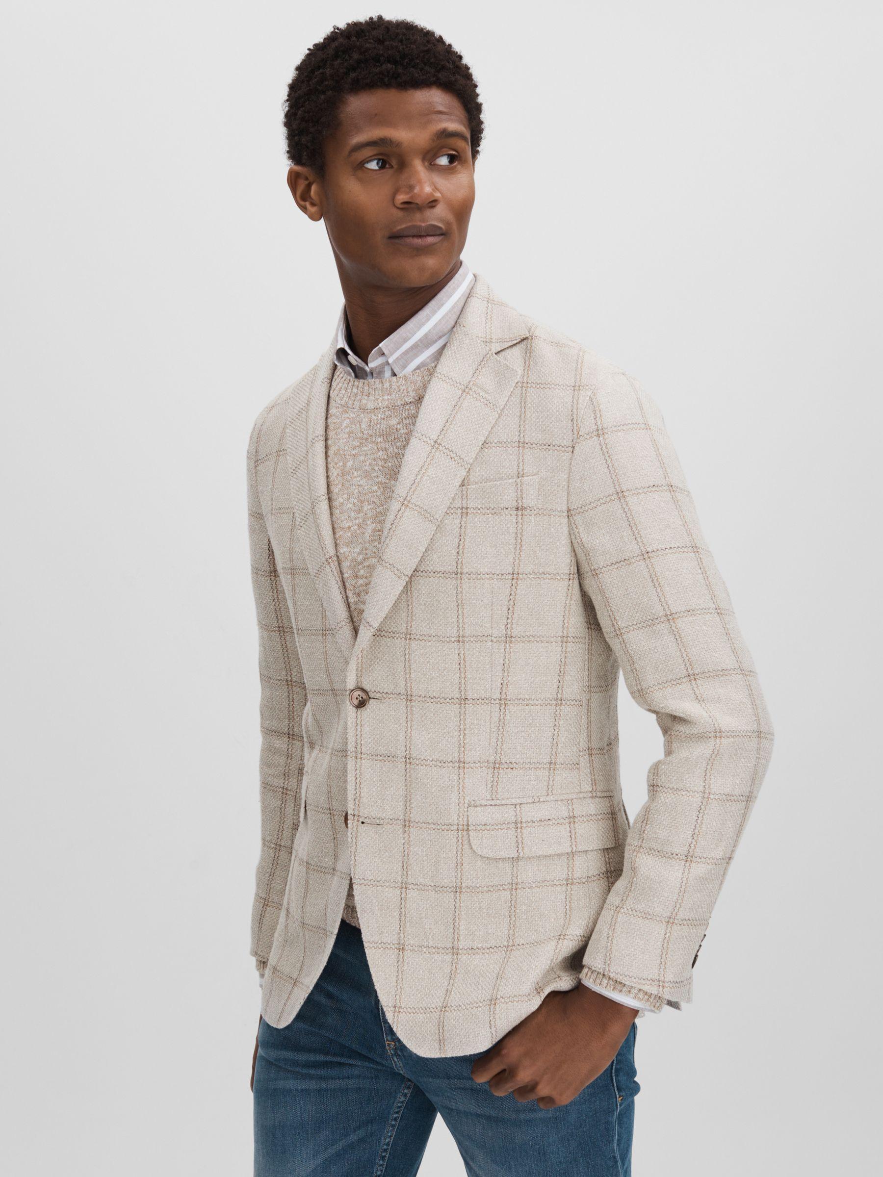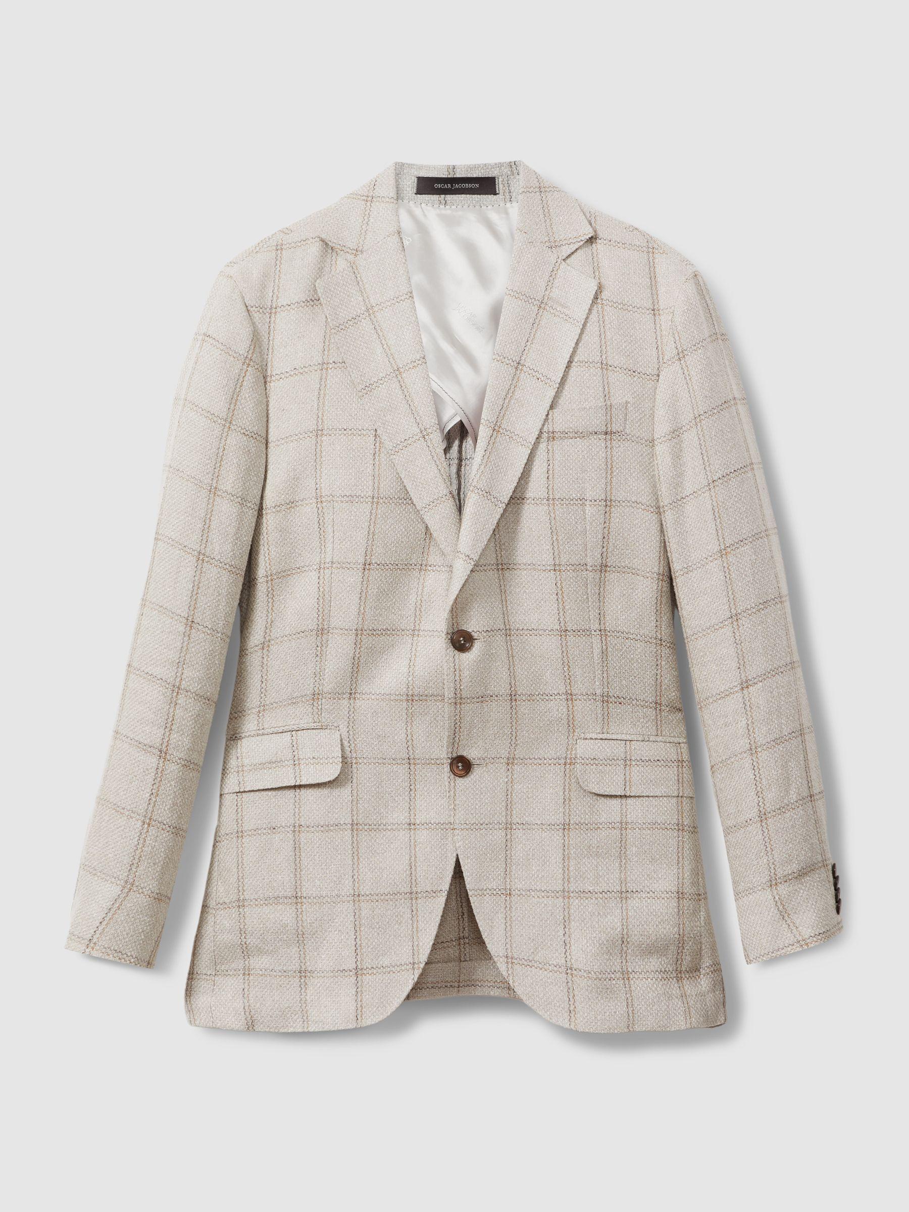 This single-breasted blazer is made from a blend of linen, silk, and cotton for enhanced softness and a woven texture. It’s arranged with a subtle check design and sleek buggy lining. Linen-silk-cotton blend. Check design. Single breasted. Buggy lining. Dual vents to reverse Oscar Jacobson, curated by Reiss, is an established range of men’s formalwear designed in Sweden and sewn in Europe, to be enjoyed for all of life’s occasions.