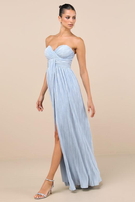 Crafted from glossy plisse satin, this gown was made to swoon over with its flattering sweetheart neckline and strapless, surplice-style bodice. The high, banded waist boasts sash-like detail at the center that flows into the stunning maxi skirt with an alluring side slit for effortless movement. Hidden no-slip strips and back zipper/clasp.