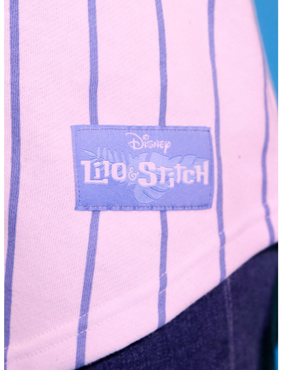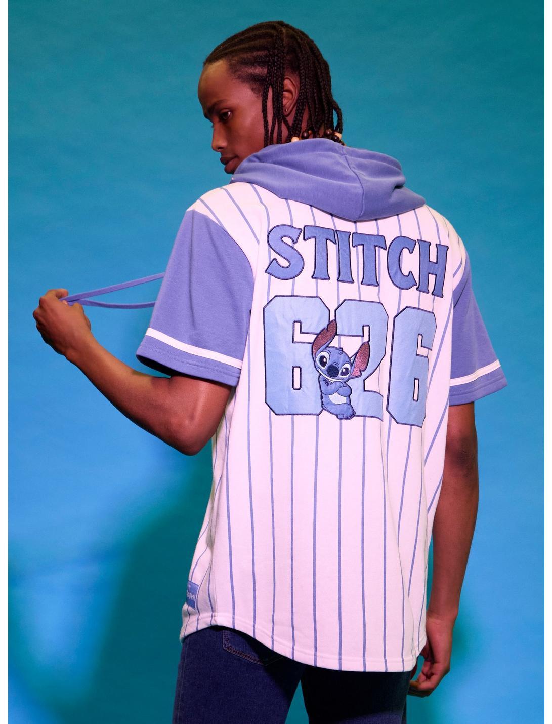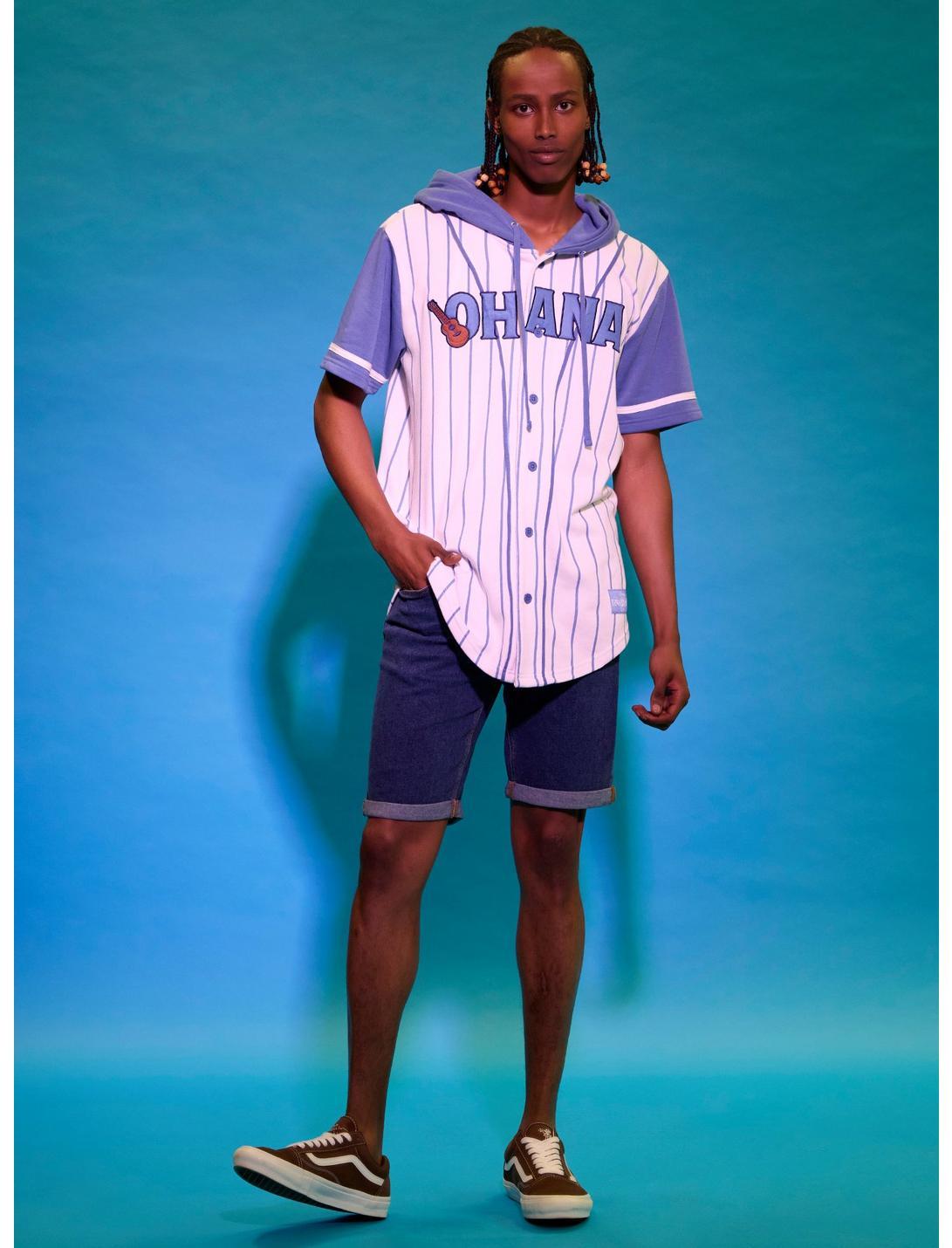 Knock your look out of the park with this Lilo & Stitch hooded baseball jersey! Featuring classic blue pinstripes and "Ohana" embroidered across the chest with a ukulele. Peep the back for Stitch leaning against "Stitch 626." Comes with snap-buttons and a drawstring hood.60% cotton; 40% polyesterWash cold; dry lowImportedListed in men's/unisex sizesModel wears size Medium