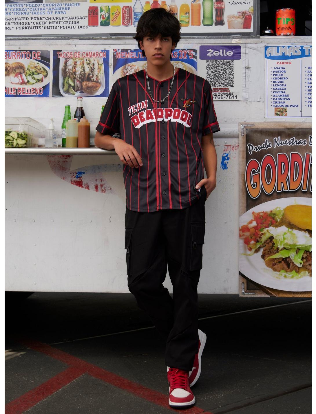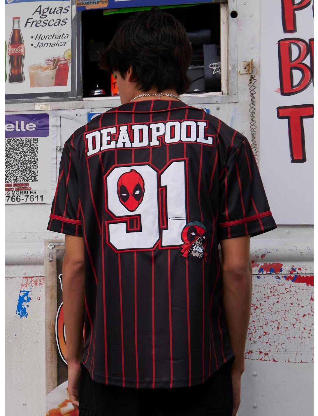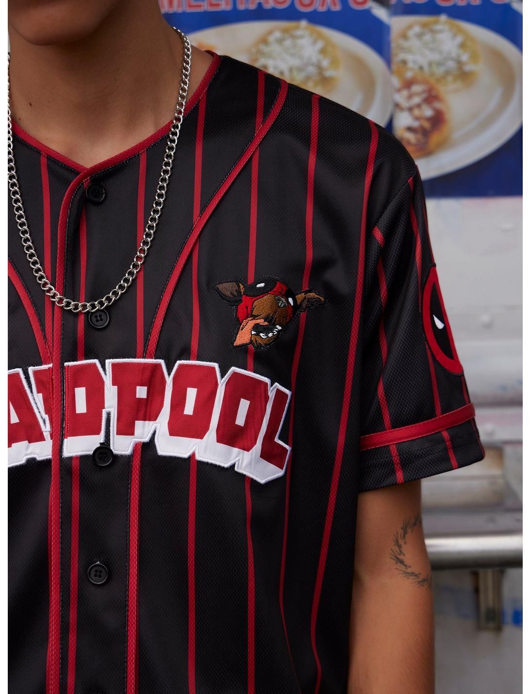 Trade out your katanas for a baseball bat in this Deadpool & Wolverine baseball jersey! Perfect for a sporty heroic look, this black jersey features red pinstripes and "Team Deadpool" embroidered across the chest with an image of Dogpool. His name and "91" are embroidered on the back with more Team Deadpool members.100% polyesterWash cold; dry lowImportedListed in men's/unisex sizesModel wears size Medium