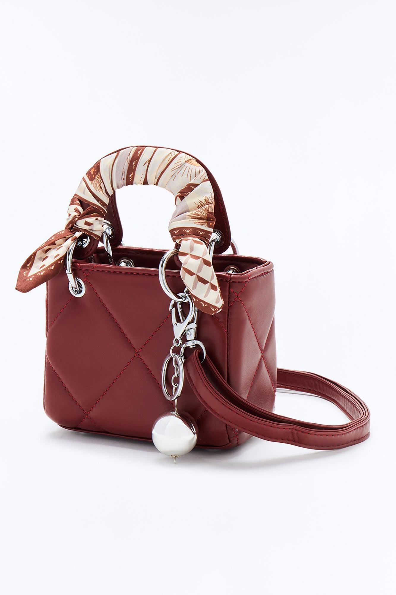Available In Black And Burgundy. Mini Satchel Bag Top Zip Closure Faux Leather Material Quilted Pattern Scarf Handle Detail Dimensions: 5" x 2.5" x 8" Imported California Proposition 65WARNING: Cancer and Reproductive Harm - www.P65Warnings.ca.gov.