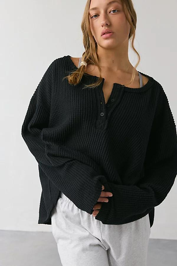 Stylish-meets-cozy Out From Under tee in a so soft waffle knit. The perfect basic long sleeve tee in an oversized fit featuring a scoop neckline with henley buttons, drop-shoulder balloon sleeves and a curved hem. Perfect on its own & layered with a bralette! Find it only at UO. Features Out From Under Living The Dream waffle knit long sleeve henley tee Long sleeve henley shirt Soft waffle knit Wide scoop neckline with henley button placket Drop-shoulder balloon long sleeves Curved hem Oversized