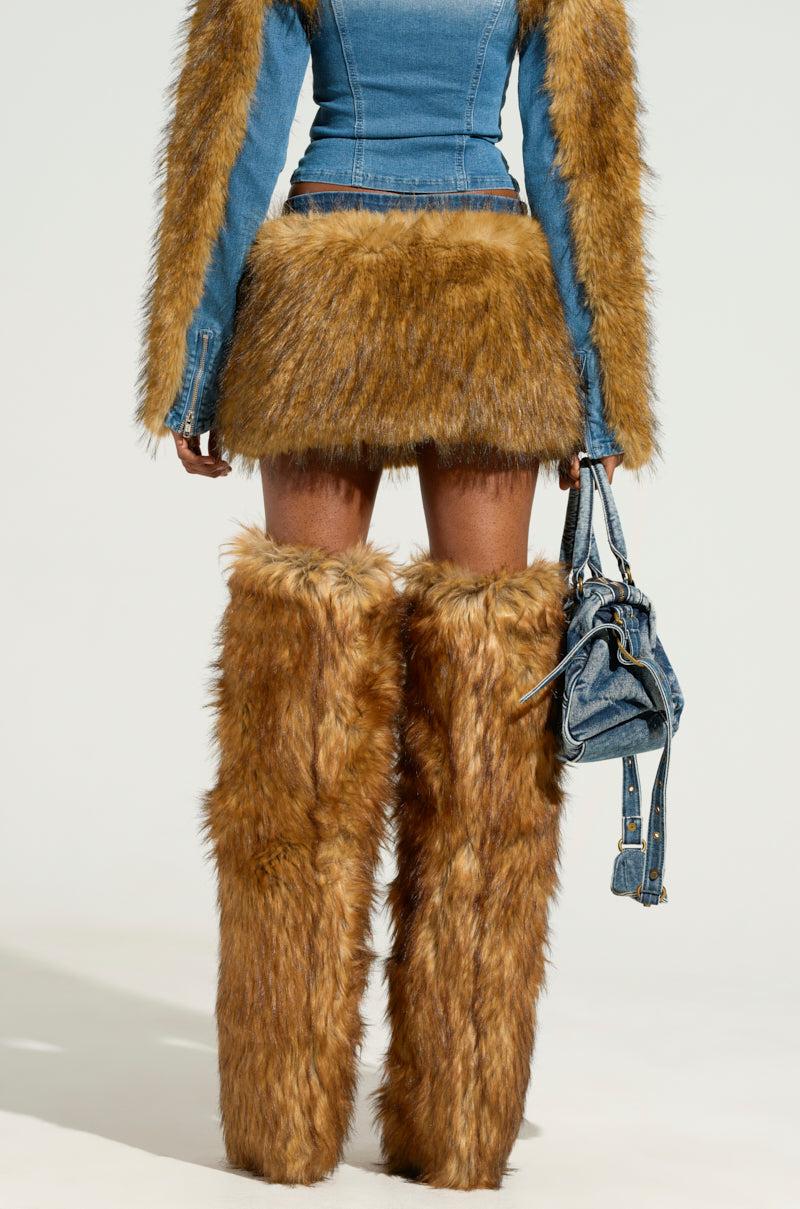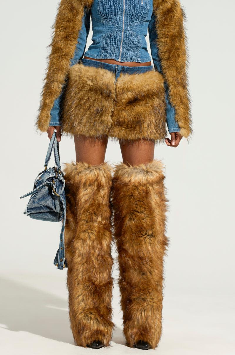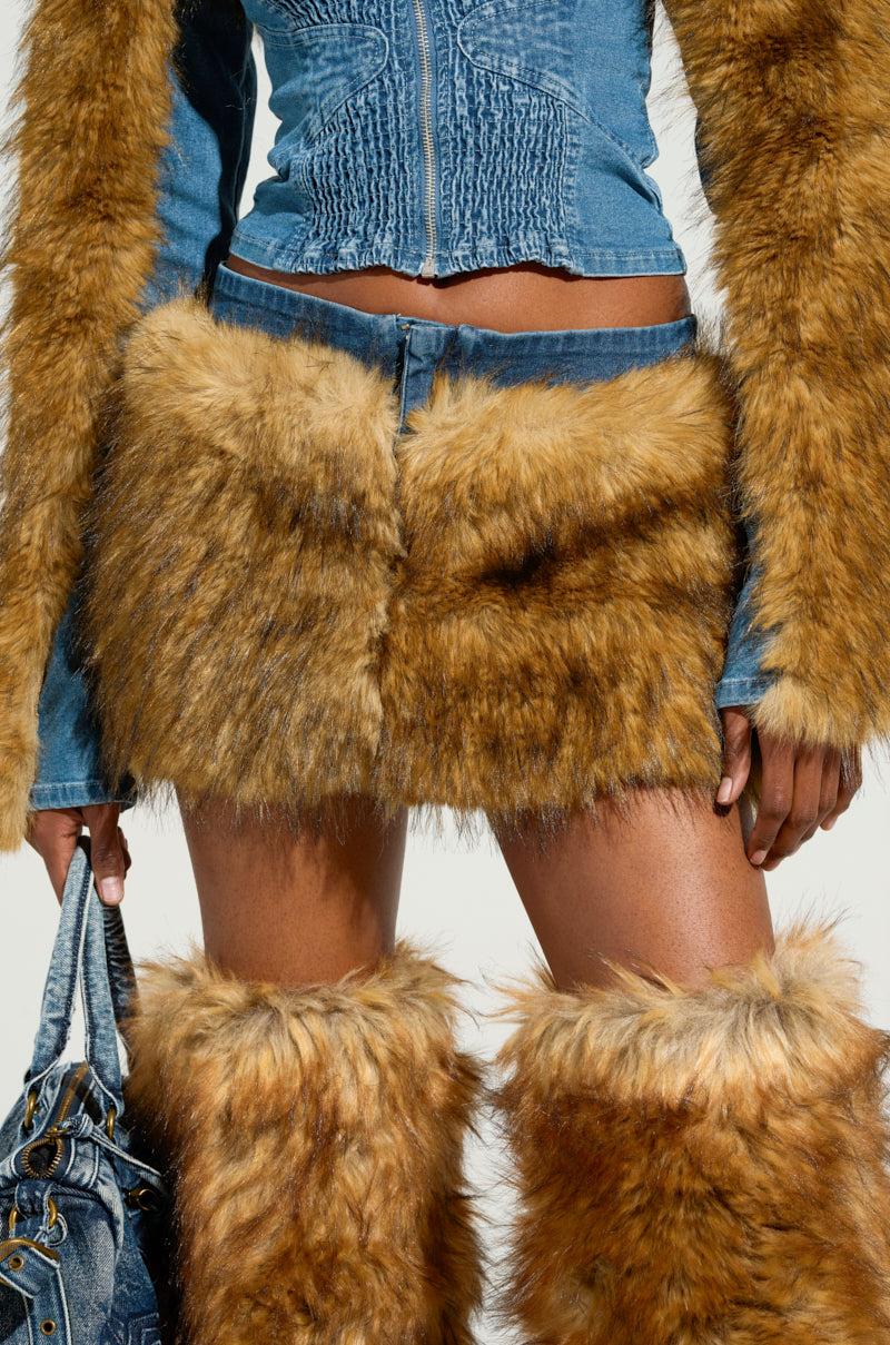 Keep everyone on their toes in The AKIRA Label Out Of The Blue Fur Mini Skirt. This saucy bottom is brought to you in a semi-stretchy, cotton blend medium wash denim base and features a high rise waist, a luscious faux fur overlay wrapped around the entire lower half, a sleek inner lining, and a faux silver metallic front zipper closure. Complete with a mini length. Pair with a denim top and combat boots for a chic finish. - Shell: 41.7% Cotton 36.7% Polyester 19.6% Viscose 2% Spandex, Lining: 92% Polyester 8% Spandex- Some Stretch- Imported (all measurements approximate from size small)- 11” Waist to Hem- Model is 5’8” and is wearing size smallProduct ID: 436712 (all measurements approximate from size 1X)- 14” Waist to HemProduct ID: 436716