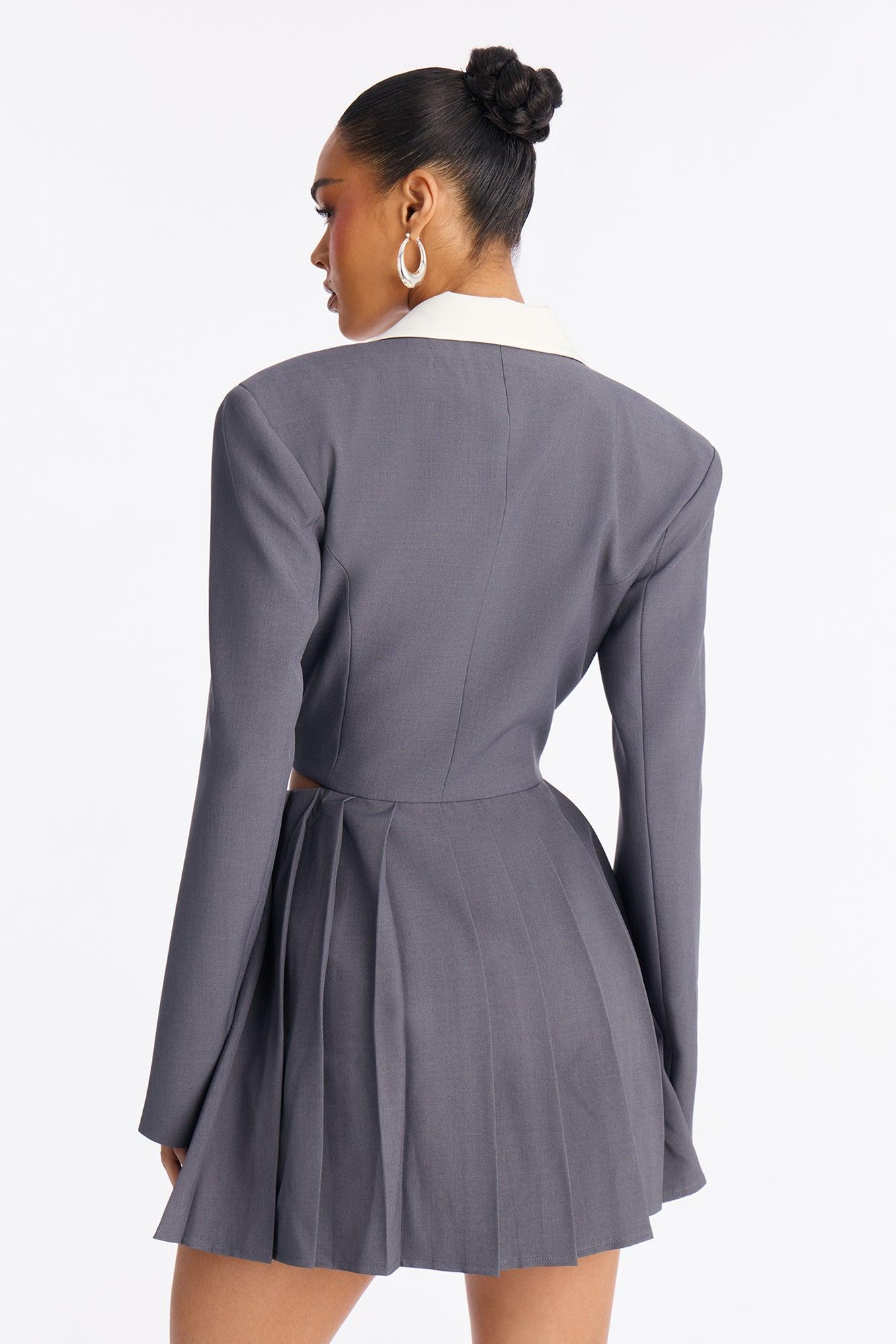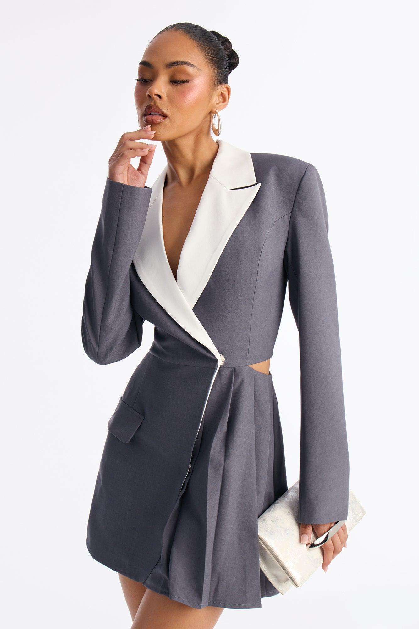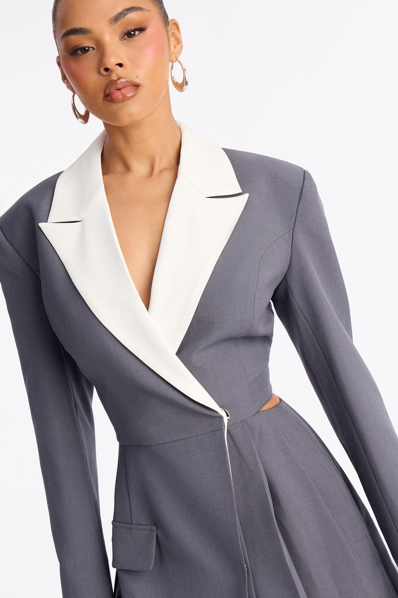 Available In Grey. Blazer Mini Dress Collar Long Sleeve Shoulder Pads Contrast Trim Side Cut Out Faux Pocket Pleated Snap Button Closure Lined Length Measured Flat = 32" Self/Contrast: 95% Polyester 5% Spandex Lining: 100% Polyester Imported