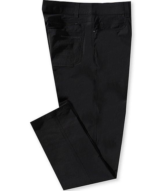 From Outdoor Research, these pants feature: Mid rise Classic fit Front button/zip 5-pocket pants Full length Straight legs Abrasion resistant Quick drying UPF 50+ Water and wind resistant Movement-mirroring stretch fabric Nylon/spandex Machine wash/tumble dry Imported.