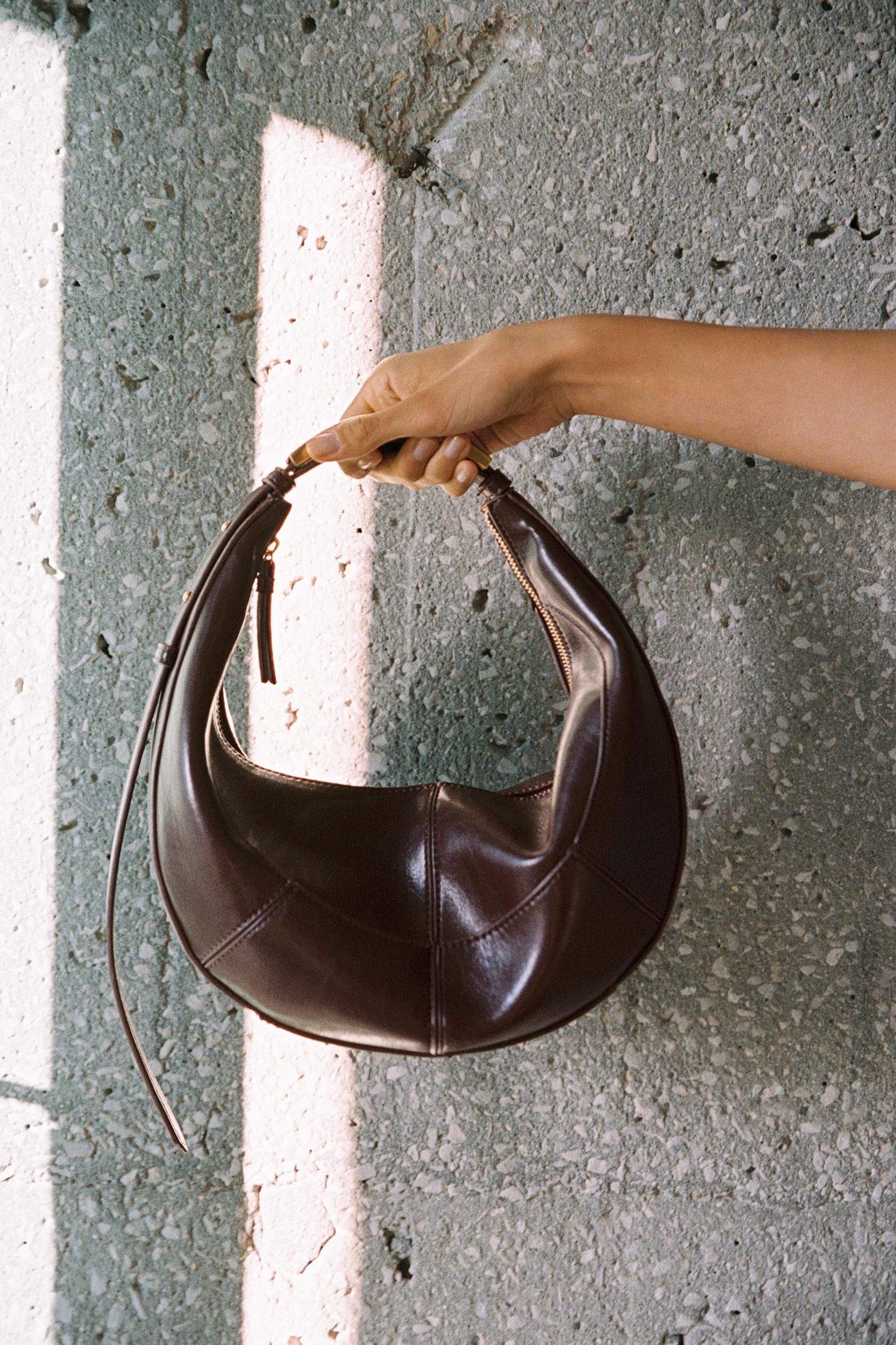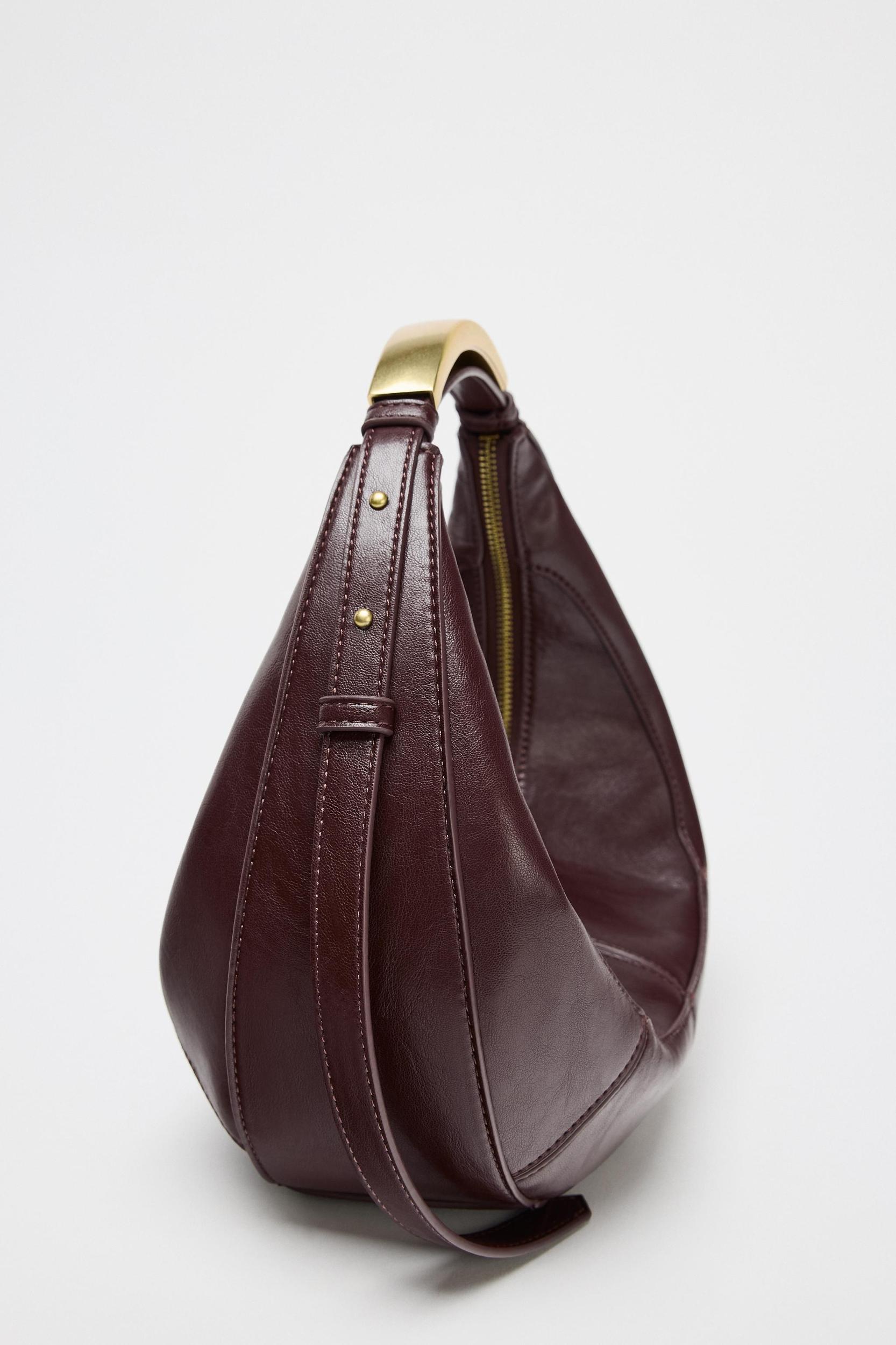 Oval bag. Contrasting topstitching detail on the exterior. Shoulder strap with metal detail. Interior zip pocket. Zip closure with pull tab. Height x Length x Width: 4.3 x 9.4 x 3.5 inches (11 x 24 x 9 cm)