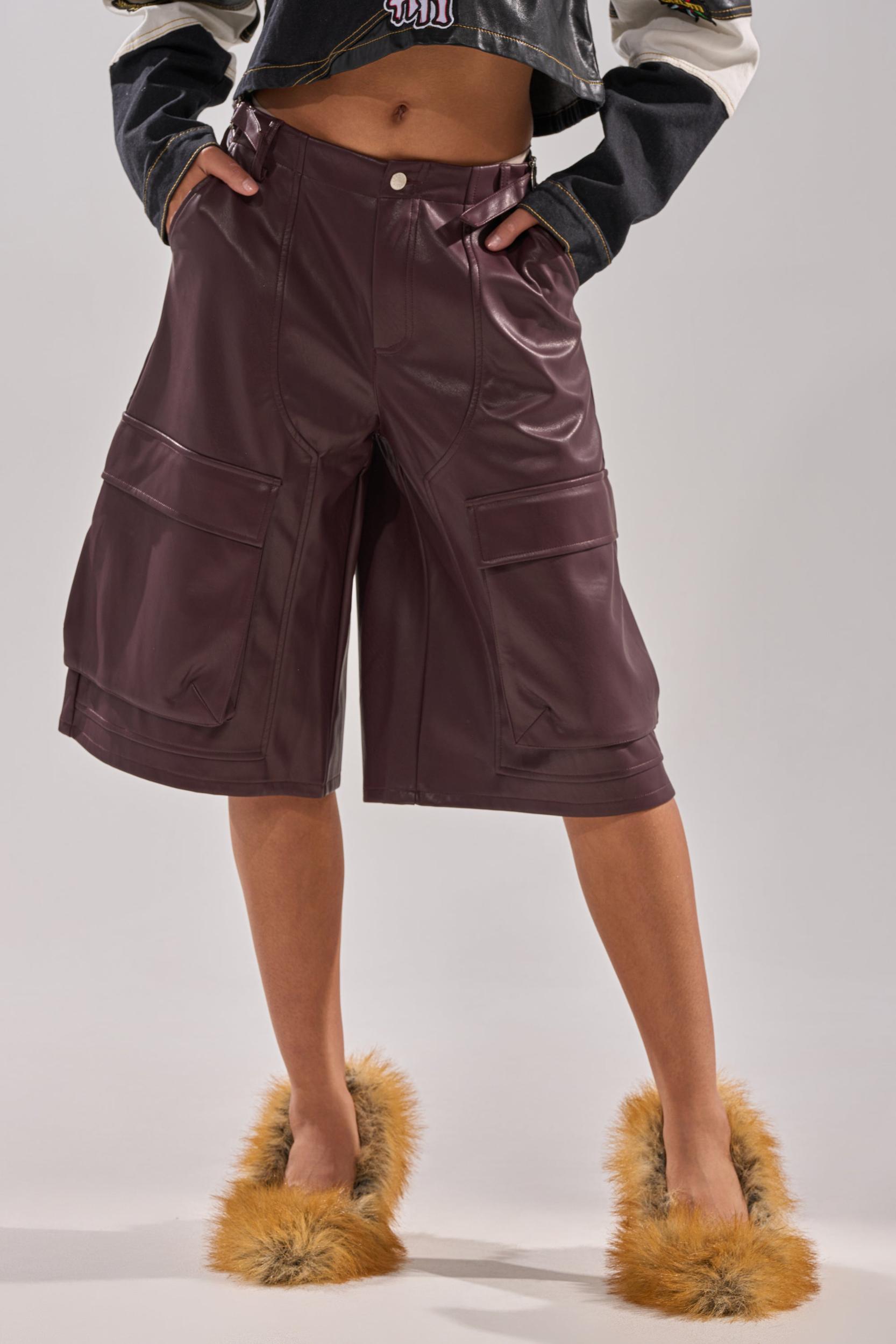There’s no such thing as extra with The AKIRA Label Over Done Faux Leather Bermuda Short. Crafted from buttery smooth faux leather, these shorts feature a high-rise fit, functional belt loops, adjustable strappy accents on each side of the waist, a four-pocket design with additional cargo flap pockets on the lower legs, and a front button-zip closure. Complete with a classic bermuda silhouette. Try pairing with a corset and platform loafers for an effortlessly edgy finish. - 50% PU 50% Polyester- Spot Clean Only- Slight Stretch- Imported (all measurements approximate from size small)- 12” Rise- 15” Inseam- Model is 5’9” and is wearing size smallProduct ID: 1067363 (all measurements approximate from size 1X)- 14” Rise- 15” InseamProduct ID: 1067367