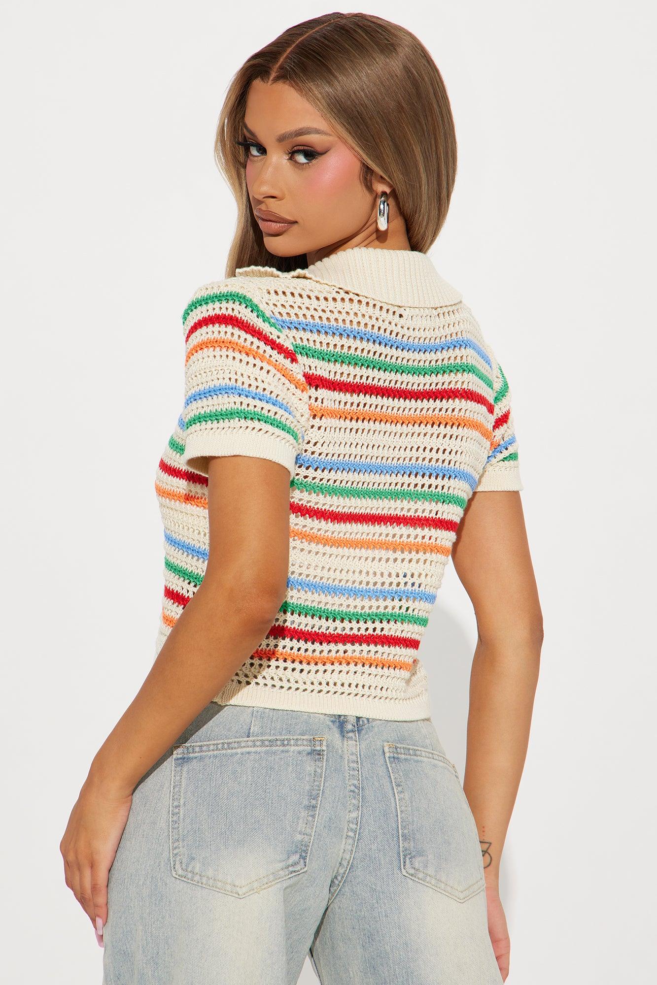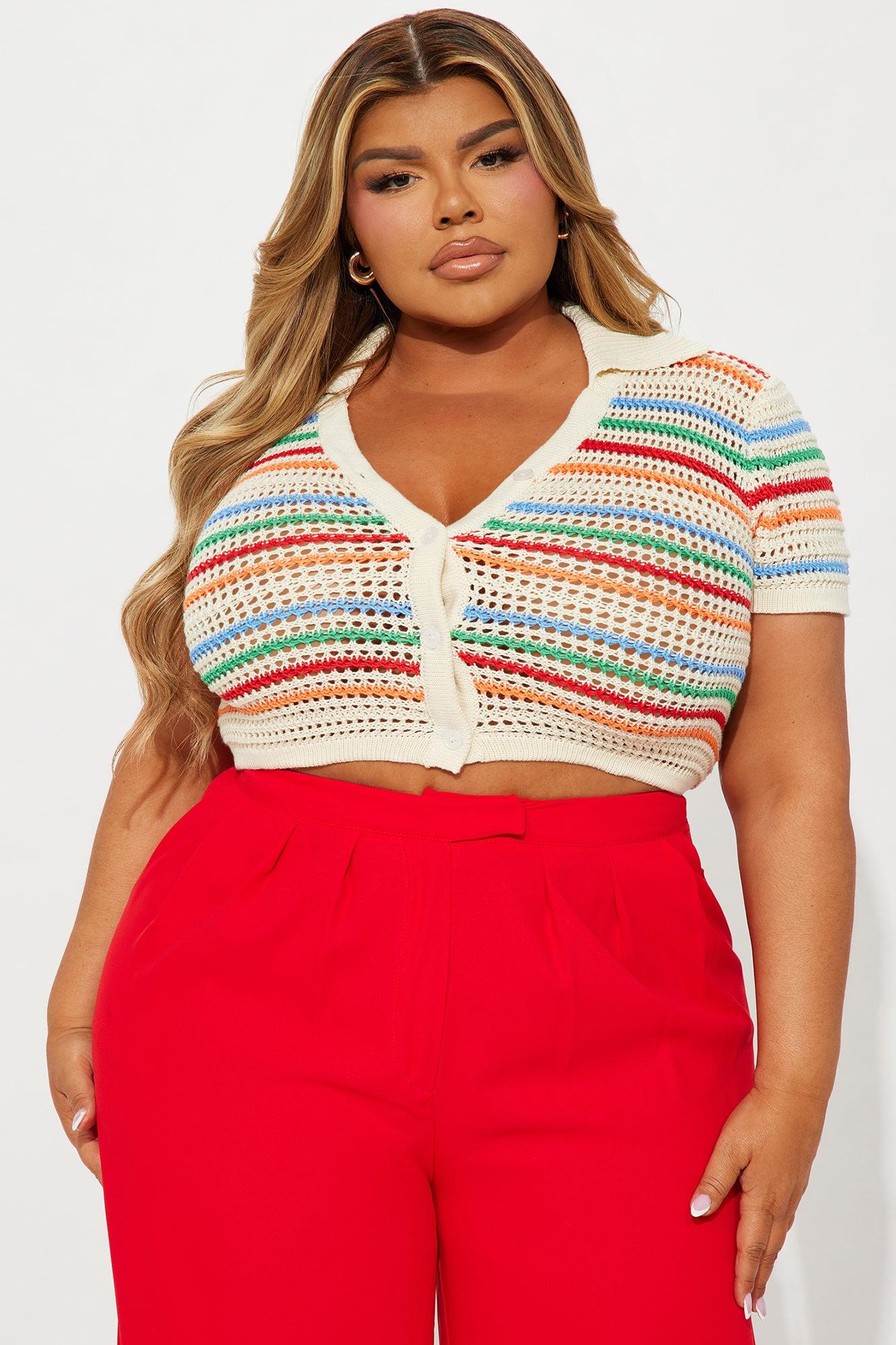 Available In Taupe/combo. Sweater Top Short Sleeve Button Down Collar Striped Crochet Ribbed Hem Cropped Shell: 100% Polyester Imported California Proposition 65WARNING: Cancer and Reproductive Harm - www.P65Warnings.ca.gov.