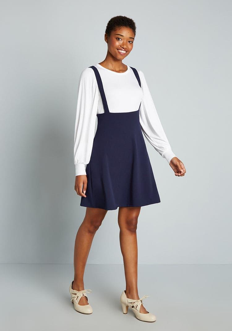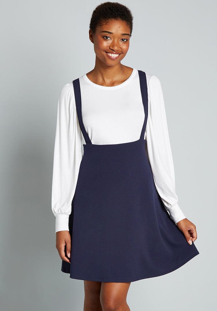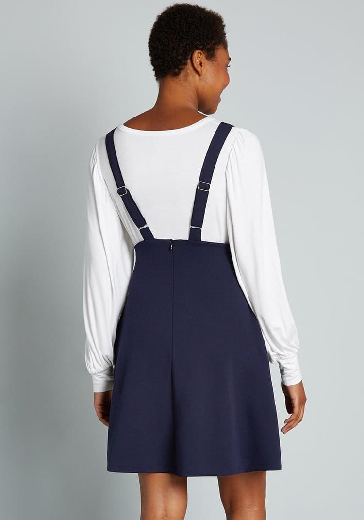 Pioneer a series of groundbreaking looks with this dark navy jumper from our ModCloth namesake label, and a wave of accolades will await you! Made from a stretchy woven fabric, your winning ensembles begin with the high-waisted silhouette and pockets of this supportive skirt, and boasts a customized finish from your favorite tees, blouses, and tops in any colors or patterns that make you feel at the top of your fashion game. 96% Polyester, 4% ElastaneHand washRuns true to sizeFabric provides stretchAdjustable strapsSide pockets. Unlined. Back zipper closure.