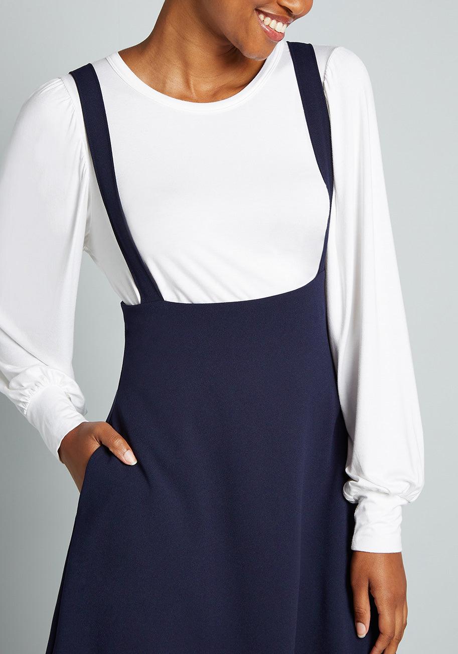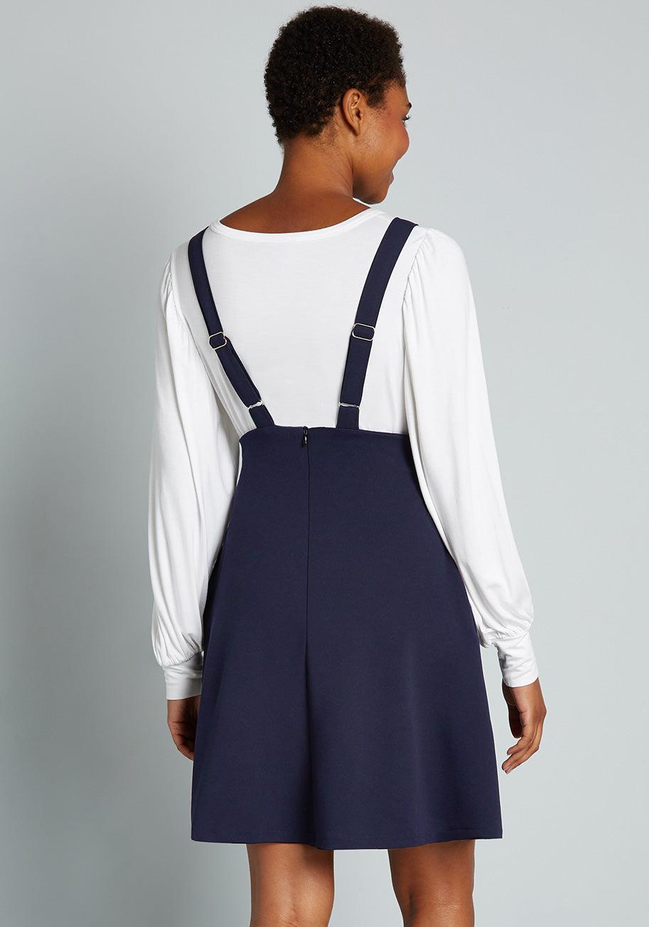 Pioneer a series of groundbreaking looks with this dark navy jumper from our ModCloth namesake label, and a wave of accolades will await you! Made from a stretchy woven fabric, your winning ensembles begin with the high-waisted silhouette and pockets of this supportive skirt, and boasts a customized finish from your favorite tees, blouses, and tops in any colors or patterns that make you feel at the top of your fashion game. 96% Polyester, 4% Elastane Hand wash Runs true to size Fabric provides stretch Adjustable straps Side pockets. Unlined. Back zipper closure.