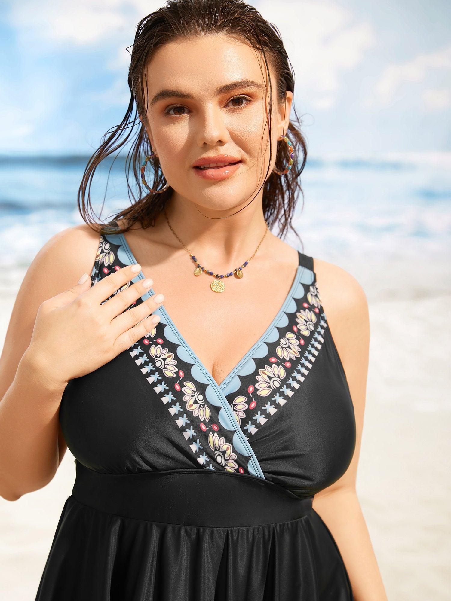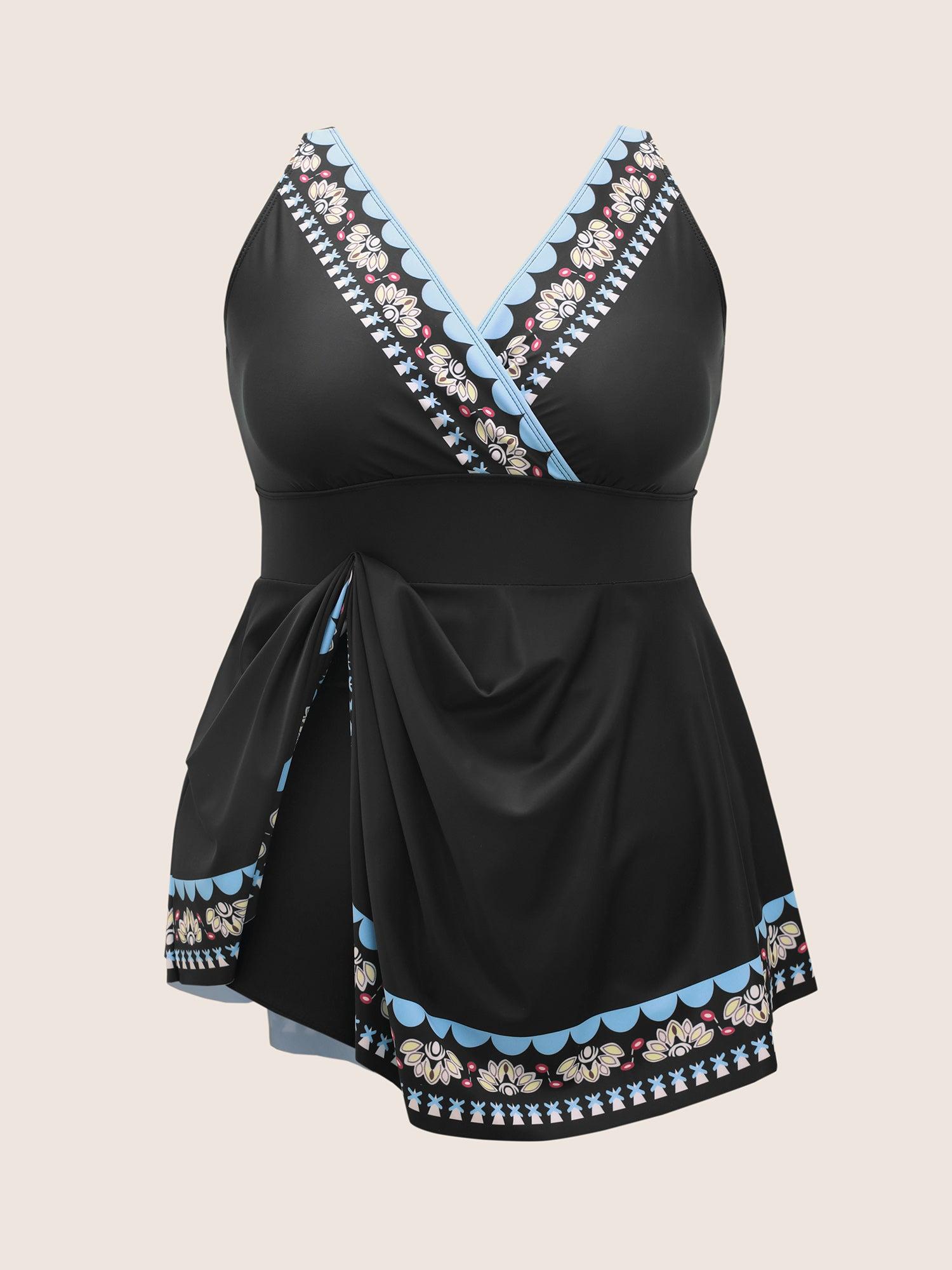 Shop Overlap Collar Boho Print Hanky Hem Swim Dress now and redefine your style with confidence at BloomChic. Tailored for mid and plus-size women. This trendy Swimwear Women, sizes 10-30. Season:Summer;Color:Black;Style:Beach;Cup Type:Removable cups;Waist Design:High Rise;Neckline:Overlap Collar;Sleeve Type:Sleeveless;Prints:Bohemian print;Details:Asymmetrical, Gathered, Contrast;Pocket:No-pocket;Belt:No-belt;Chest pad:Removable Padding;Lining:Lining;Closure Type:Non
