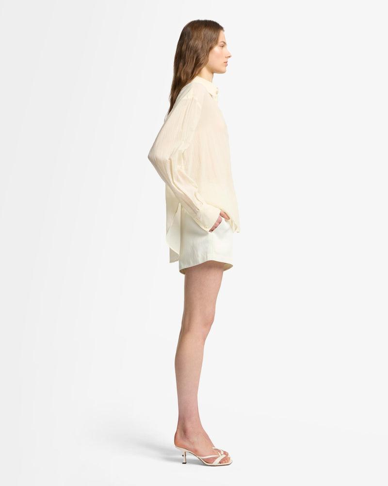 Fits like: An oversized button-down shirt with a relaxed silhouette and dropped shoulders for a laid-back yet refined look.Feels like: Lightweight and breathable, crafted from slightly sheer voile fabric for a soft, airy feel with a delicate drape. The Details: Ivory shade Pointed collar and button-front closure Long s
