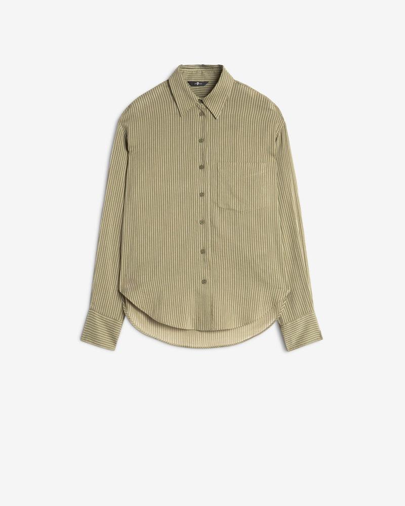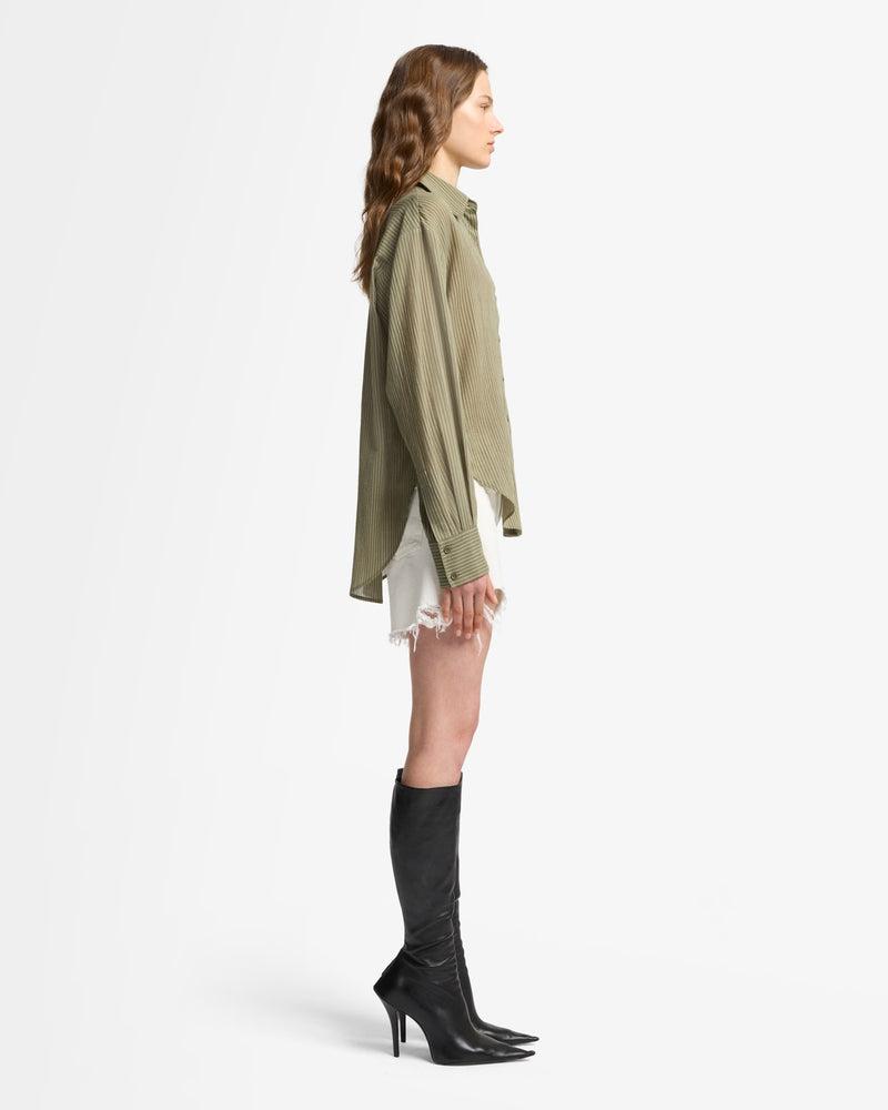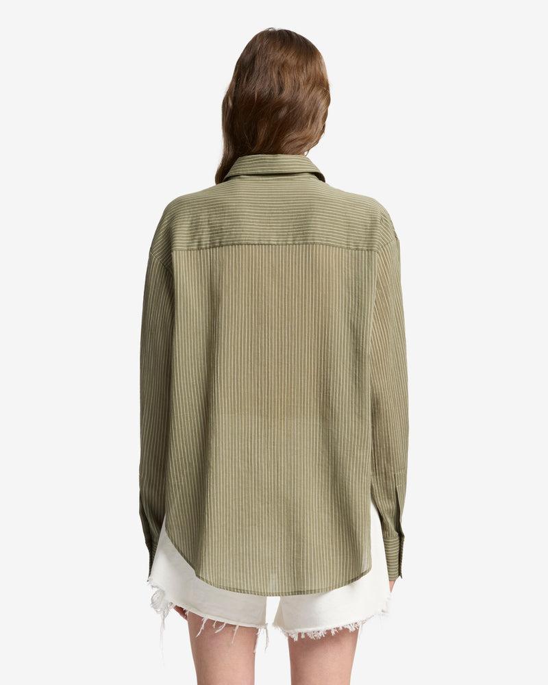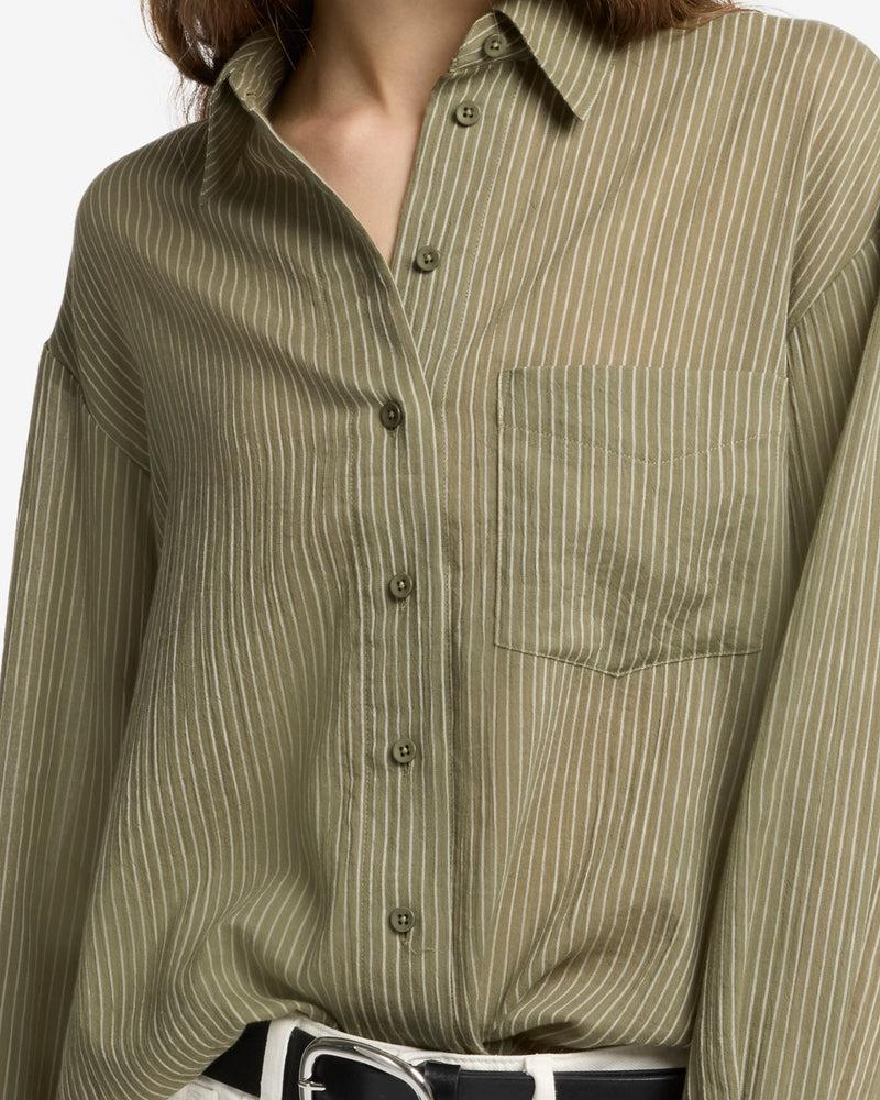 Fits like: An oversized button-down shirt with a relaxed silhouette and dropped shoulders for an effortlessly chic look.Feels like: Lightweight and airy, crafted from slightly sheer voile fabric for a soft, breathable feel with a subtle, flowy drape. The Details: Army green shade with stripe pattern Pointed collar and