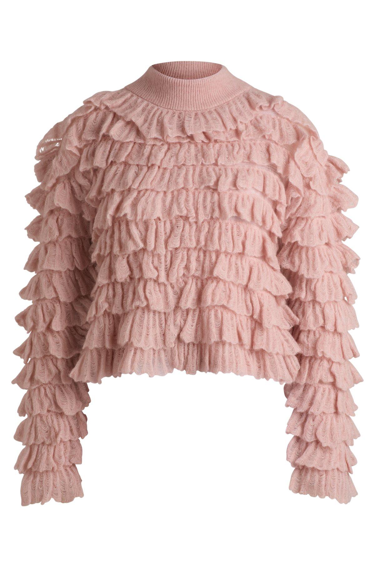A cropped sweater in a boxy fit with a frilled structure by HUGO. This mock-neck piece is knitted in yarns blended with wool and alpaca.