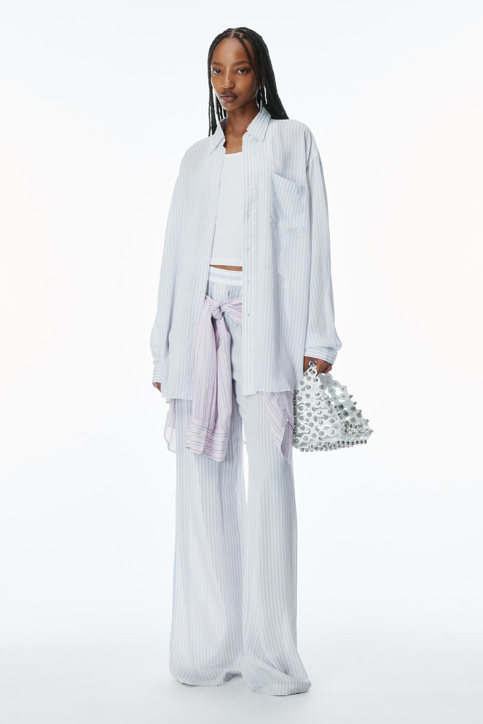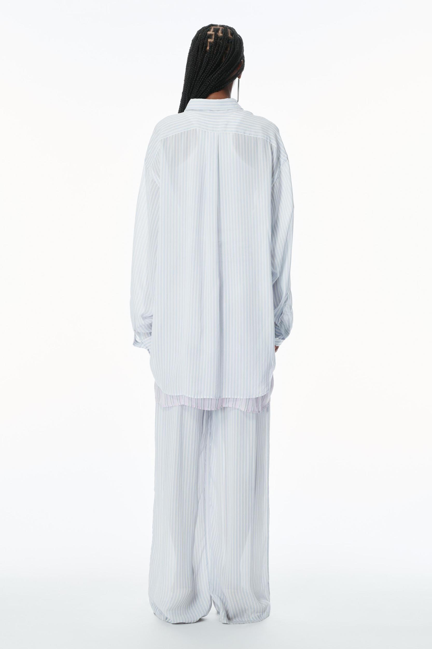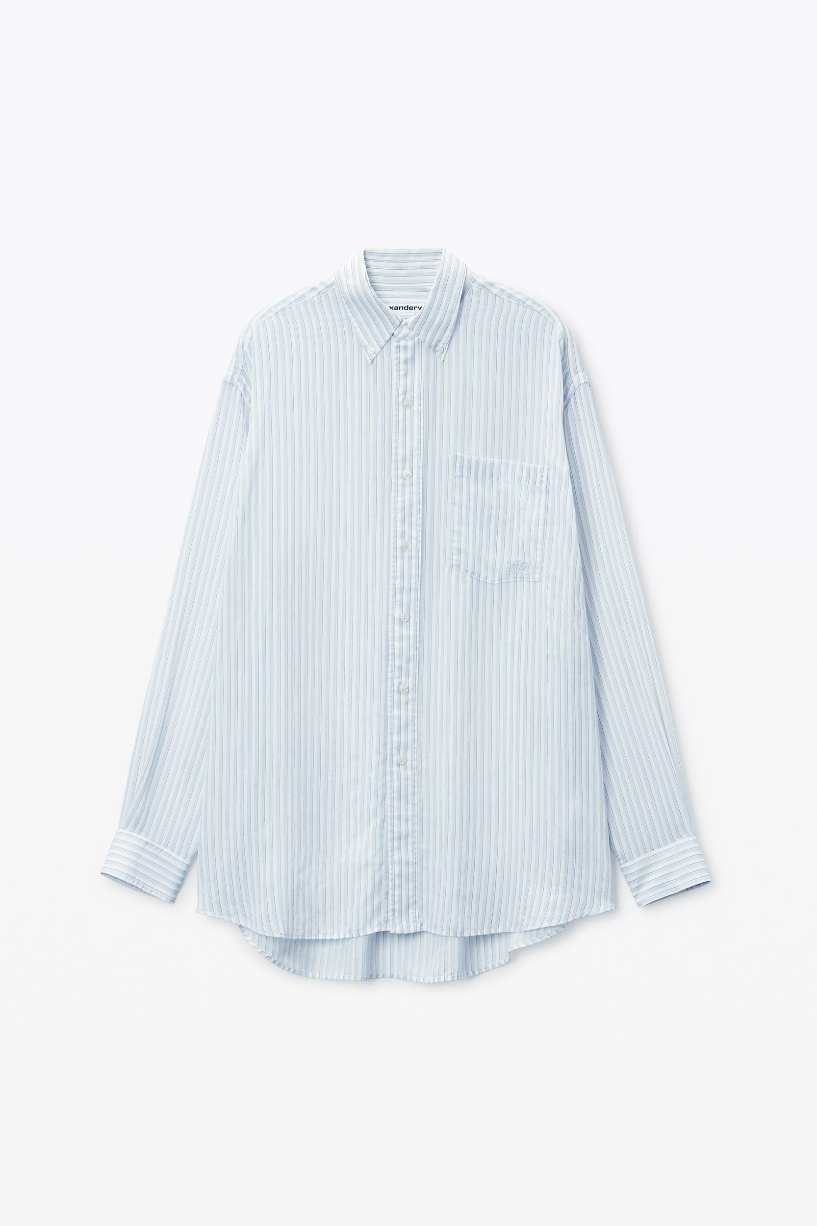 cut in an oversized fit, this oxford blue/white silk chiffon shirt spotlights scripted logo embroidery at the chest pocket. details like single-needle stitch and buttons at the collar point, along with a pleated back yoke, complete this silhouette.