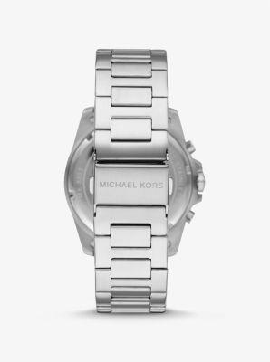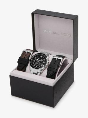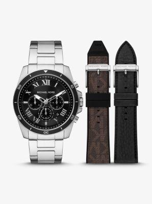 Introducing our 44mm Watch and Strap Set for the guy who needs it all. This Chronograph watch features a black dial with silver-tone Roman numerals on a stainless steel bracelet. When you want to switch up your look, swap out the bracelet for a Brown PVC Logo or Black Leather Strap.