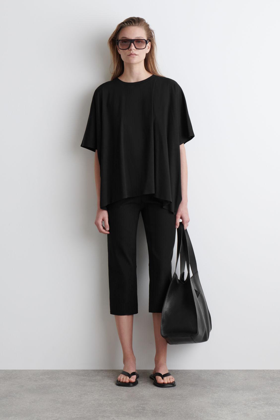 A reconsidered wardrobe signature, this oversized T-shirt is designed with modern batwing sleeves and a draped, curved hem. It's crafted from cotton-jersey, chosen for its naturally light handle and unrivalled softness. Oversized fit, 140gsmLENZING™ ECOVERO™ viscose is a branded viscose fibre, made from wood pulp Shell: 100% Cotton. Rib: 85% ECOVERO™ Viscose, 13% Polyester, 2% Elastane. Excluding trims / Machine wash Back length of size XS/S is 65cm / Model wears a size XS/S