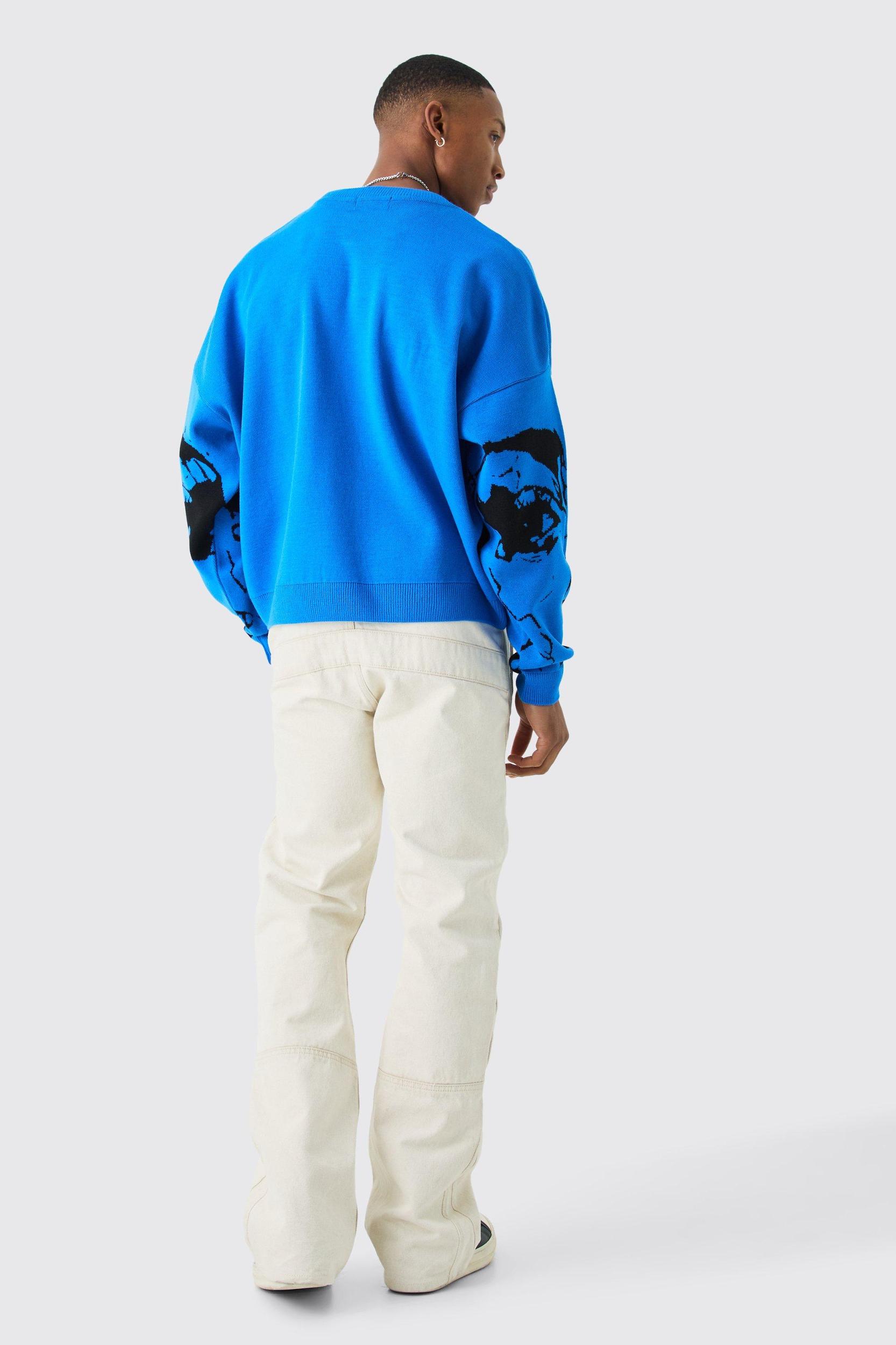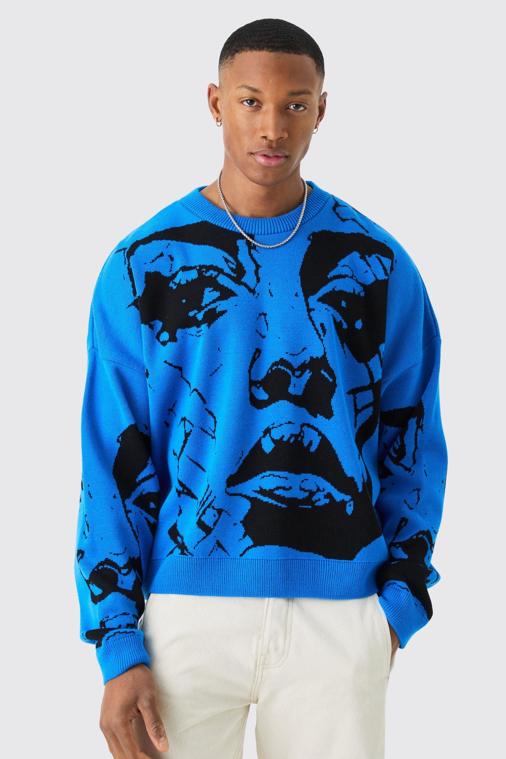 Mens Blue Oversized Boxy Drop Shoulder Face Jacquard Knit Jumper - Layer up and look good in a jumper from the boohooMAN collection. Fashions all about the finishing touches and jumpers and cardigans are the easiest way to fix up your look. Keep it cool in cable knits, work it in waffle or do the finer details in a fisherman. Show off your style in a sharp shirt and shawl cardigan combo, finish off with brogues and youll be up there with fashions finest.Style: JumperDesign: JacquardFabric: AcrylicLength: CroppedSleeve Length: Long Sleeve
