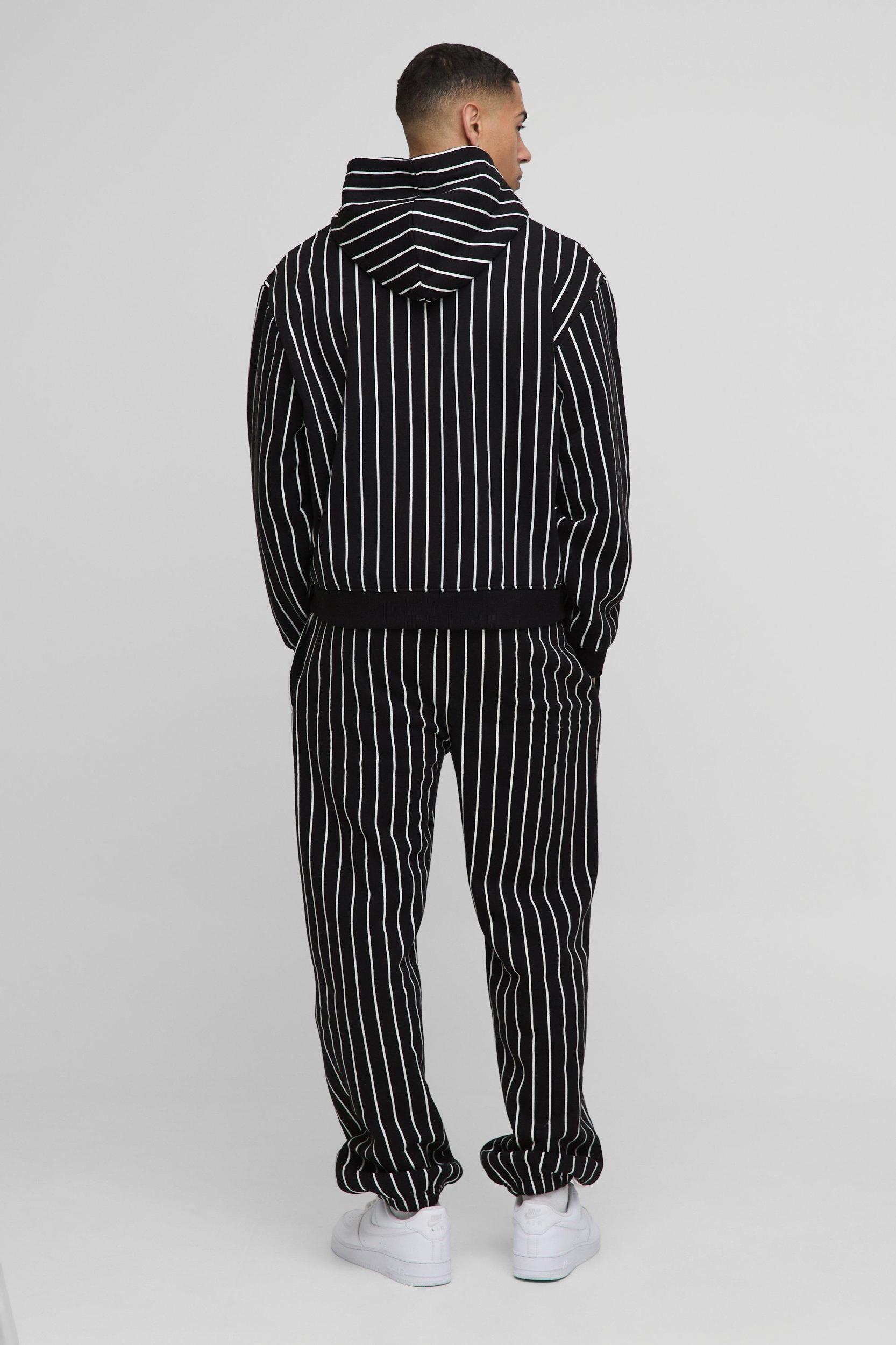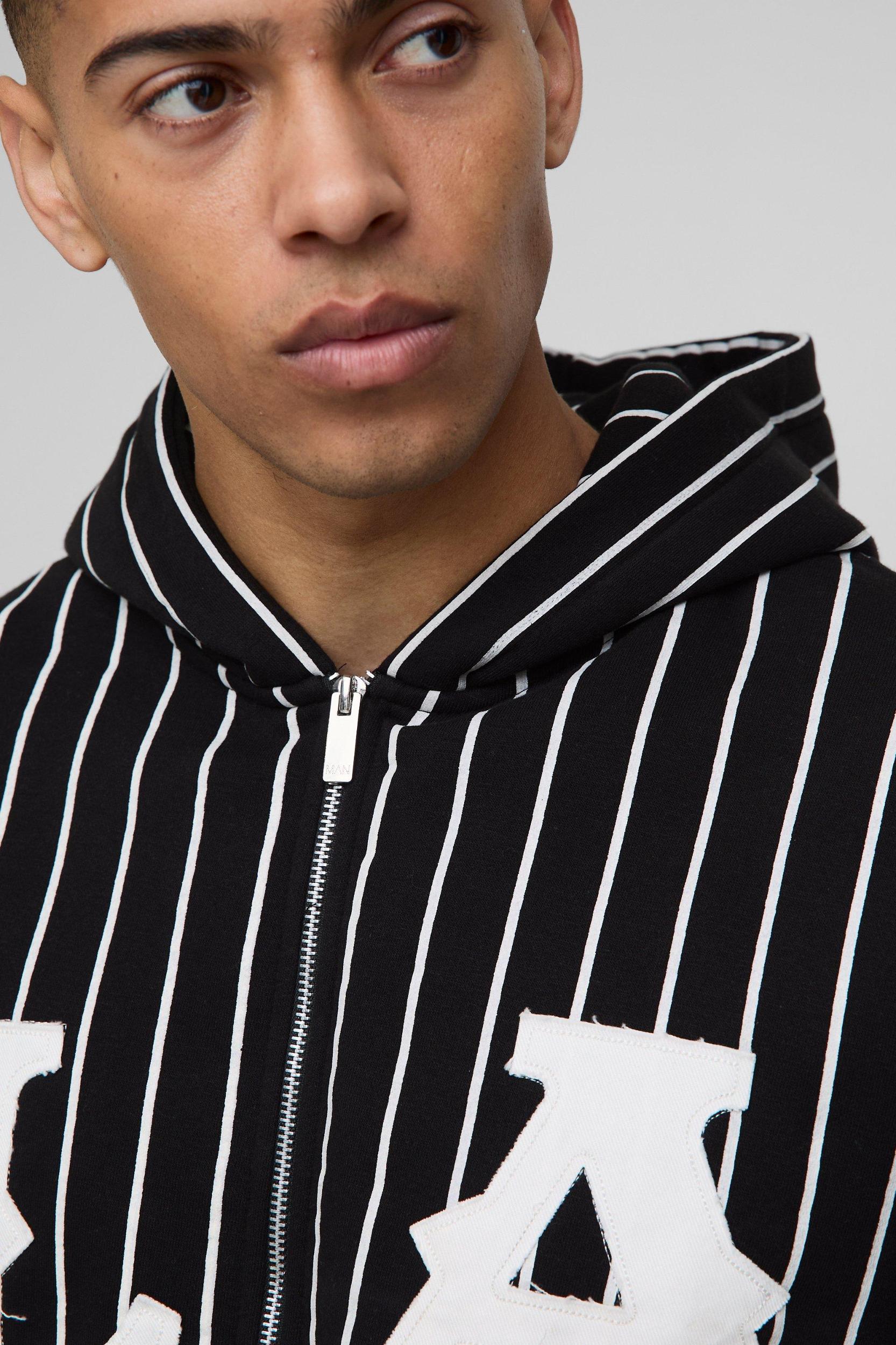 Mens Oversized Boxy LA Applique Pinstripe Zip Through Hoodie - Black - Layer up with an oversized hoodie. Who says you have to choose between style and comfort? With clean lines and plenty of room for extra layers, an oversized hoodie will finish off your fit and keep you warm any time of year. Pair a bold print with black cargos and sneakers for an effortlessly chill street look, or colour match your hoodie with comfy sweatpants to hit the gym in style. Mix and match your favourite statement tees with two or three zip up hoodies in block colours and youll have endless combos to last you all season. changeStyle: Printed HoodieDesign: VarsityFabric: BrushbackDetail: AppliqueLength: CroppedNeckline: HoodedSleeve Length: Long Sleeve