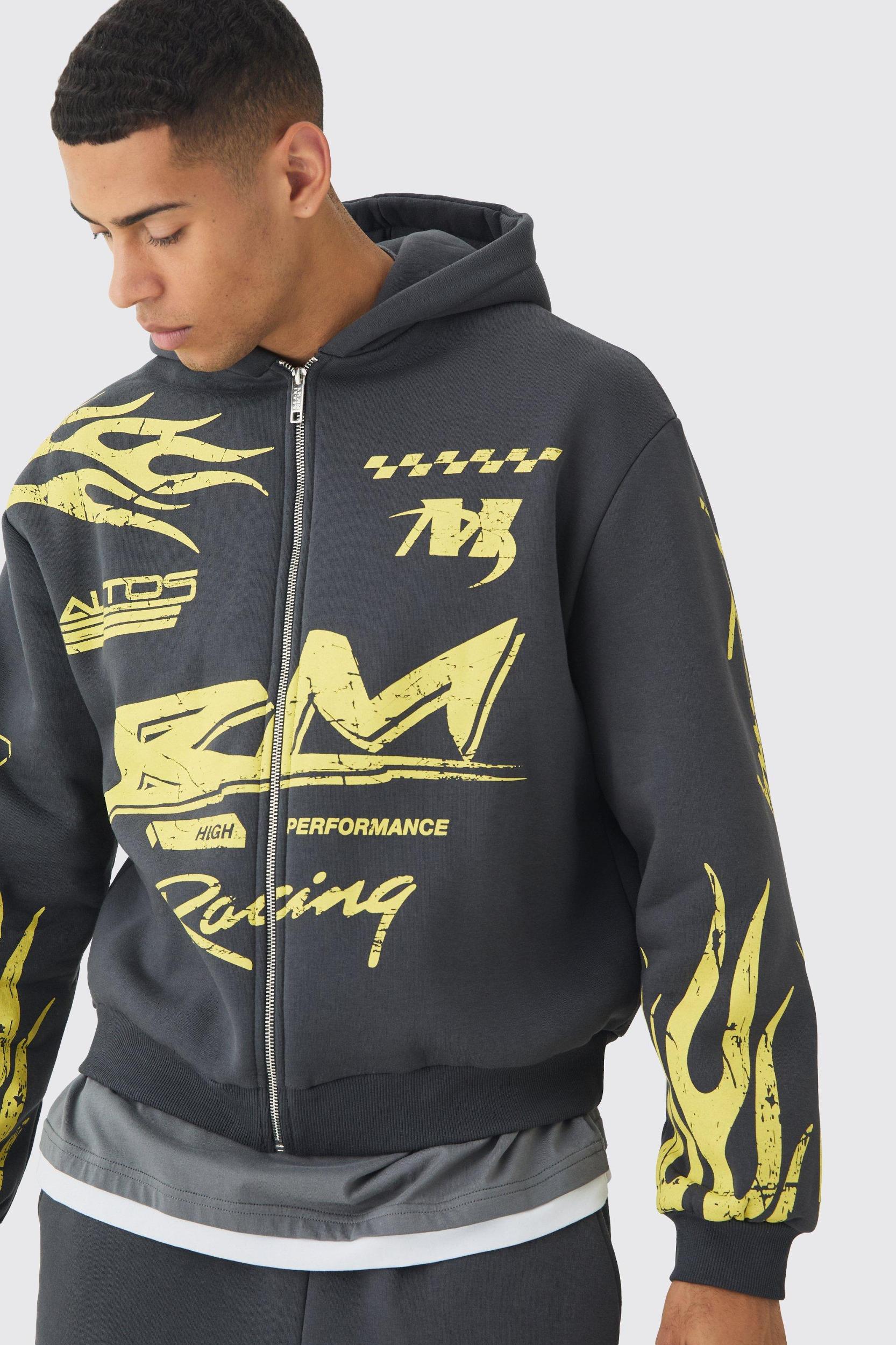 Layer up with an oversized hoodie. Who says you have to choose between style and comfort? With clean lines and plenty of room for extra layers, an oversized hoodie will finish off your 'fit and keep you warm any time of year. Pair a bold print with black cargos and trainers for an effortlessly chill street look, or colour match your hoodie with comfy joggers to hit the gym in style. Mix and match your favourite statement tees with two or three zip up hoodies in block colours and you'll have endless combos to last you all season. changeStyle: Printed HoodieDesign: MotoFabric: BrushbackLength: CroppedNeckline: Hooded Zip ThroughSleeve Length: Long Sleeve