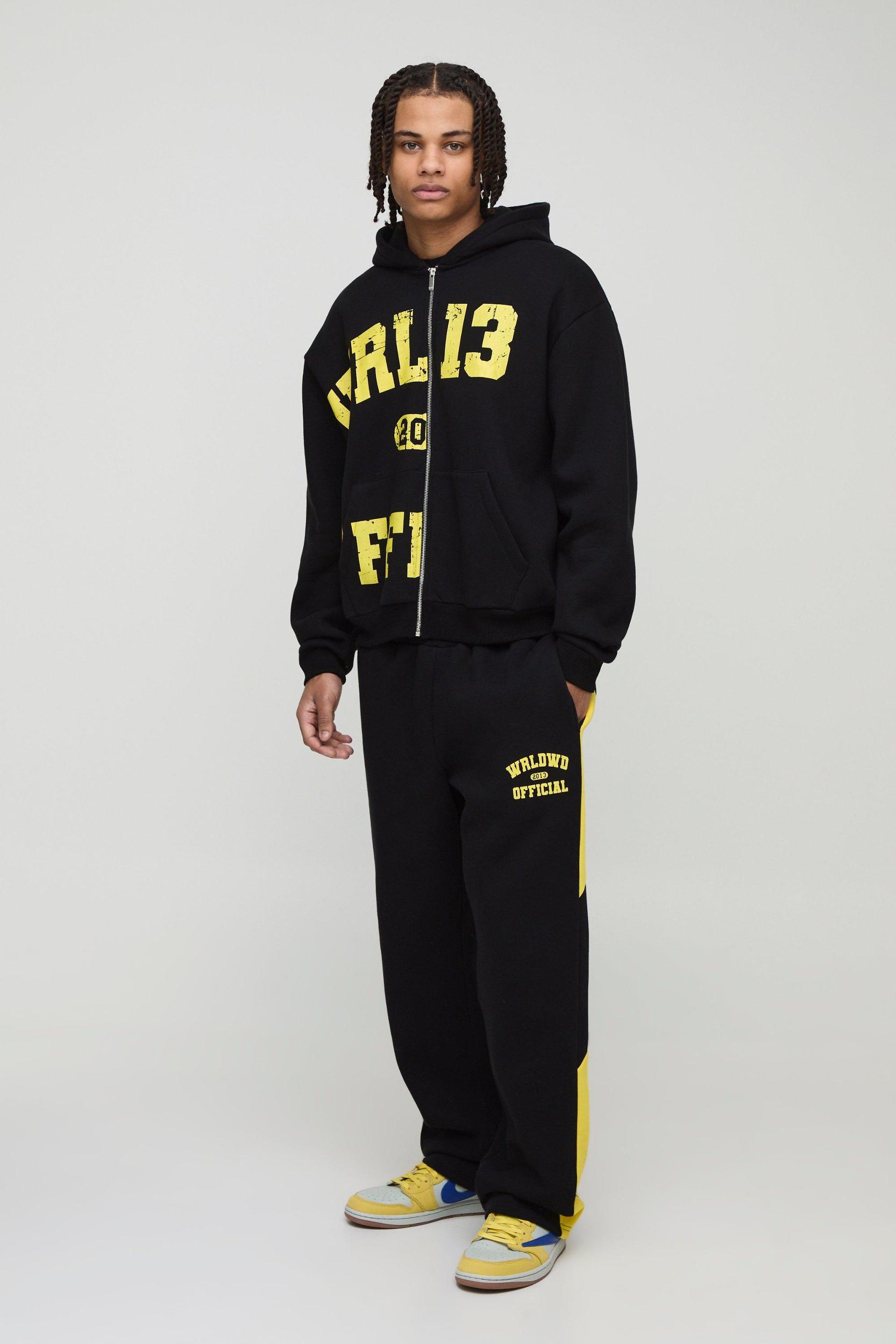 Create cool combos with hooded tracksuits from boohooMAN. Mix and match shapes and colours with this uber-stylish collection of hooded tracksuits, designed to go from sofa to streets with no extra effort. Show off your lines with a skinny fit set, or pick an oversized hoodie and sweatpants duo for comfy street casual. With a white tee and sneakers you can rock any combo – how about all black for a bold monochrome, long sleeves and shorts for casual summer party vibes or even baby pink or blue for a softer aesthetic. Whichever you choose, with our range of hooded men's tracksuits you'll look effortlessly cool both in the gym and out.Style: Printed Long TracksuitDesign: SloganFabric: BrushbackDetail: GussetLength: RegularNeckline: Hooded Zip ThroughSleeve Length: Long Sleeve