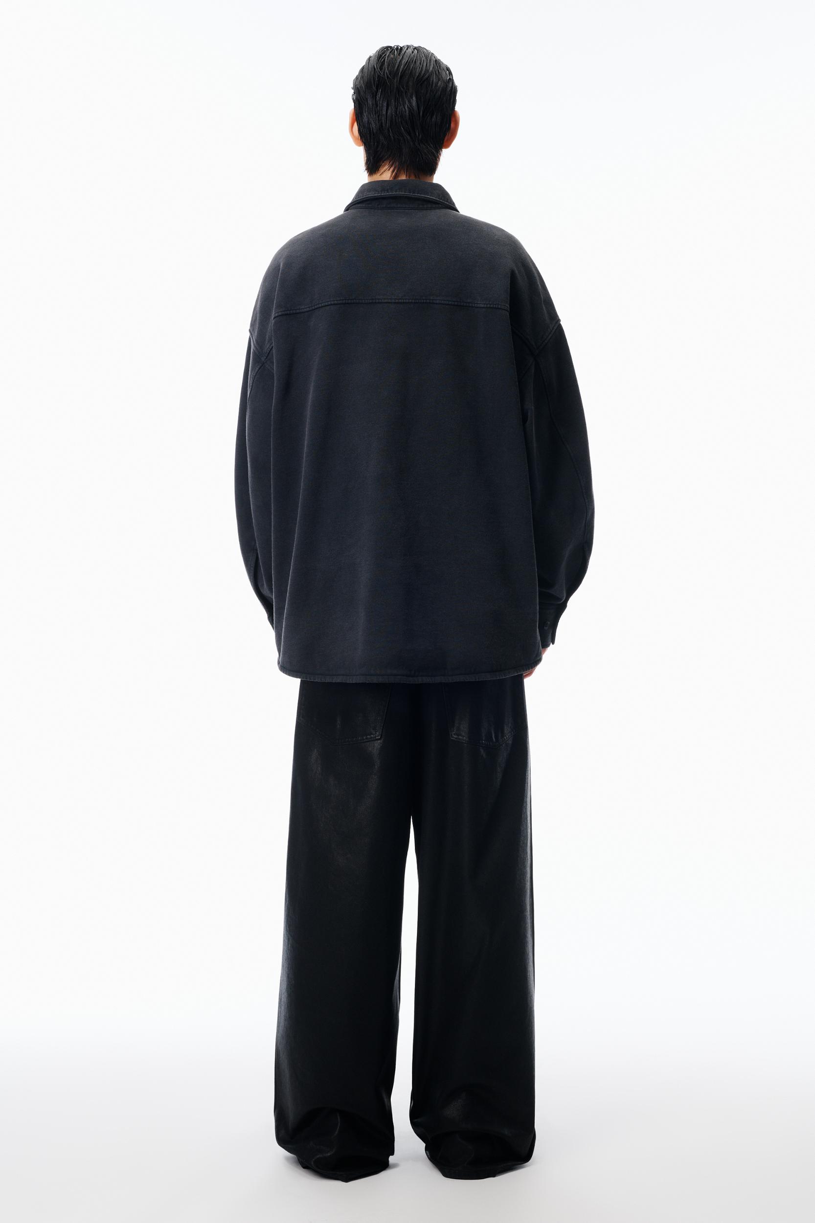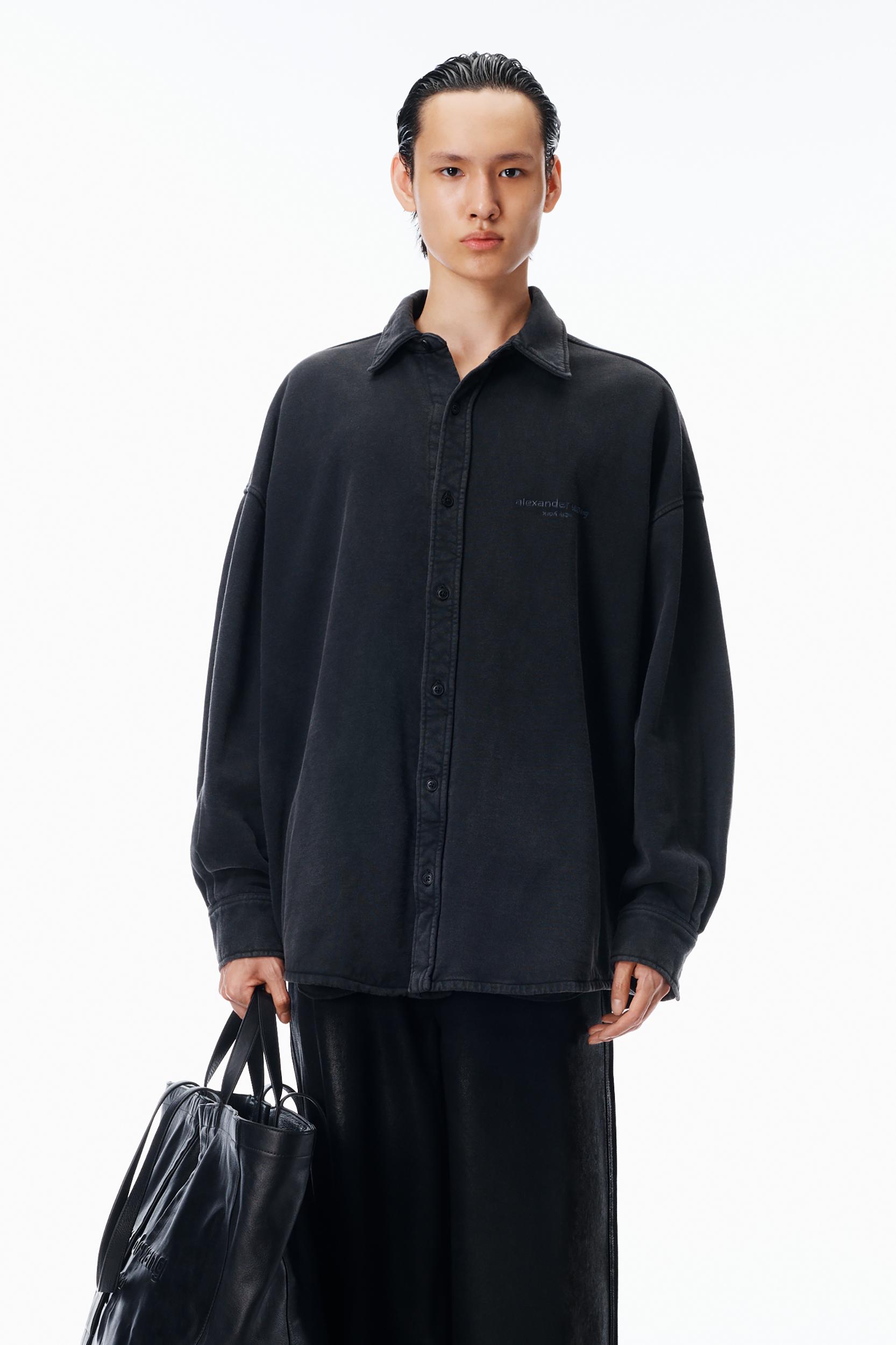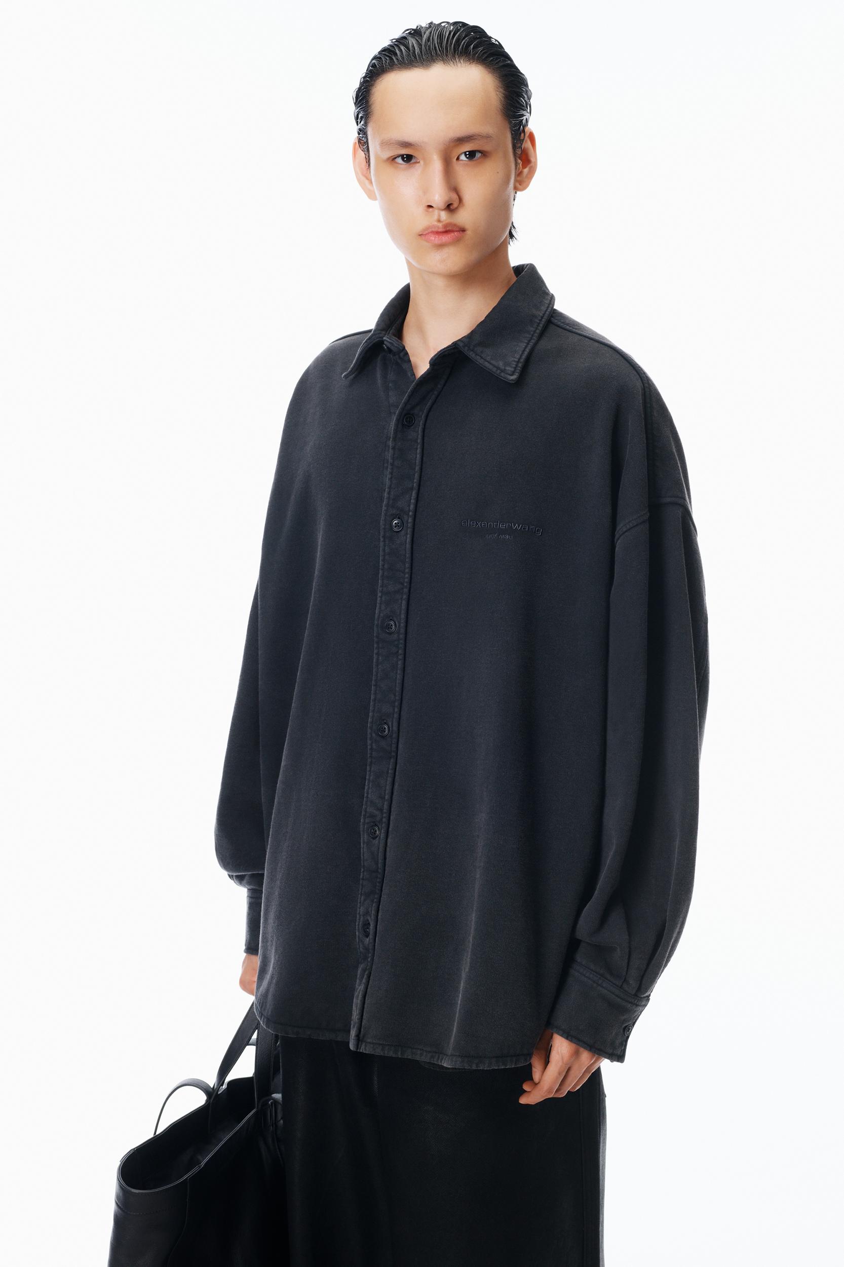 Washed black organic dry terry tailored into an oversized button down shirt. Designed with a classic placket, buttoned cuffs, in-seam pockets, and an embroidered chest logo.
