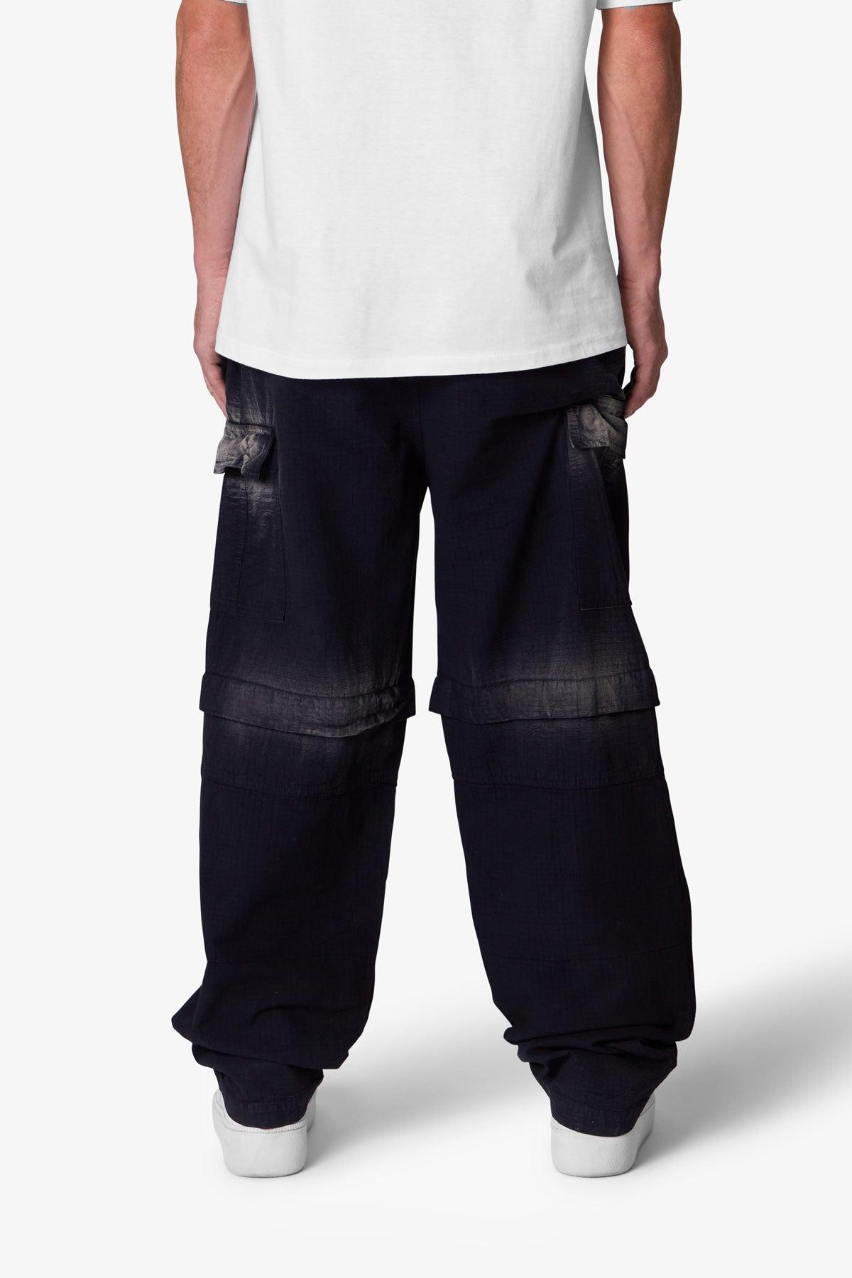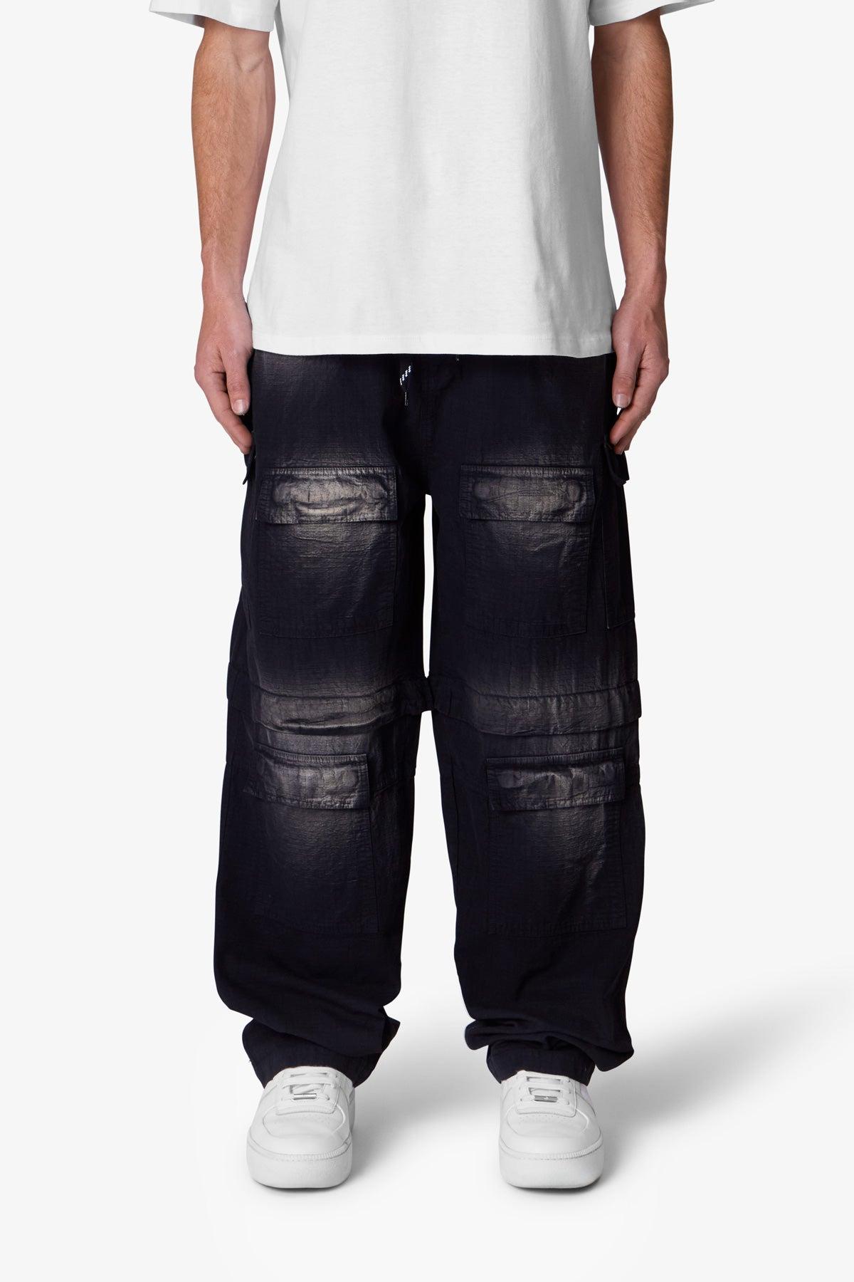 the Oversized Cargo Pants are designed with a new exaggerated oversized fit, constructed from a cotton ripstop fabric with a rinse wash, pp spray at the knees and thighs, tonal drawcord, cargo pockets throughout, and finished with an exaggerated waist that is intentionally large that allows for the waist to cinch for a
