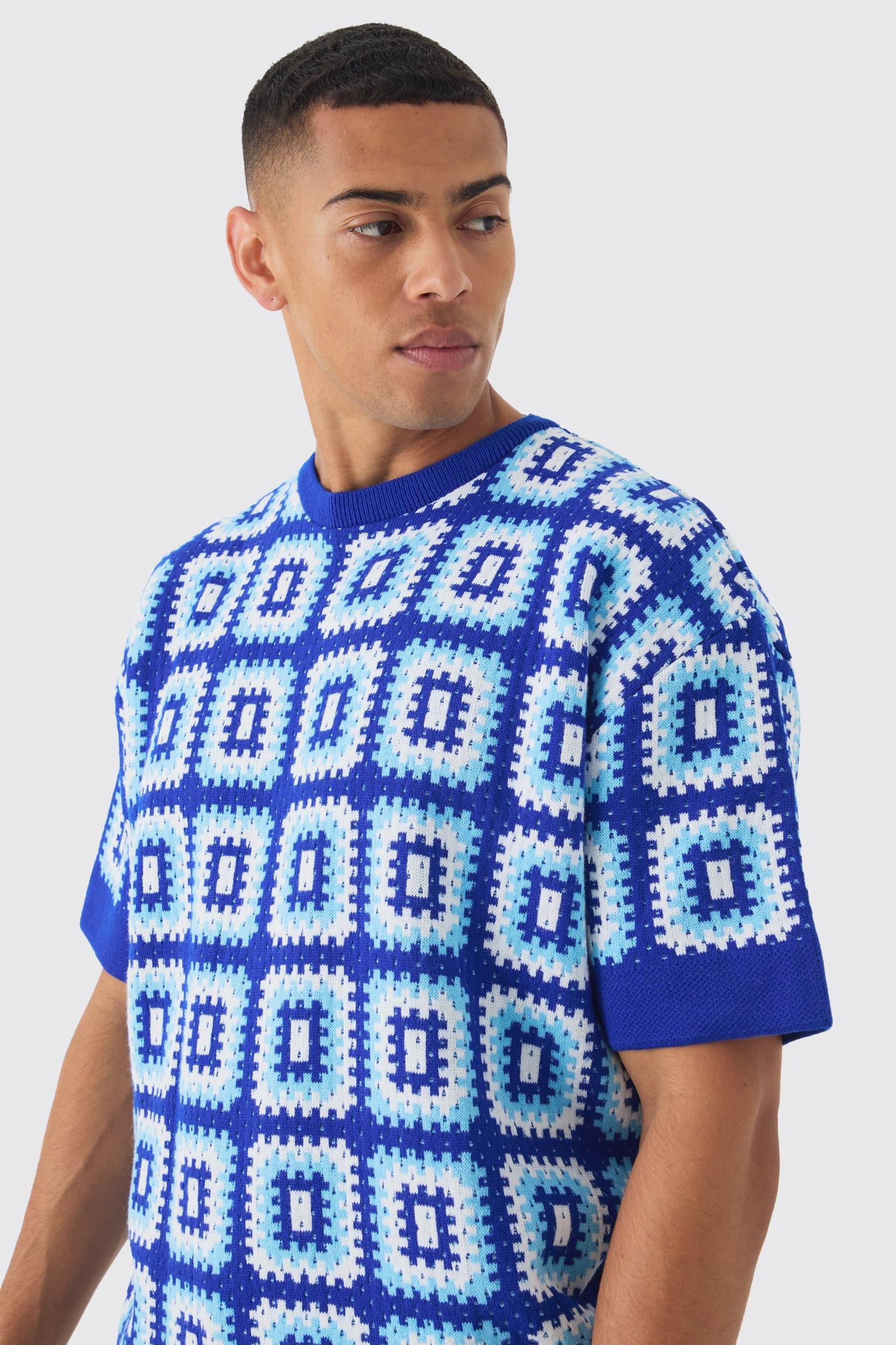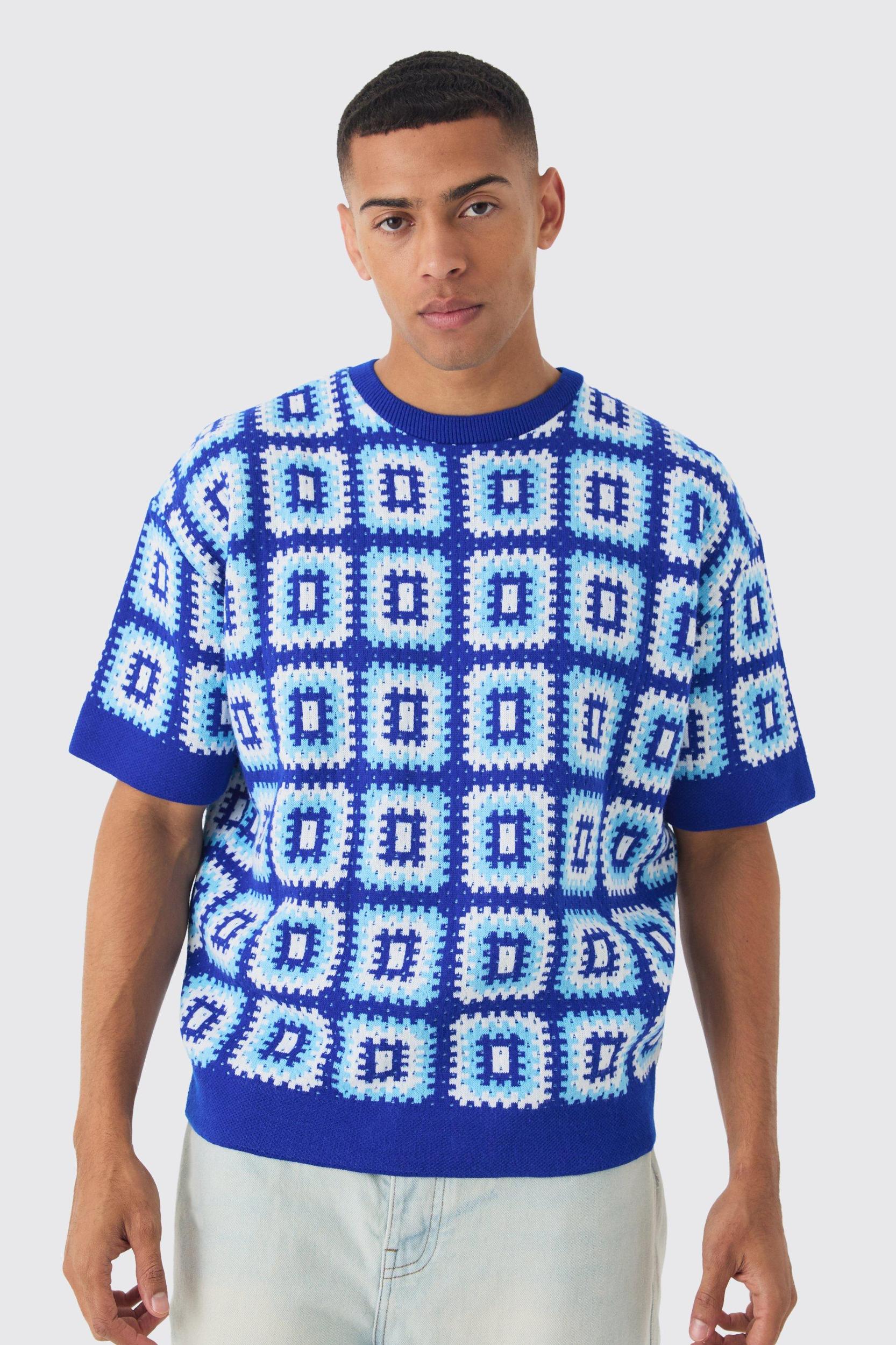 Mens Blue Oversized Crochet Knit T-shirt - You can never have too many t-shirts Nail your laid-back look with an oversized t-shirt, featuring a relaxed fit for extra style and maximum comfort. Whether youre chilling in your down time or out challenging the status quo, box your silhouette with a straight, large tee and baggy trousers or add bulk to your frame by choosing a lighter colour and adding a dark bomber jacket and cargos. Show off your personality with a graphic or licensed tee worn over the top of a contrasting hoodie, or go for an oversized white tee with a beige or grey twin set and matching trainers for a breezy, streamlined look.Style: T-ShirtDesign: Open StitchFabric: AcrylicLength: RegularNeckline: CrewSleeve Length: Short Sleeve