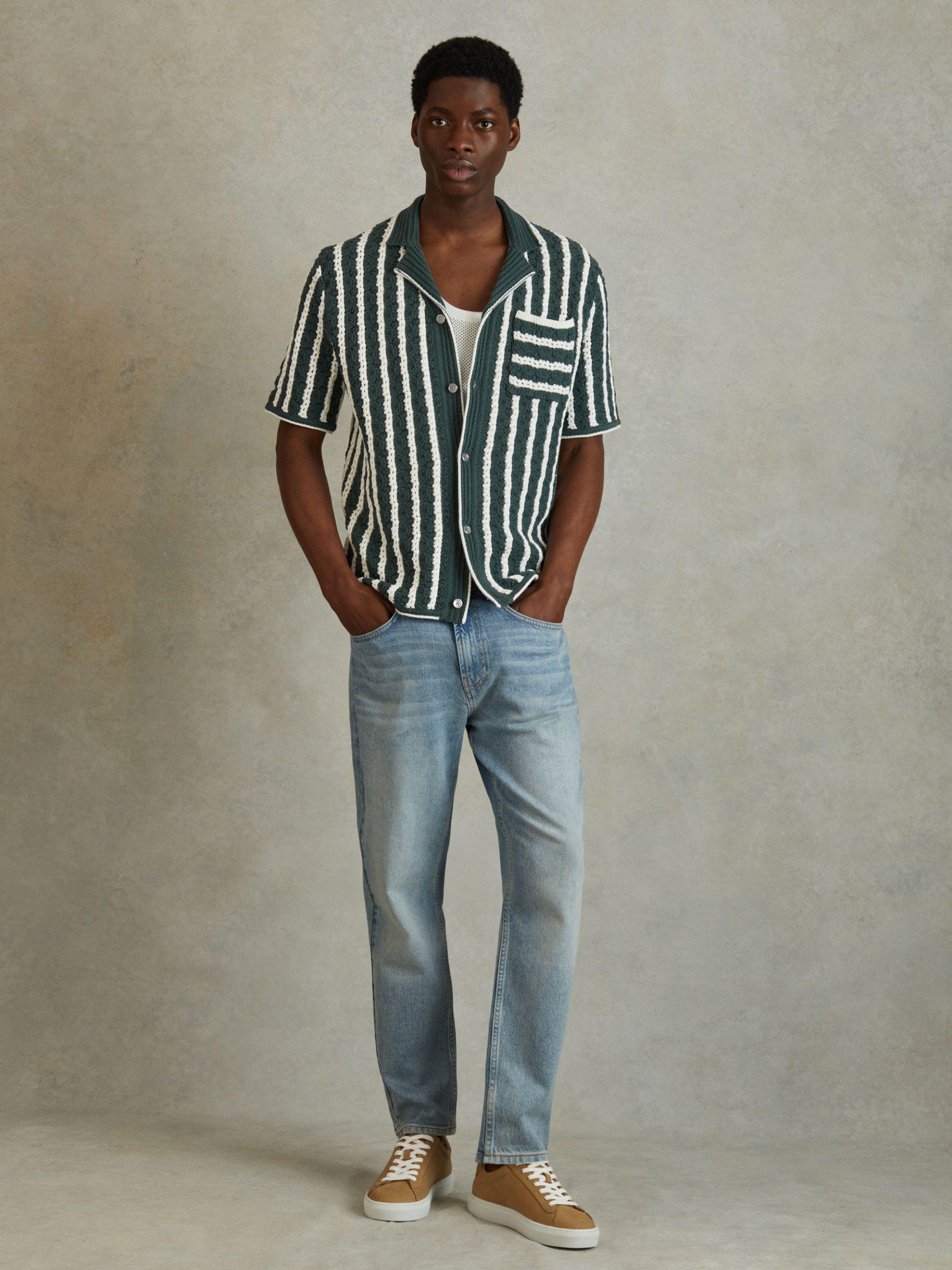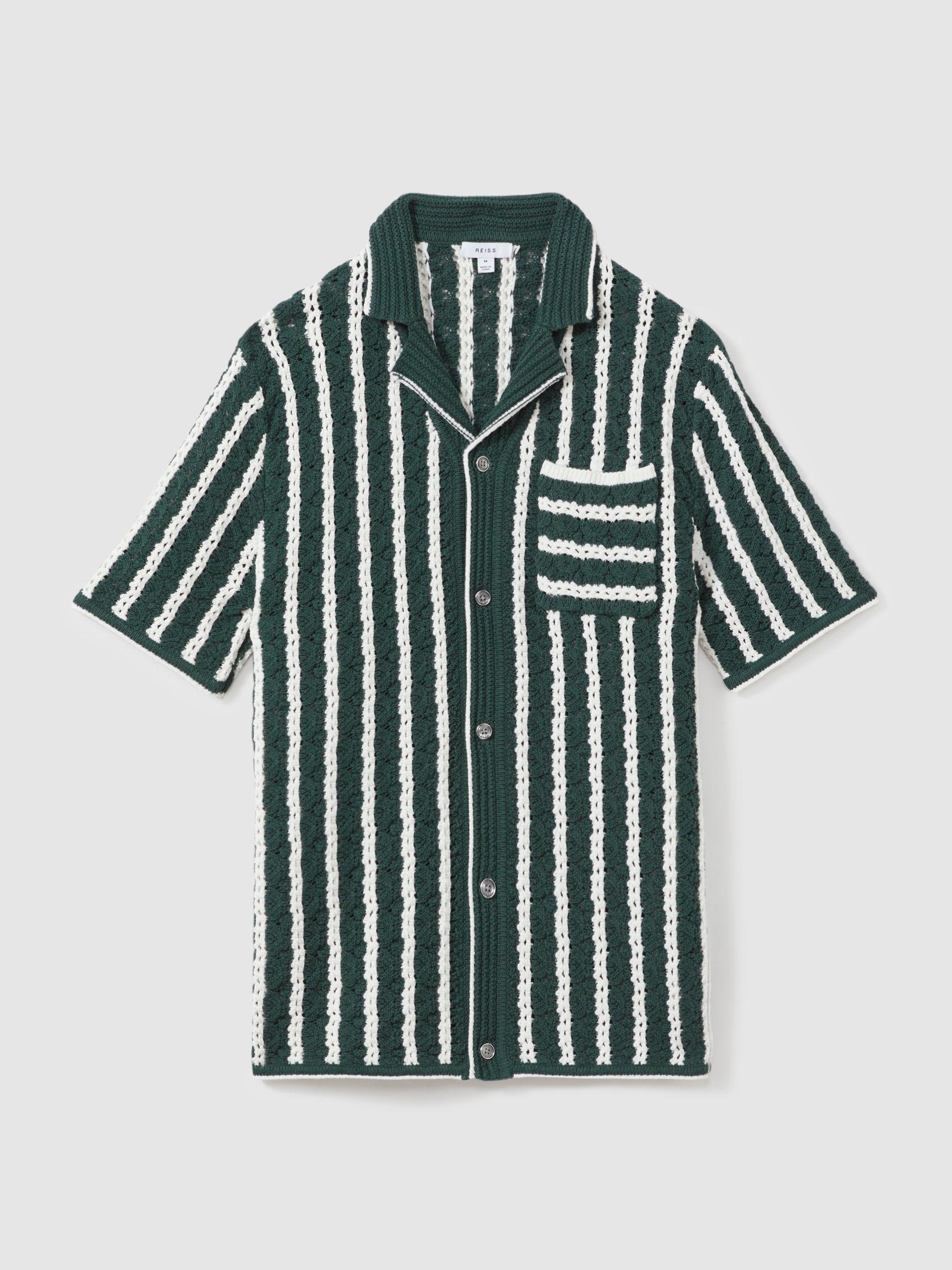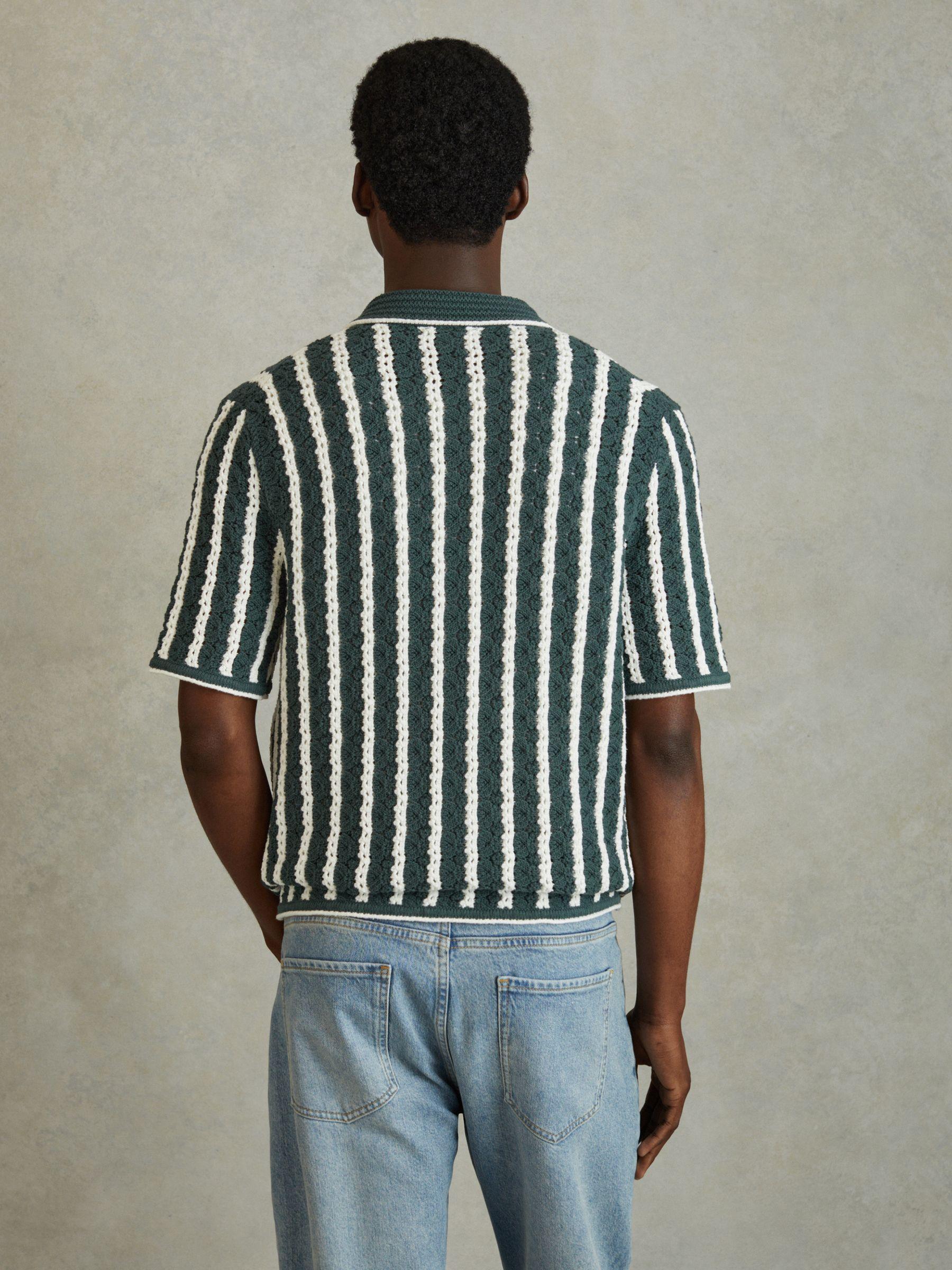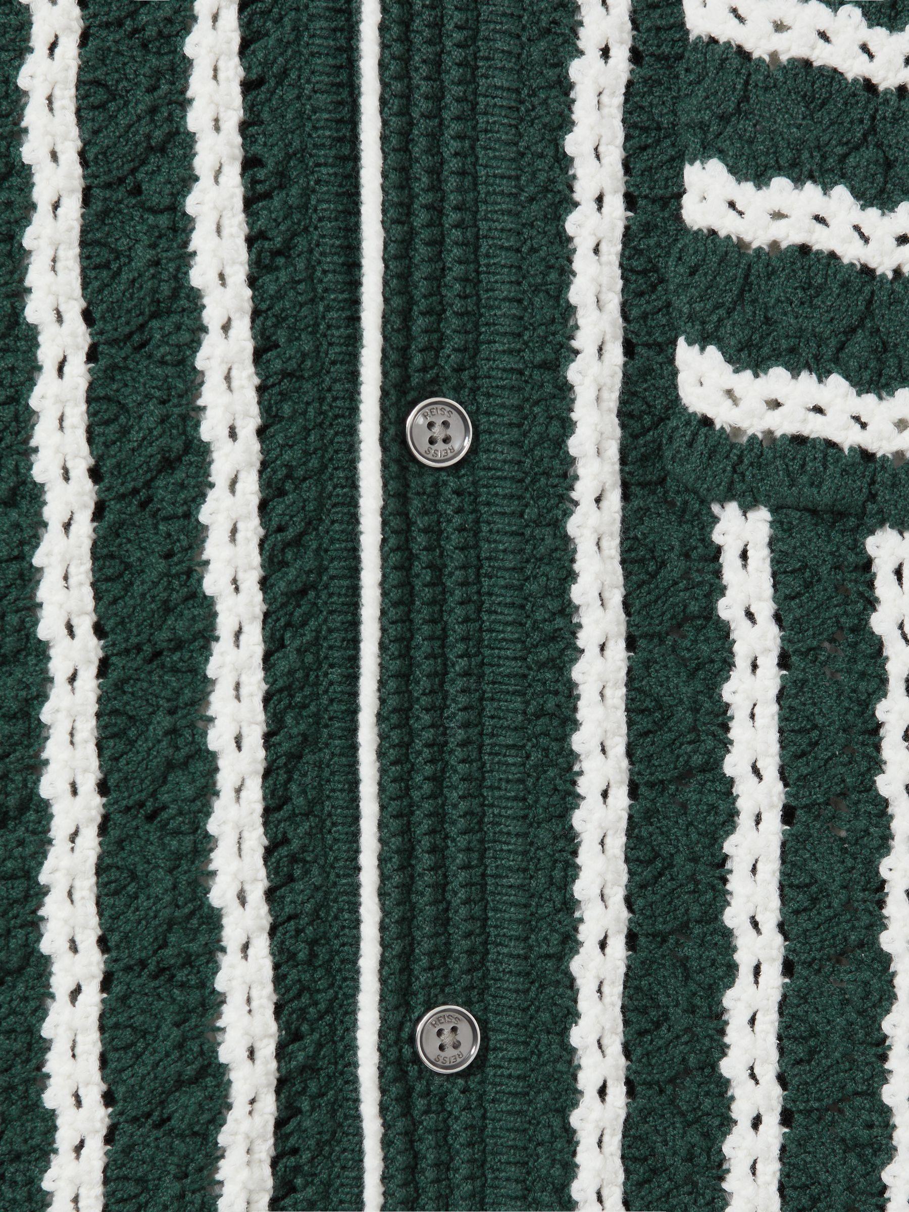 The Spritz shirt is crocheted with a premium thick handle into a striped design. Its Cuban collar neckline leads to a button-front closure and its oversized shape hangs off the body. Cotton blend. Crochet construction. Striped Cuban collar. Button-front closure. Oversized fit. The model is wearing a size M. Measurements of model: Height 6ft1 / 187cm.