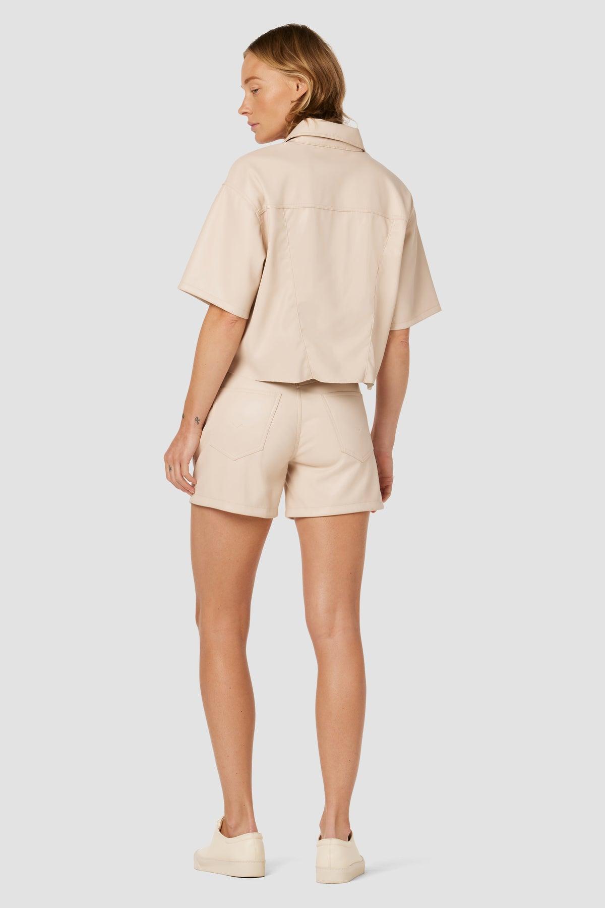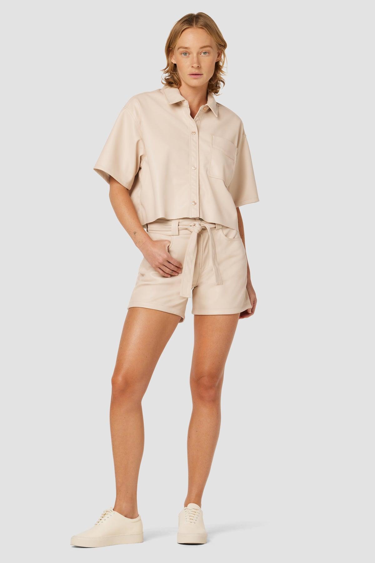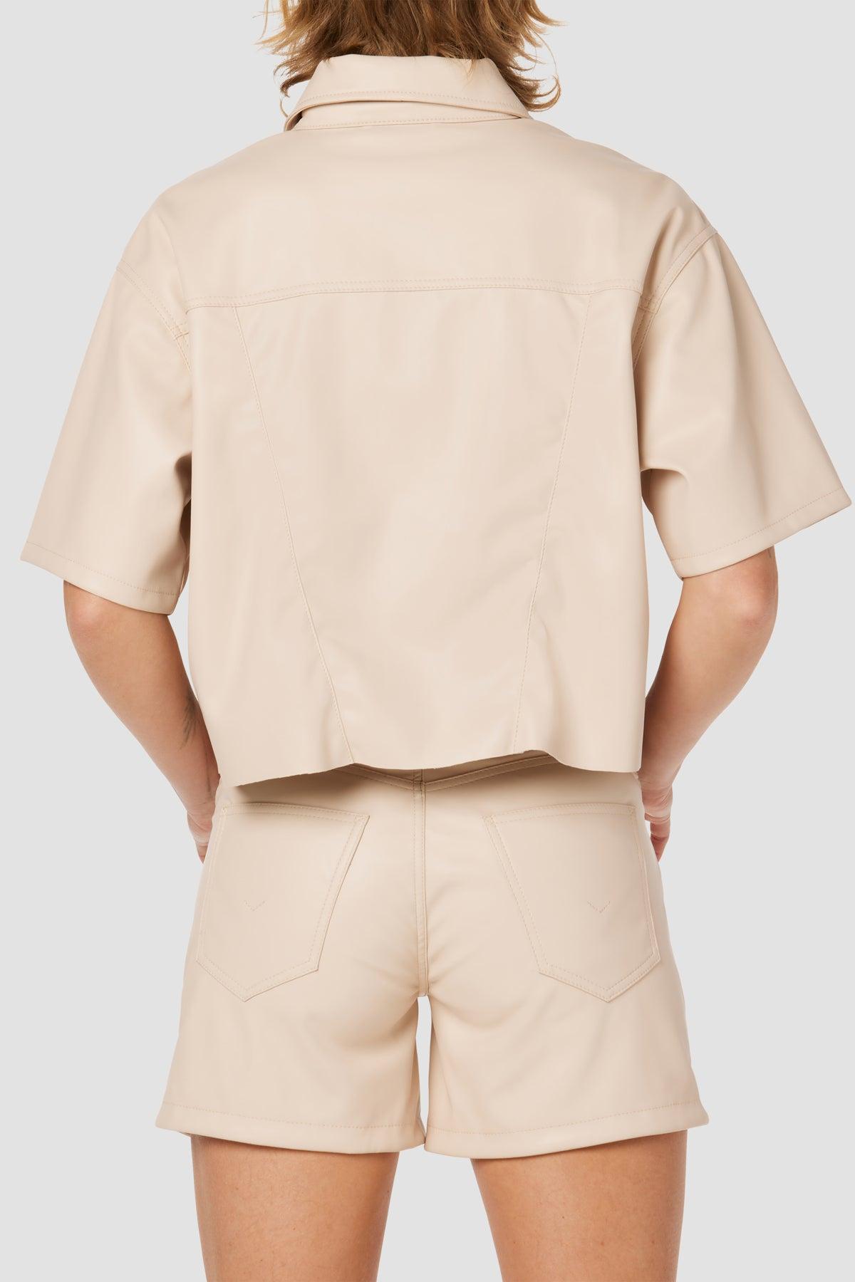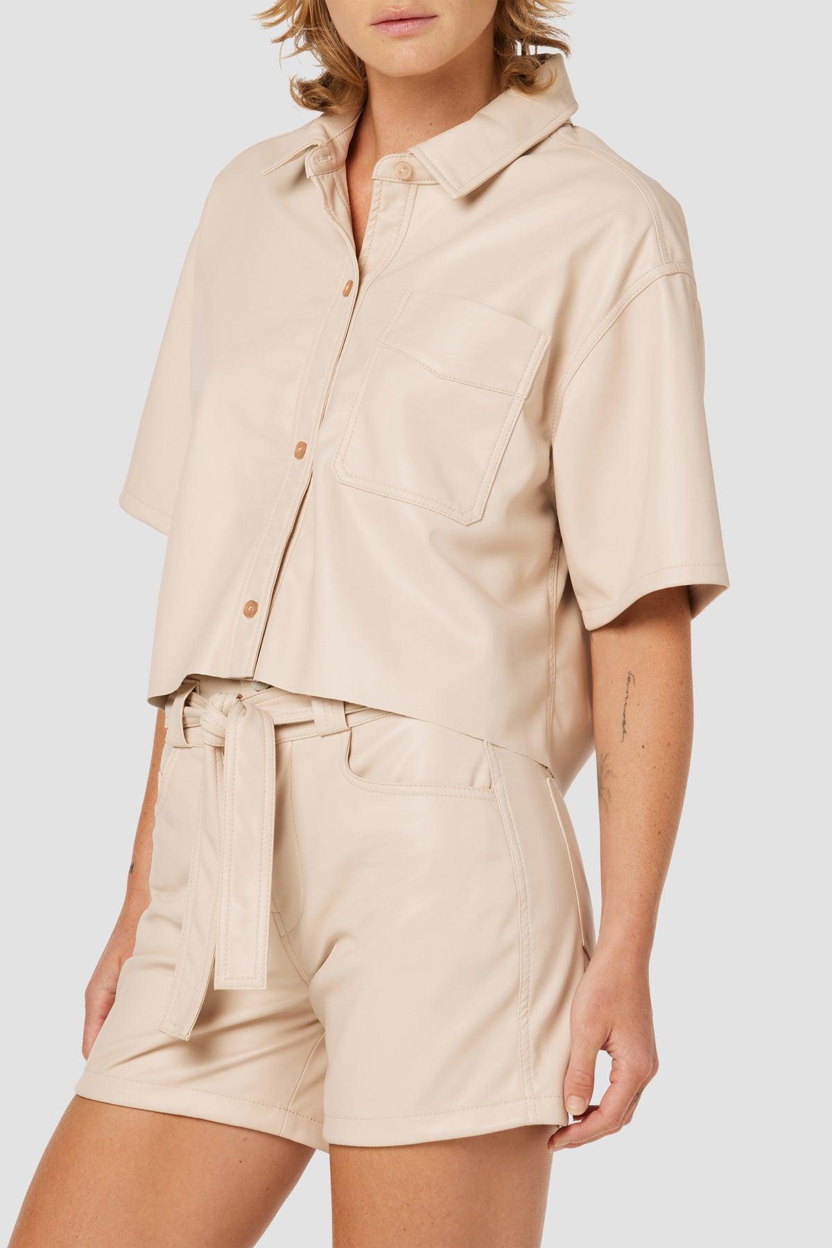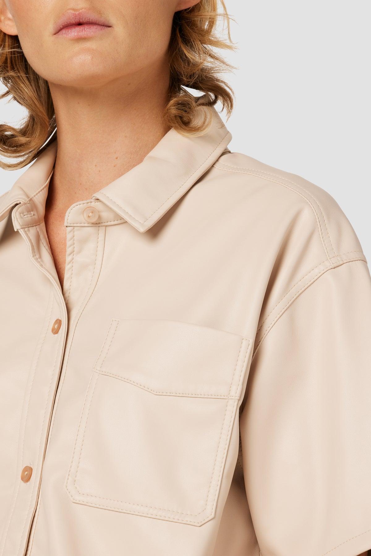 Description Our Oversized Cropped Button Down Shirt in Shell is crafted from our Illusion Leather - a luxe vegan leather. The short sleeve top is finished with a raw hem that's cropped just enough. Product Details Body Length: 20.5", Chest: 44", Sleeve Length: 9"Model Height 5’9"Model wearing size SMeasurements based on size S Fit & Care Content: 100% PU Face, 100% Polyester BackMachine wash cold with like colorsDo not bleachTumble dry low or hang to dry