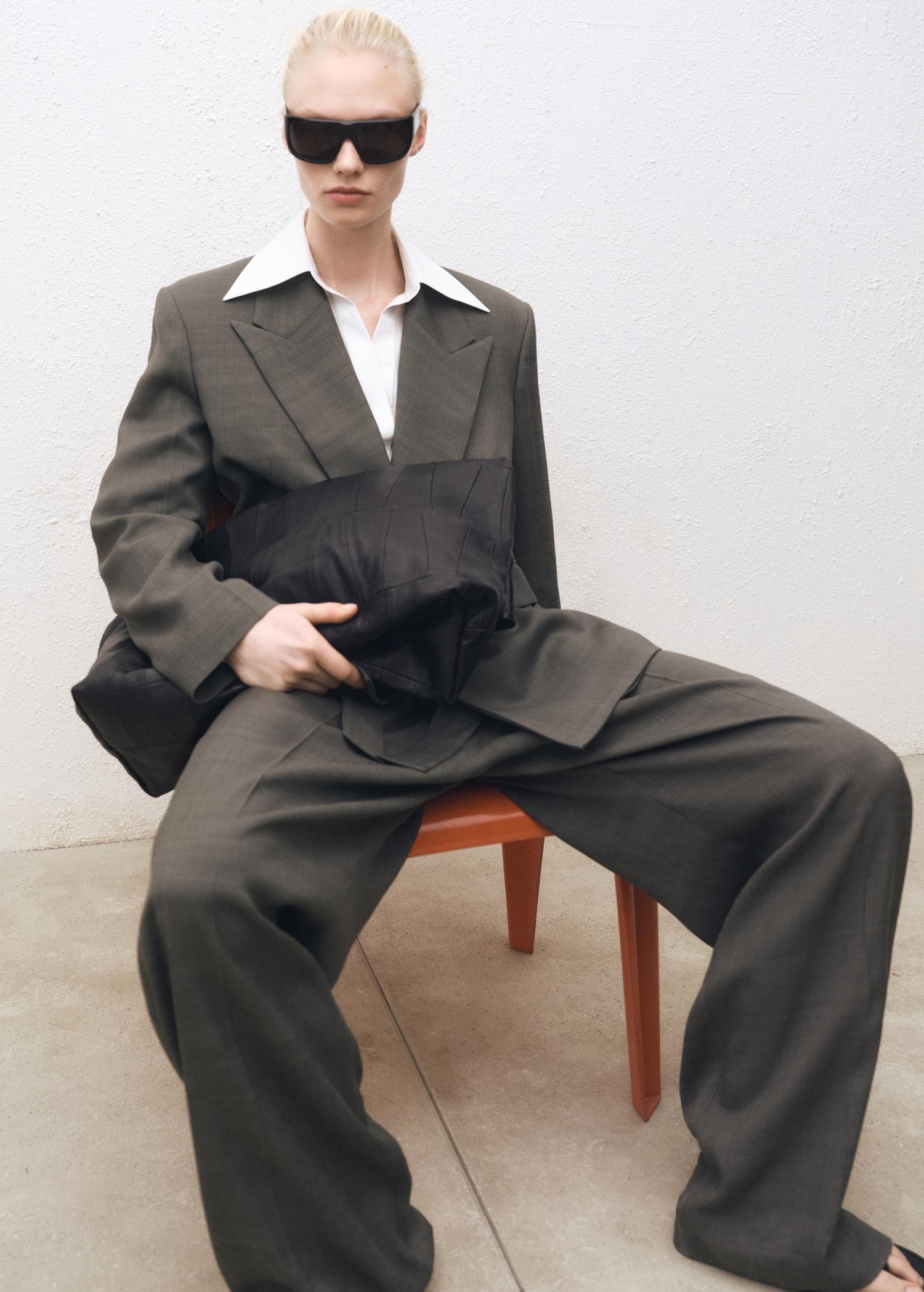 Viscose fabric. Straight design. Oversize design. Structured design. Crossover design. Lapel-collar V-neck collar. Lapel with notch. Long sleeve. Two pockets with flaps on the front. The ecru color has a total look. Inner lining. Co-ord. Selection Collection. A selection of refined garments, made with quality materials to create a feminine and contemporary closet for special occasions.