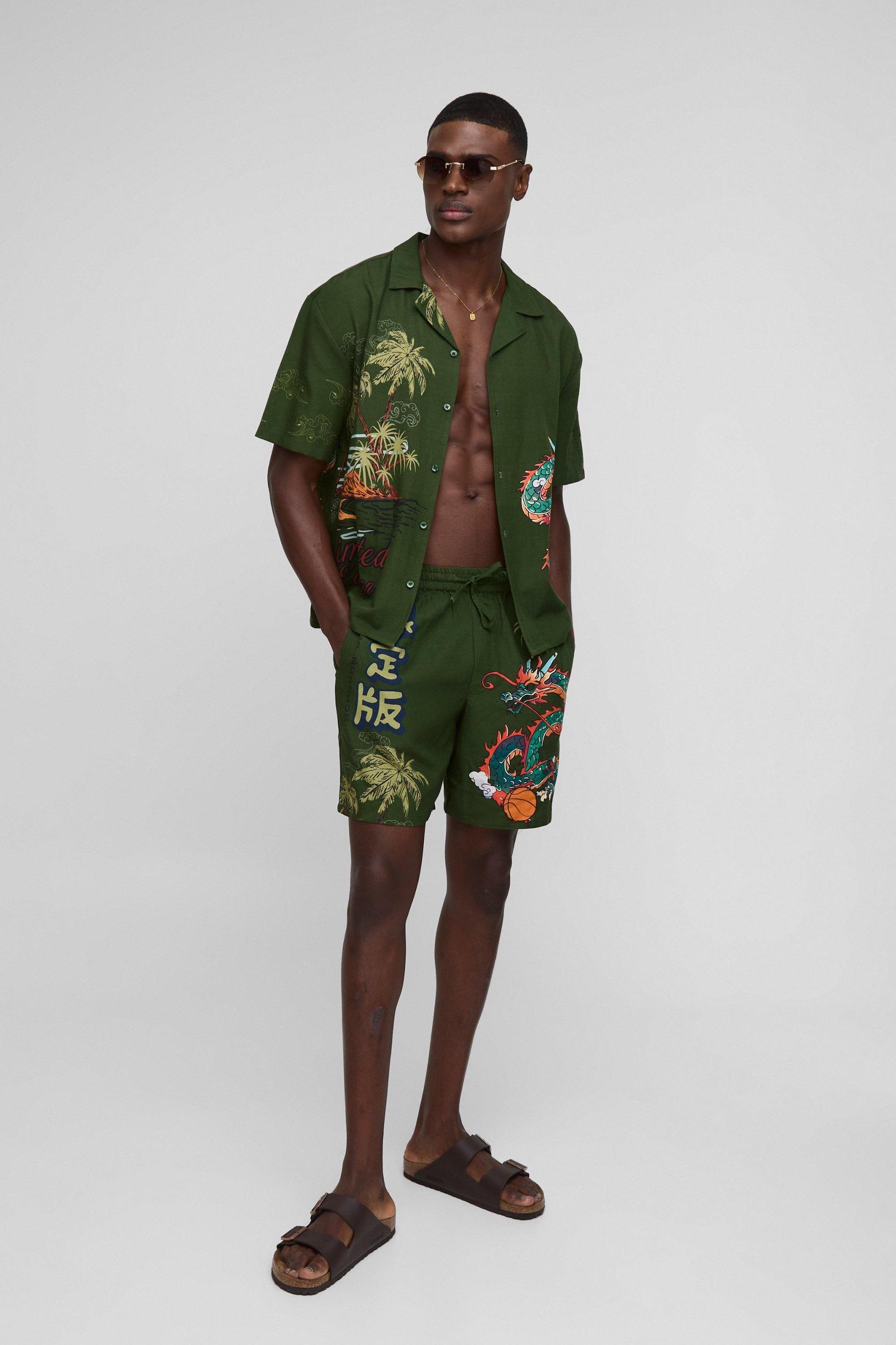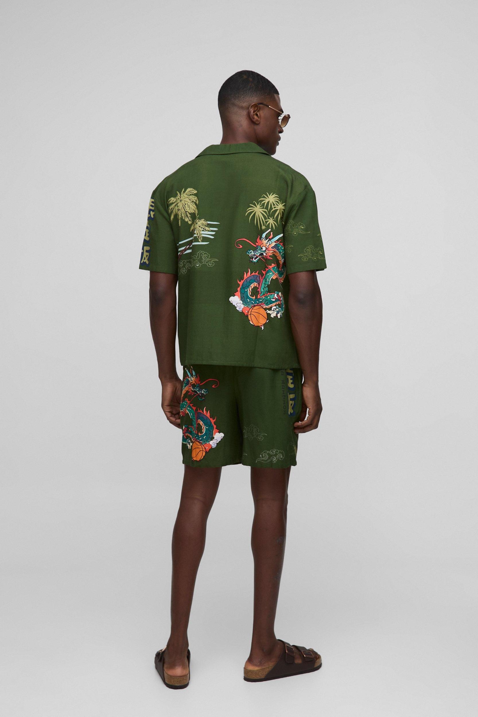Oversized Dragon Print Linen Look Shirt & Short Set | boohooMAN USA