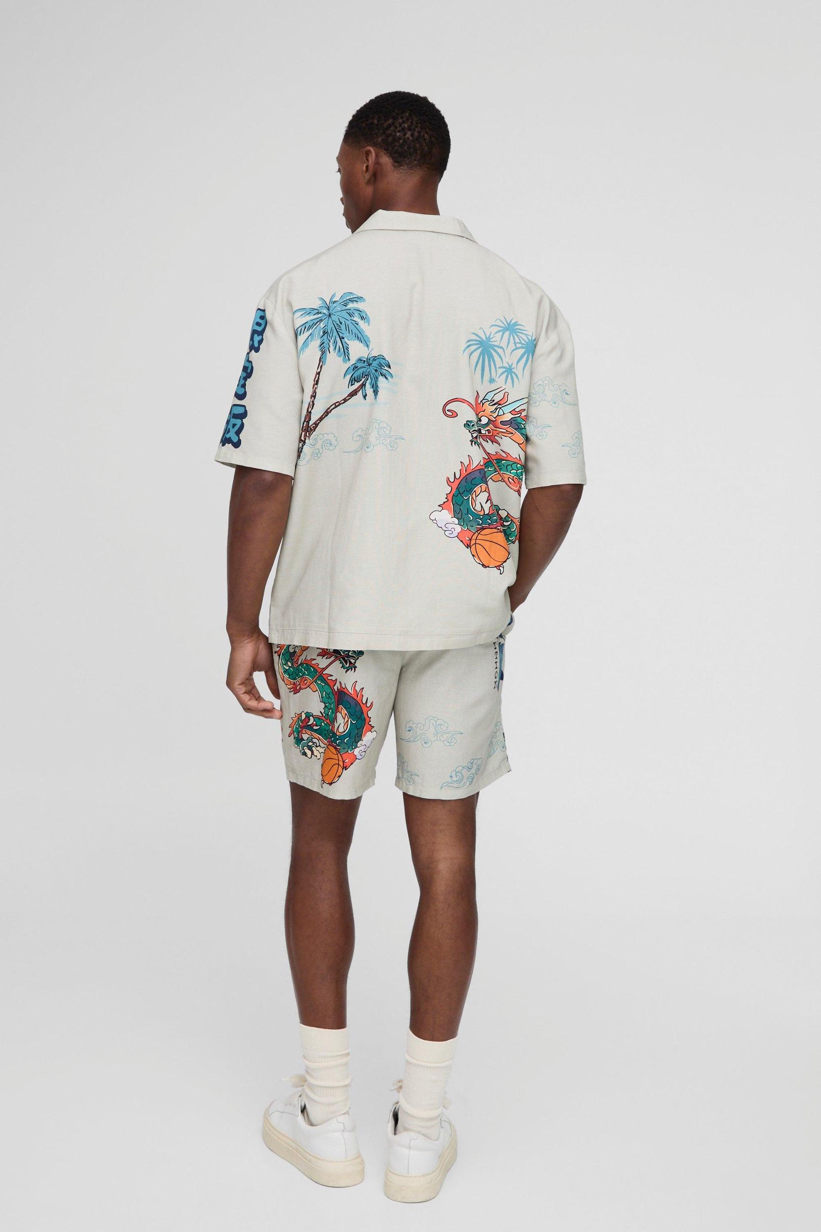 Let your personality shine in a printed set. Sick of blending with the crowd? Time to let out your inner geek out with a printed sets from boohooMAN. We've got every colour and pattern for expressing even the wildest personalities, from more subtle block colours with printed hems to bold florals and bright paisleys. Grab all your faves in shirts, tees, shorts and pants and add a few neutrals so you've got a fresh 'fit for every occasion. Whether that's a pool party with the fam, a day session with the crew or drinks round the fire at night, with a printed sets from our men's matching sets range, you can always be yourself. Style: Shirt & Shorts SetDesign: DragonFabric: Linen LookDetail: OversizedNeckline: RevereSleeve Length: Short Sleeve