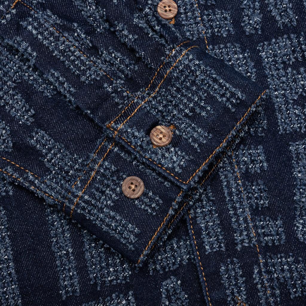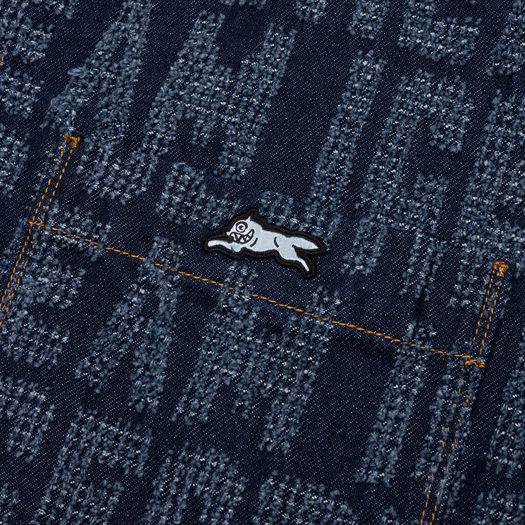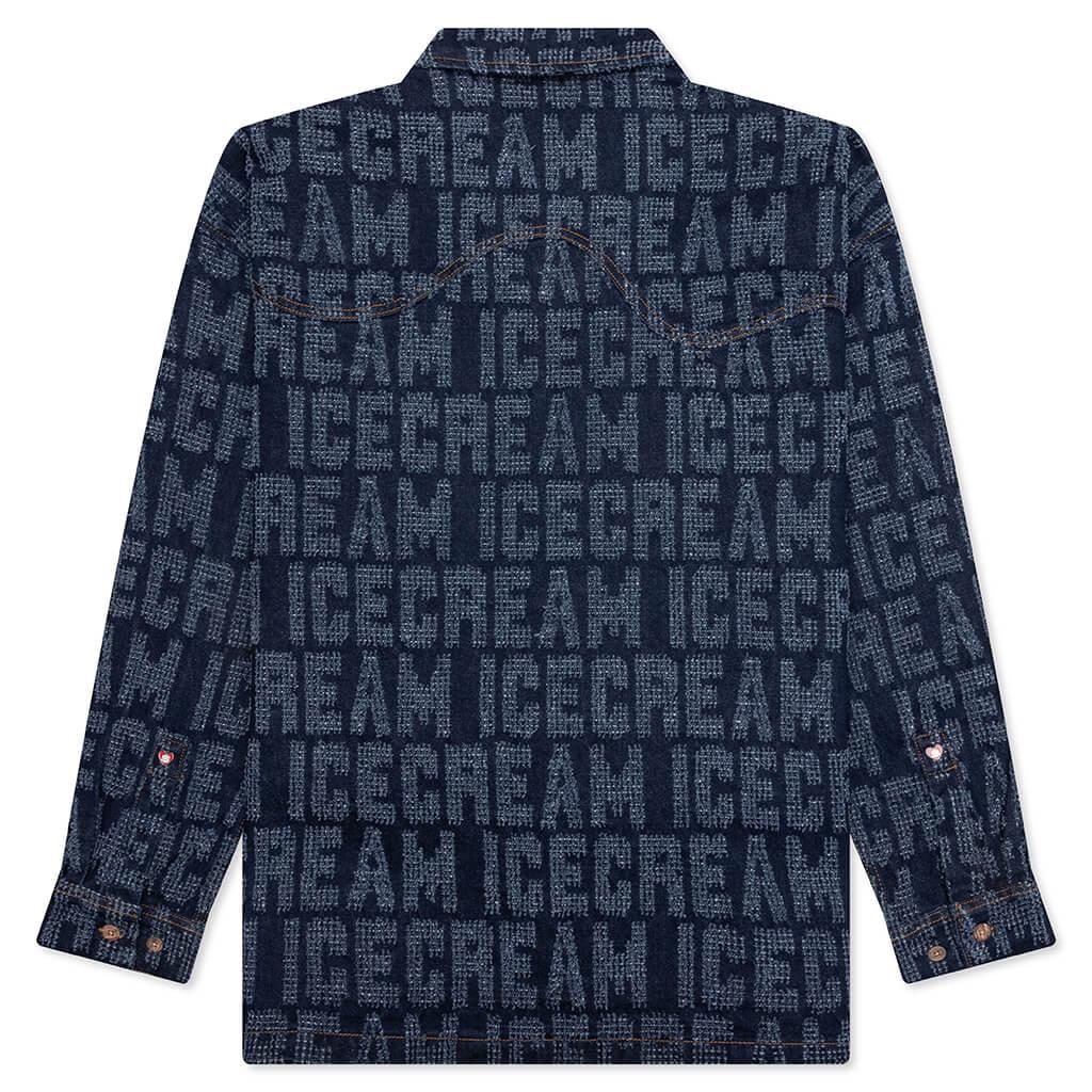 The Oversized Echo L/S Shirt reimagines a classic denim silhouette with bold design details. Crafted from 100% cotton denim, this shirt features an oversized fit and a striking jacquard ICECREAM text repeat pattern throughout. A spread collar, button-up closure, and oversized chest pockets enhance its utilitarian aesthetic, while a woven label tag adds a subtle finishing touch. A standout piece that blends statement-making style with everyday versatility. 100% Cotton denim Oversized fit Repeat ICECREAM text jacquard design Spread collar Button up closure Oversized chest pockets Woven label tag Style No: 441-8400-324 441 8400 BLUE