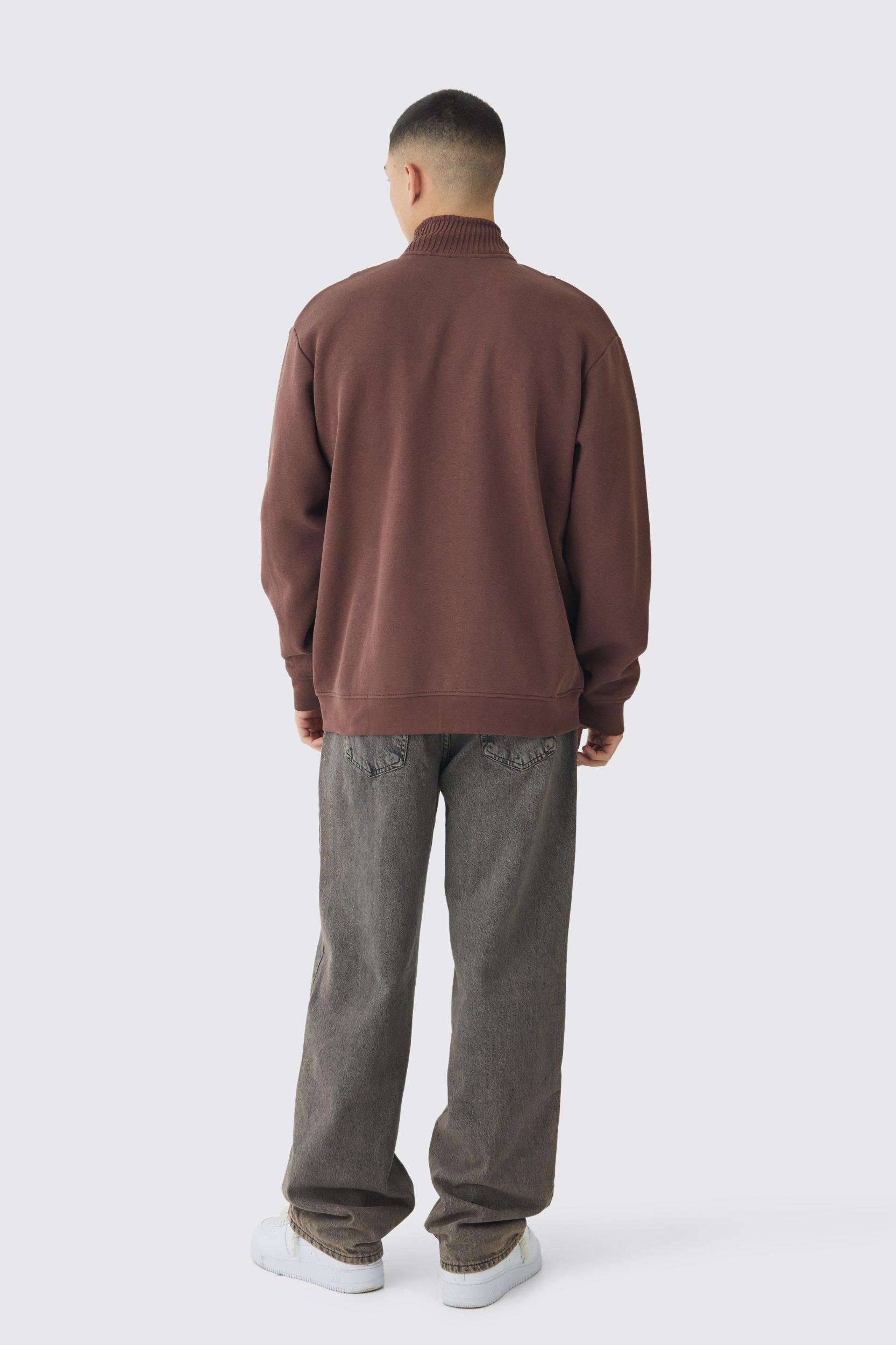 A go-to top layer for every day of the week. Need a wardrobe staple that's versatile and reliable? A basic sweatshirt is the ultimate easy layer for warmth, comfort and style. Snuggle up with tracksuit sweatpants for a lazy Sunday in, or level up your casual 'fit by pairing a plain polo with baggy jeans and sneakers, perfect for Saturday afternoon spectating. Or if you're out to impress, try a sleek maroon sweater with pleated pants, dark overcoat and black Chelsea shoes. Whatever your style, with a few plain sweatshirts in different colours you'll always have a stylish top layer ready to go. Style: Plain SweatshirtDesign: PlainFabric: BrushbackDetail: ZipsLength: RegularNeckline: Funnel NeckSleeve Length: Long Sleeve