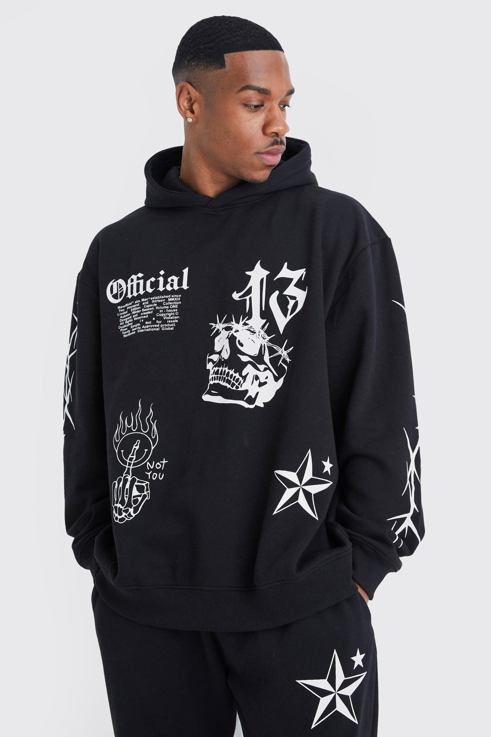 Mens Black Oversized Graffiti Gusset Hooded Tracksuit - Give your tracksuits a permanent wardrobe residency. Sometimes theres no stronger look than a full tracksuit and why would you get about in anything less than total comfort? Our mens tracksuits are designed to give you a multi-purpose look which is both casual & comfortable. Whether its black, white, red, grey, skinny fit or regular, weve got tracksuits to box your activewear look off. Pair your tracksuits with white trainers or an oversized t-shirt for a completely clean laid-back look. Style: Hooded TracksuitDesign: GraphicFabric: BrushbackLength: RegularNeckline: HoodedSleeve Length: Long Sleeve