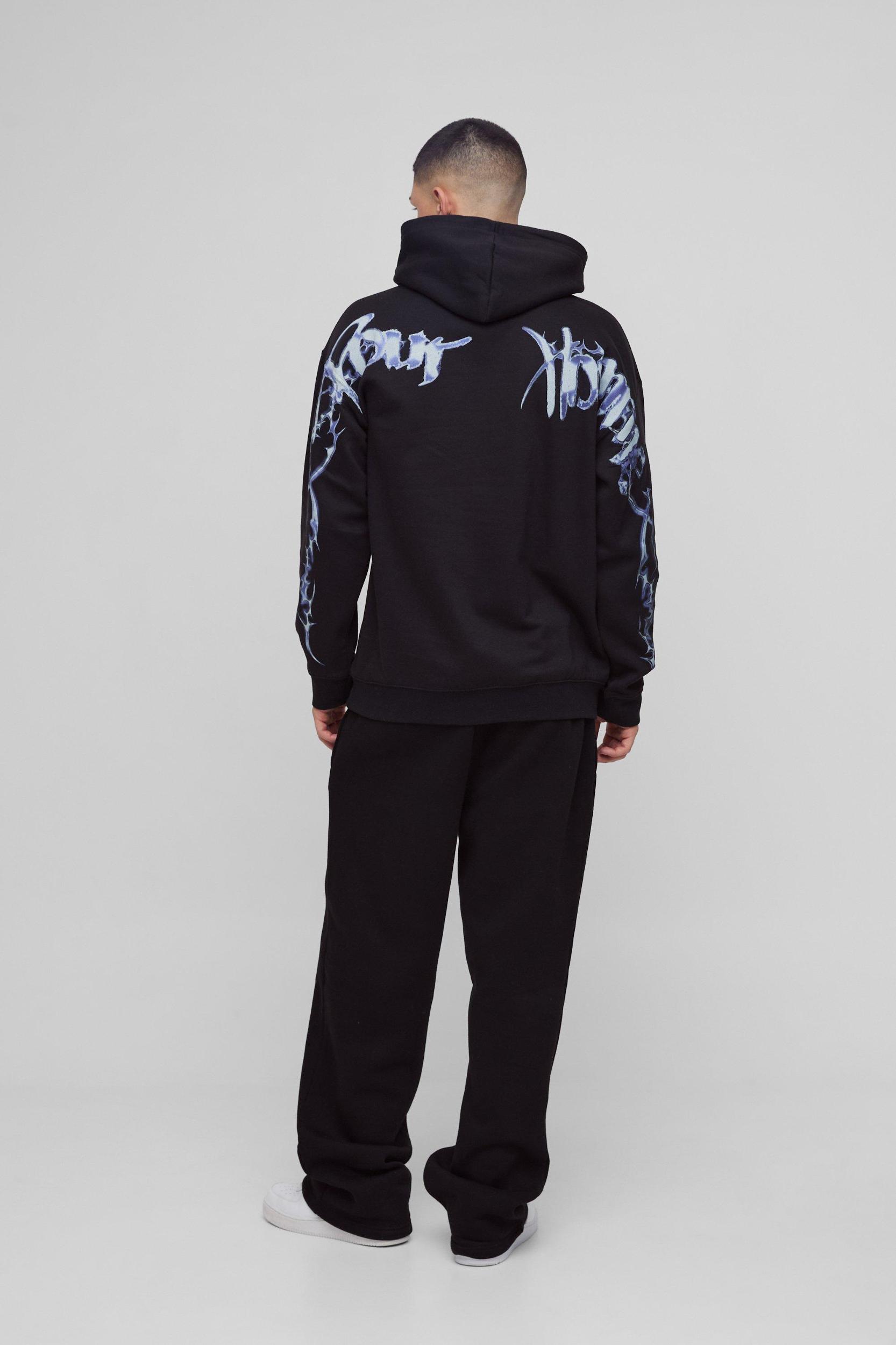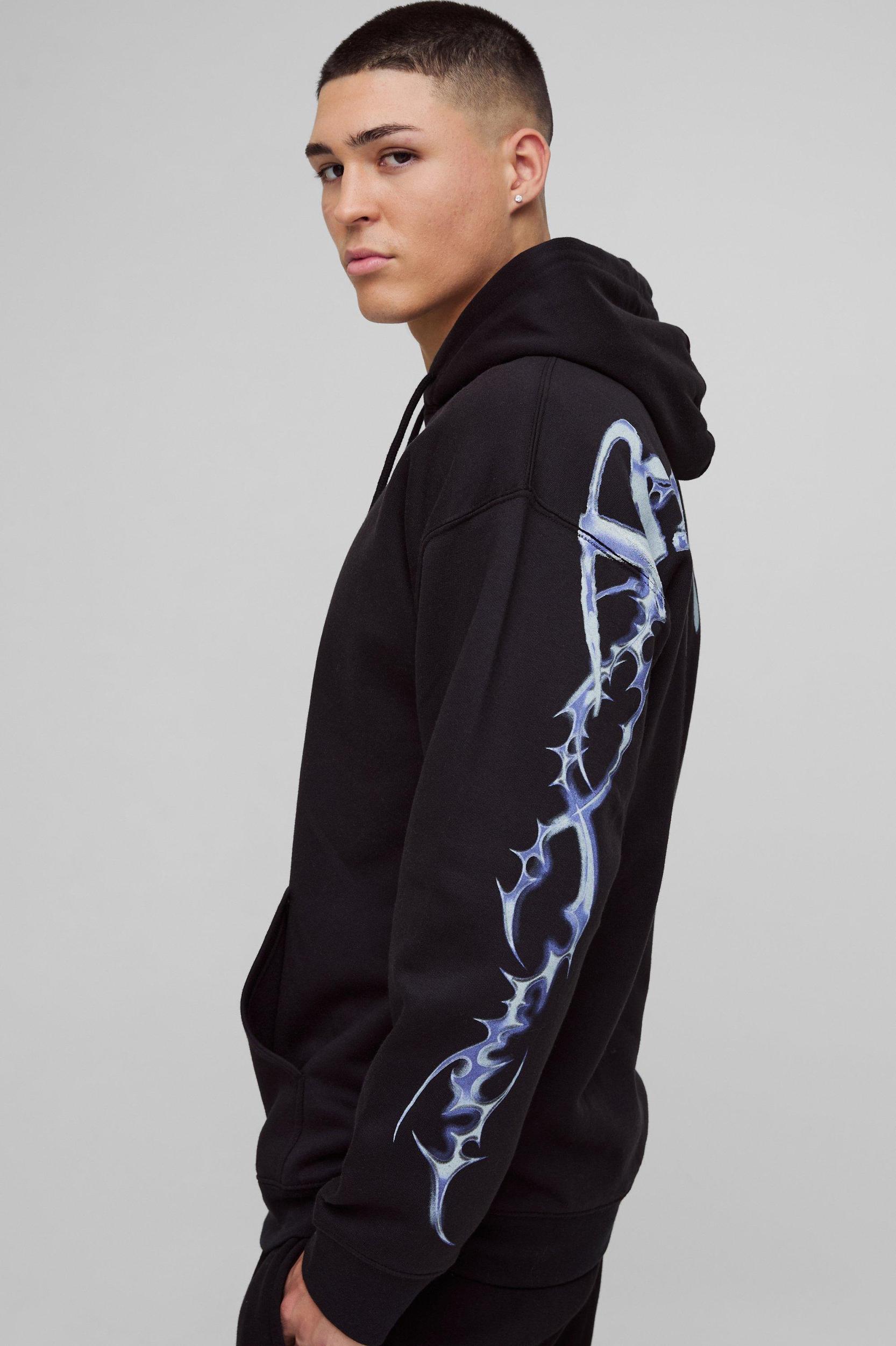 Mens Black Oversized Over Seams Gothic Graphic Hoodie - Layer up with an oversized hoodie. Who says you have to choose between style and comfort? With clean lines and plenty of room for extra layers, an oversized hoodie will finish off your fit and keep you warm any time of year. Pair a bold print with black cargos and trainers for an effortlessly chill street look, or colour match your hoodie with comfy joggers to hit the gym in style. Mix and match your favourite statement tees with two or three zip up hoodies in block colours and youll have endless combos to last you all season. change