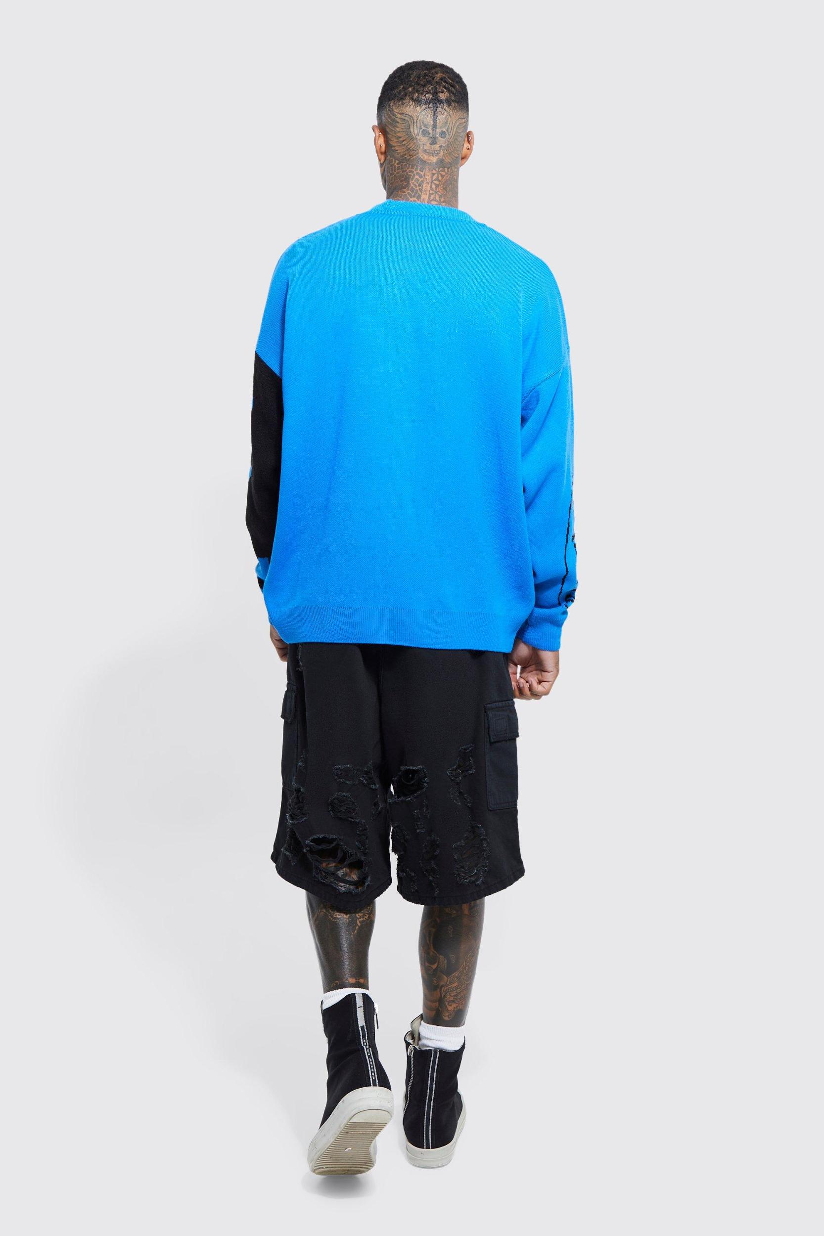 Mens Blue Oversized Portrait Text Knitted Jumper - Layer up and look good in a jumper from the boohooMAN collection. Fashions all about the finishing touches and jumpers and cardigans are the easiest way to fix up your look. Keep it cool in cable knits, work it in waffle or do the finer details in a fisherman. Show off your style in a sharp shirt and shawl cardigan combo, finish off with brogues and youll be up there with fashions finest.Style: JumperDesign: JacquardFabric: AcrylicLength: RegularNeckline: CrewSleeve Length: Long Sleeve