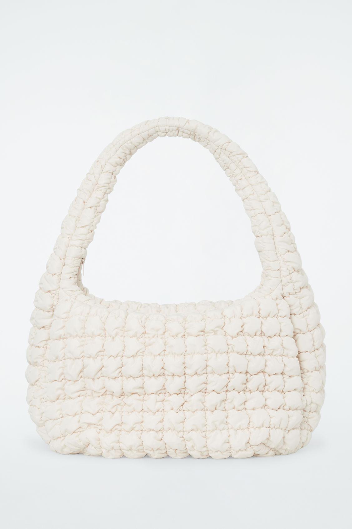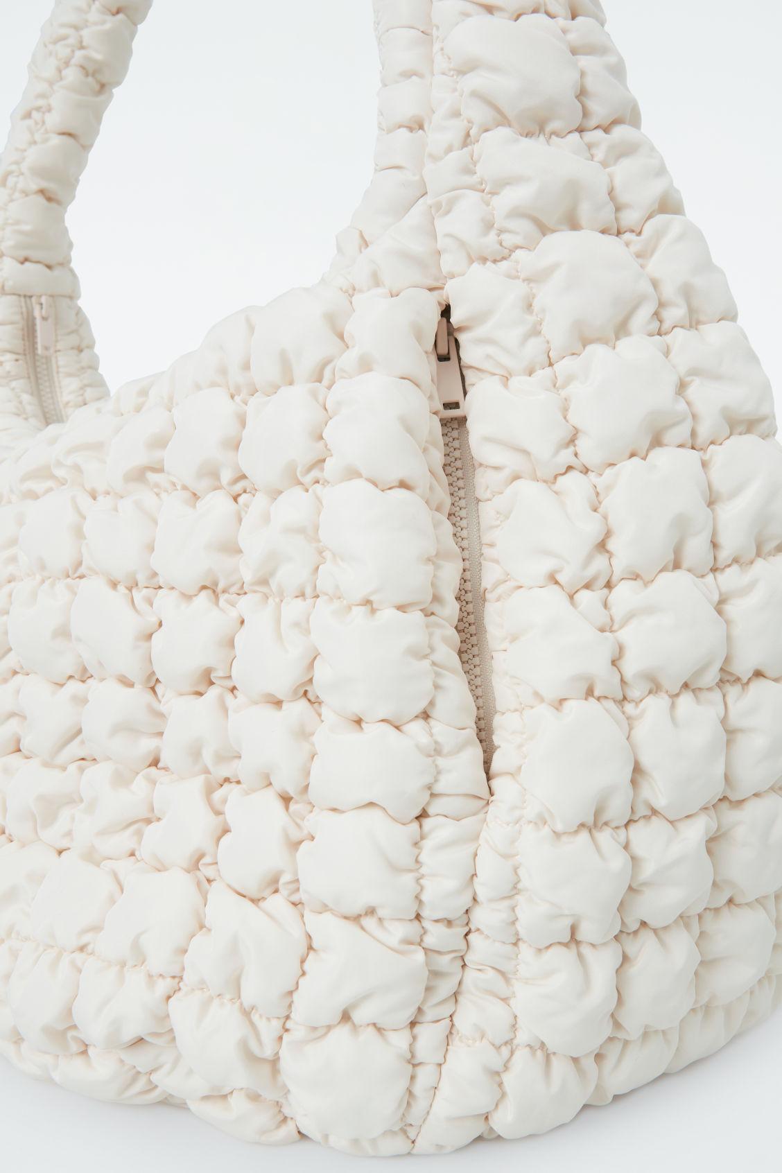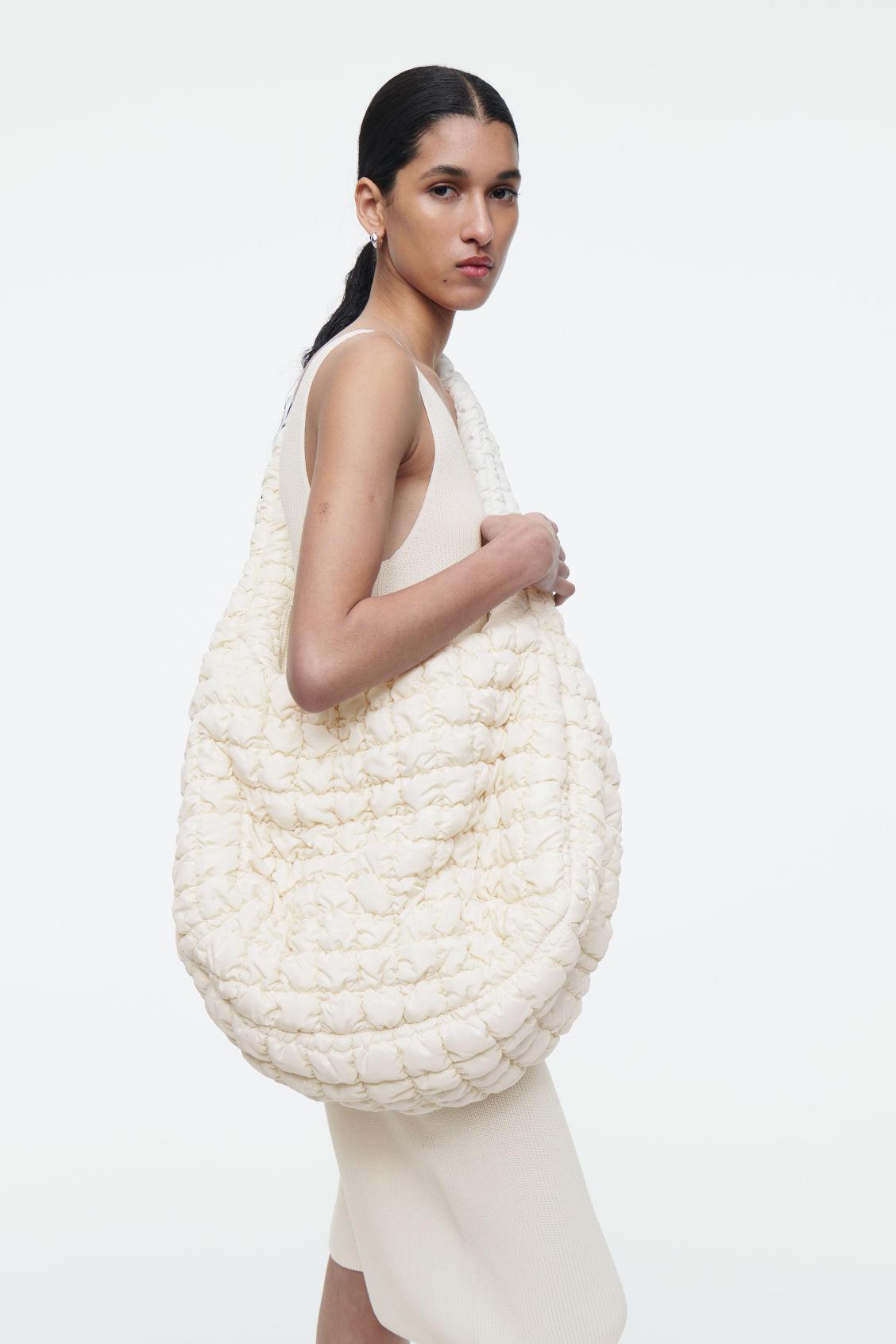 The quilted bag is a cornerstone of the COS collection. Designed to be slung across the body or worn on your shoulder, this oversized version has enough room for everything you need for an overnight stay, and then some. It's crafted from recycled polyester in the signature pillowy texture and offered in an enduring light-beige shade. Zip closureA better alternative to conventional polyester, recycled polyester is made from pre‐ and post‐consumer waste Shell: 100% Recycled polyester. Lining: 100% Cotton. Excluding trims Dimensions: 9.25" x 9.44" x 3.34"