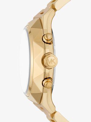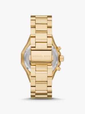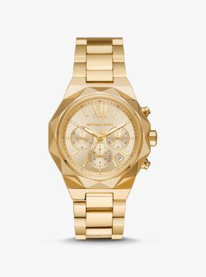A perfect statement piece for any occasion, the Michael Kors MK4690 - Raquel Chronograph Stainless Steel Watch gives that ideal glam to your stunning look. Chronograph watch featuring stainless steel case with a unique multi-faceted topring. Round analog dial with three-hand movement, three sub-dials, date display between 4 and 5 o'clock positions, roman and rectangular hour markers, and brand name detail. Stainless steel bracelet strap with two pusher foldover clasp. Water-resistant up to 50 meters. Presentation box included. Made in Japan. Measurements: Case Diameter: 41 mm.