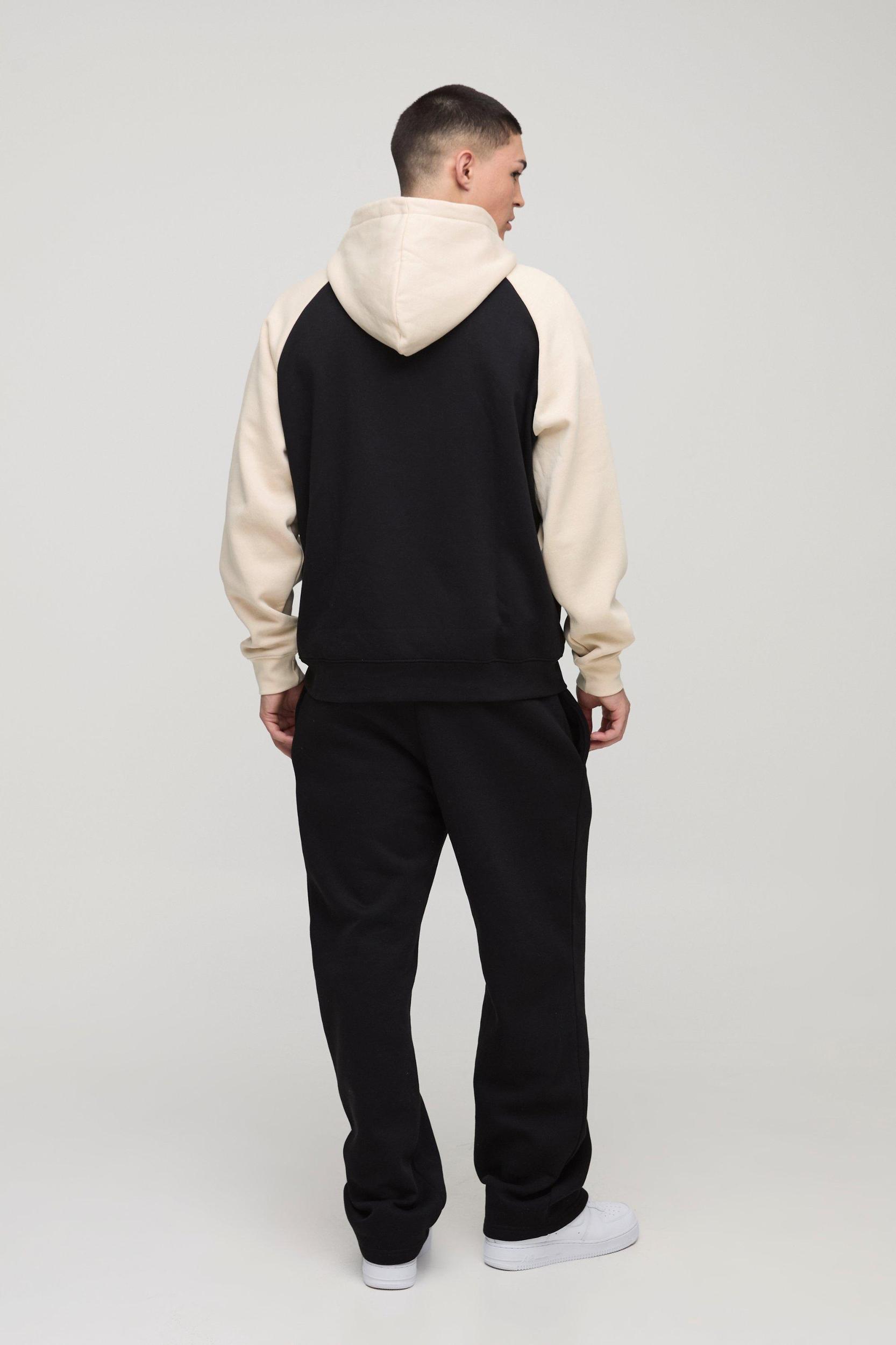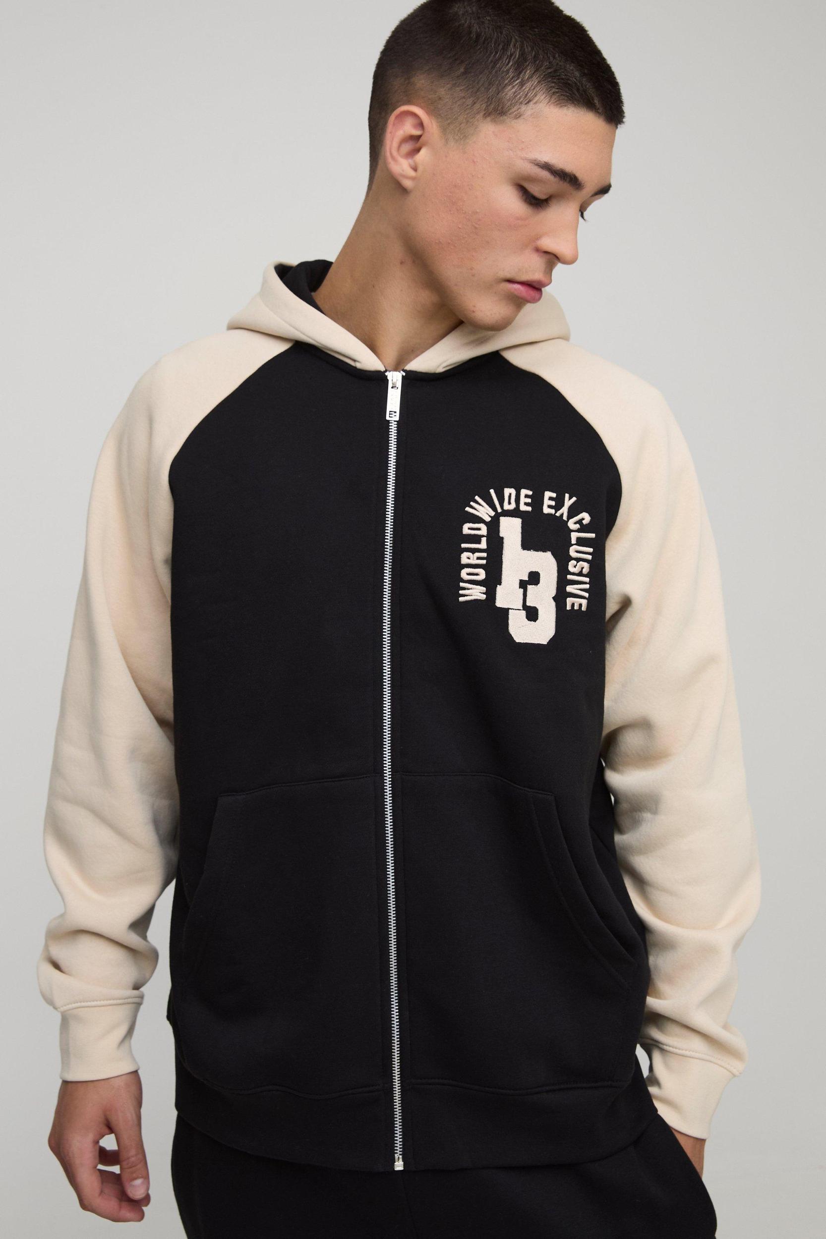Mens Black Oversized Varsity Raglan Zip Hooded Tracksuit - Create cool combos with hooded tracksuits from boohooMAN. Mix and match shapes and colours with this uber-stylish collection of hooded tracksuits, designed to go from sofa to streets with no extra effort. Show off your lines with a skinny fit set, or pick an oversized hoodie and joggers duo for comfy street casual. With a white tee and trainers you can rock any combo - how about all black for a bold monochrome, long sleeves and shorts for casual summer party vibes or even baby pink or blue for a softer aesthetic. Whichever you choose, with our range of hooded mens tracksuits youll look effortlessly cool both in the gym and out.Style: Printed Long TracksuitDesign: VarsityFabric: BrushbackDetail: Colour BlockLength: RegularNeckline: Hooded Zip ThroughSleeve Length: Long Sleeve