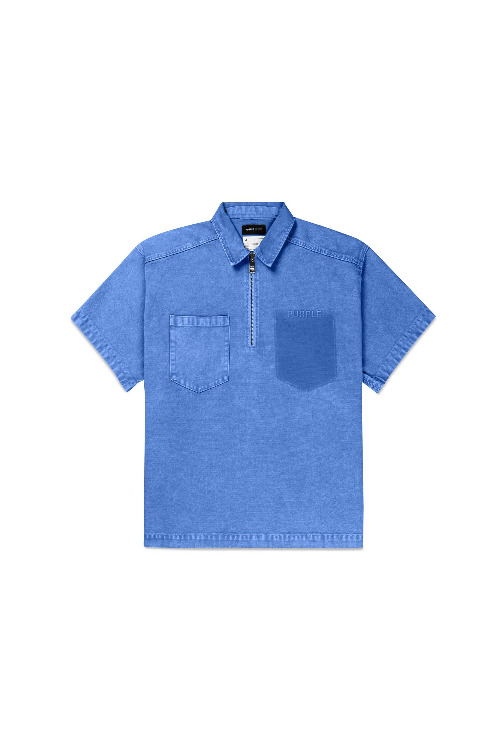 This blue polo is tailored to an oversized fit with a classic collar, a quarter length zip up and, at the chest, a patch pocket as well as a ghosted pocket silhouette. Lightweight Canvas Overdyed Silicone Emboss Logo on Left Chest