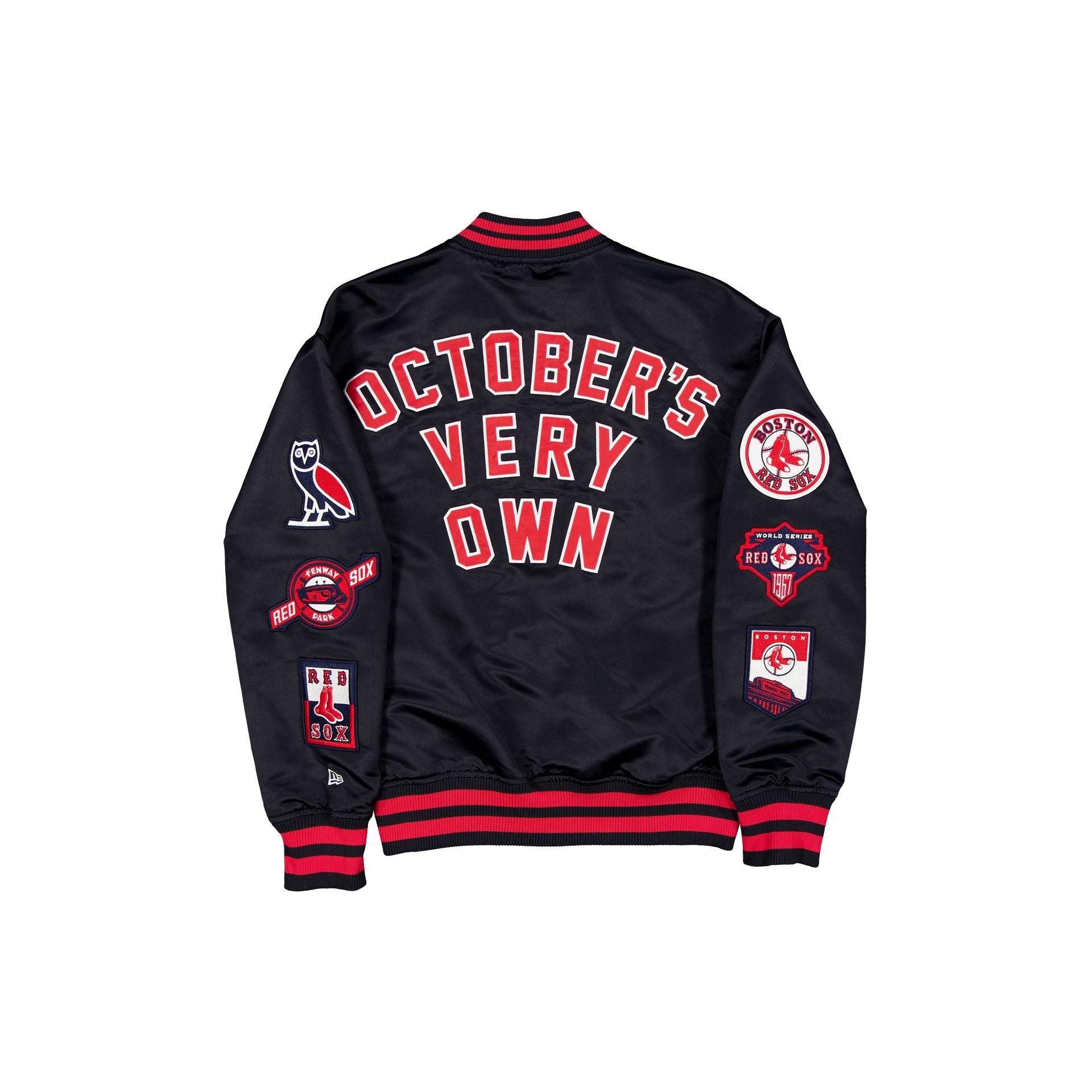 The OVO x Boston Red Sox Jacket features an embroidered satin applique Red Sox wordmark and logo with a snap button closure at the front and an October's Very Own wordmark at the rear. Additional details include alternate team logo patches and a matching OVO logo patch at the sleeves with striped cuffs.Fabric: 100% Polyester