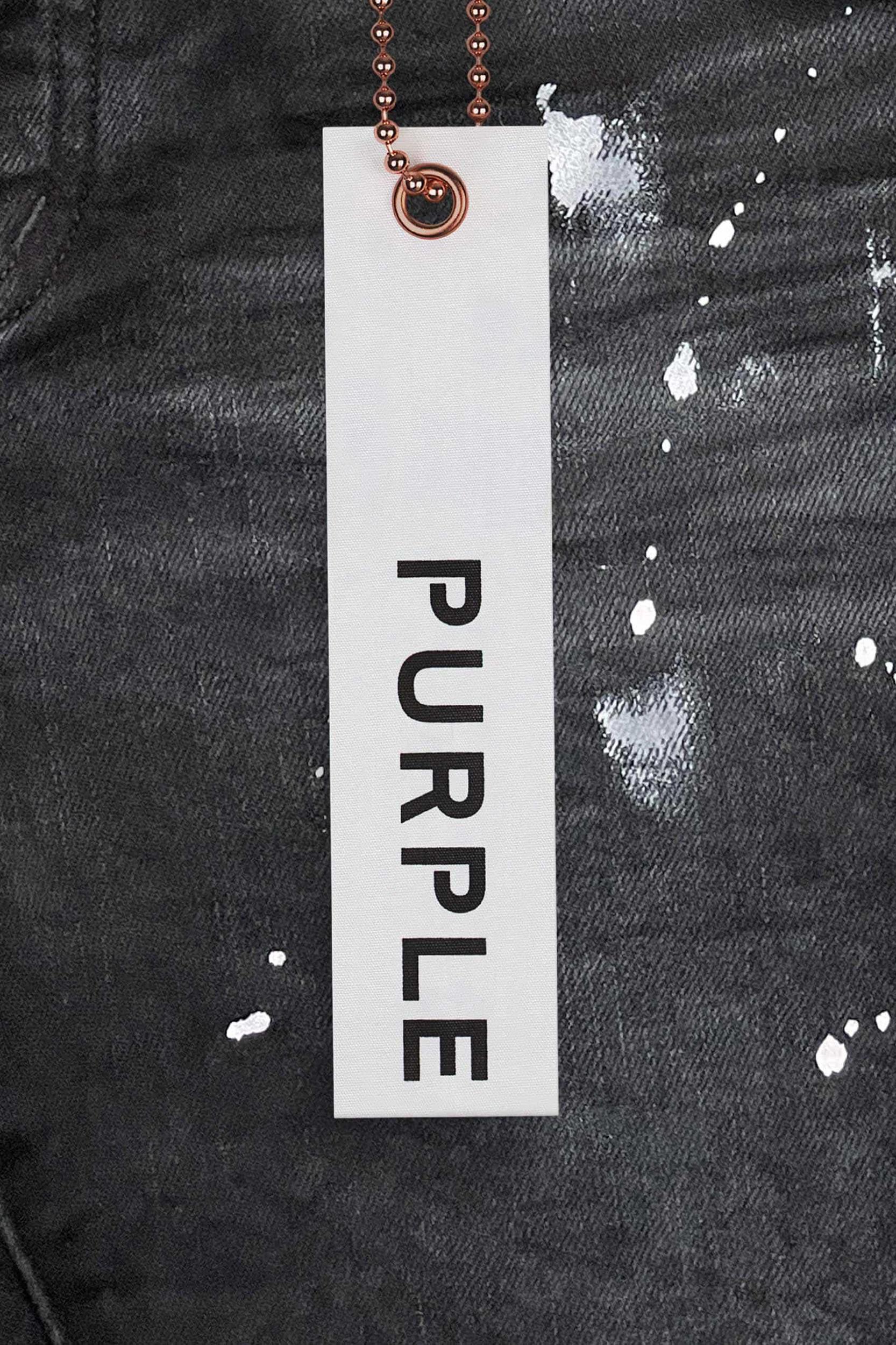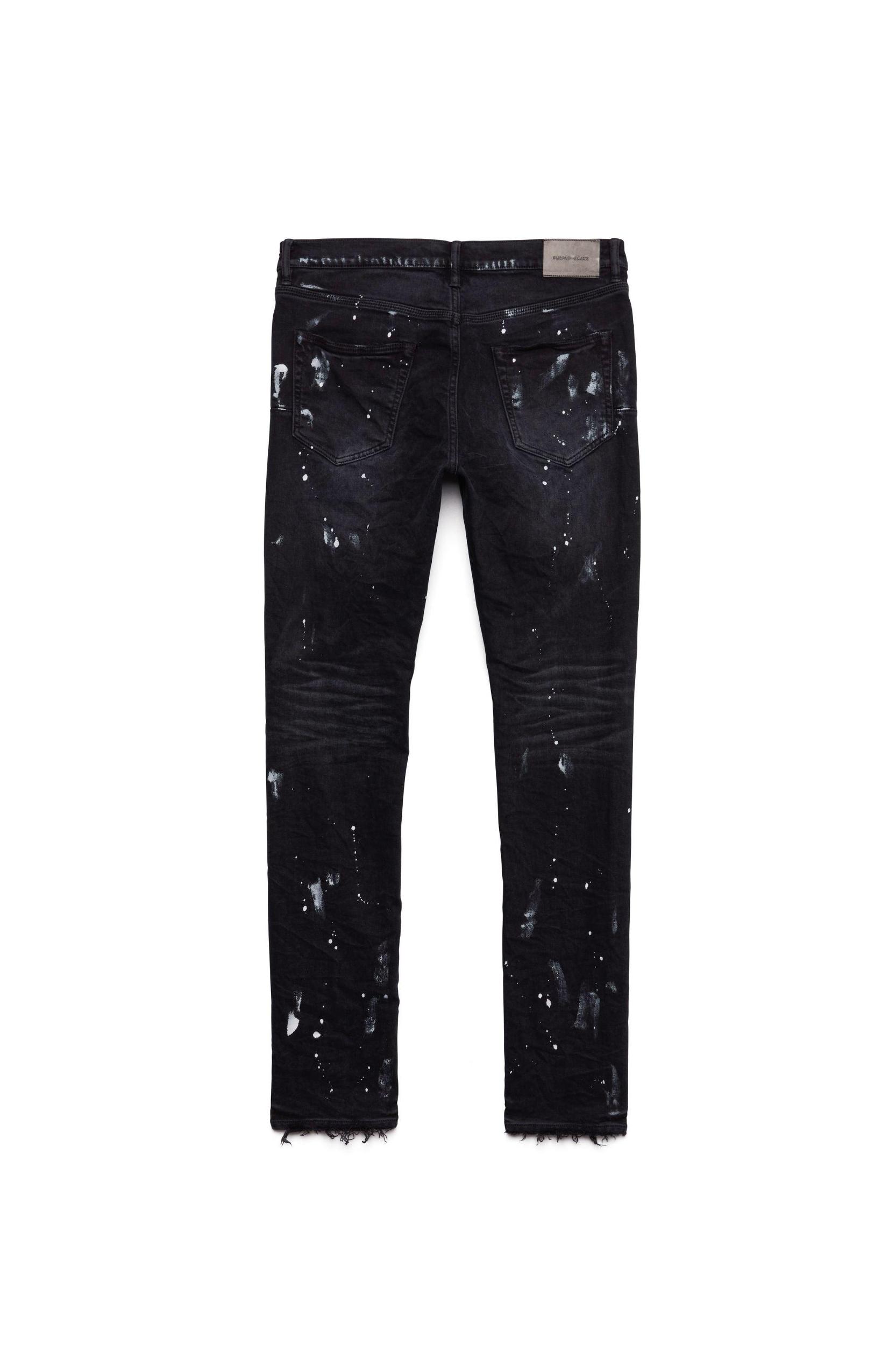 A Purple staple, the P001 low rise skinny is crafted from premium stretch denim and fitted through the thigh to the ankle for a classic taper. This core denim features bar-tack stitching, hidden rivets, a chambray lining and darts at the side seams and back pocket for a more comfortable and enhanced fit. This style is detailed with classic five pocket styling, a button fly closure, a custom Purple cowhide leather patch and signature hang tag branding. Constructed in a dark black wash, this elevated denim is designed with deconstructed slits at the knees, faded detailing, hand-applied paint splatter all over and finished with a innovative resin coating for a custom yet vintage feel.